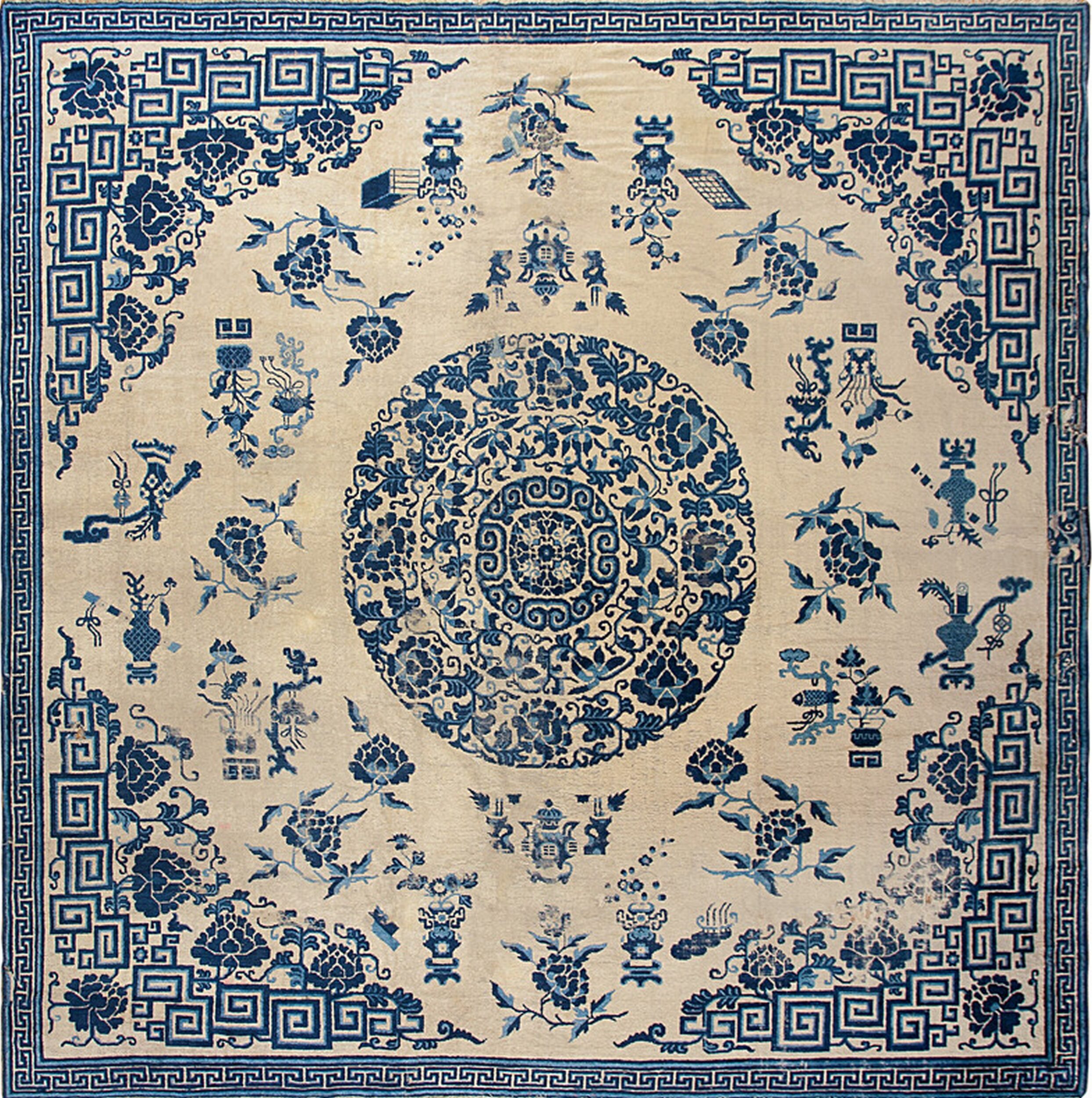 The open field is rendered in a soft, aged ivory color, providing a perfect canvas for the scattered auspicious and scholarly motifs that surround the central design. These detailed elements—including vases, ritual objects, and stylized flora—are executed with precision, showcasing the weaver’s mastery of curvilinear forms within the strict geometry of the overall design. The limited palette emphasizes form and line over chromatic complexity.