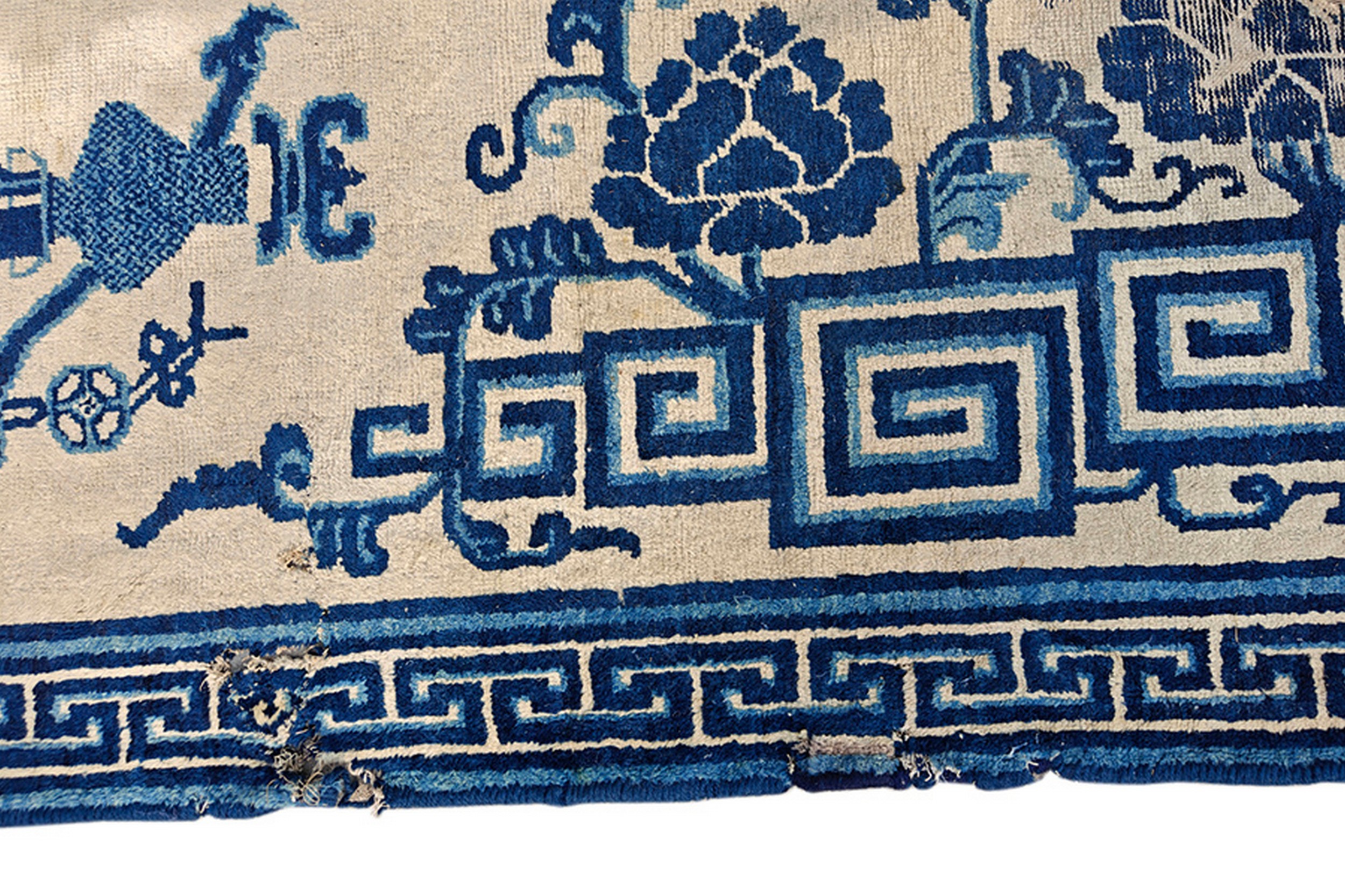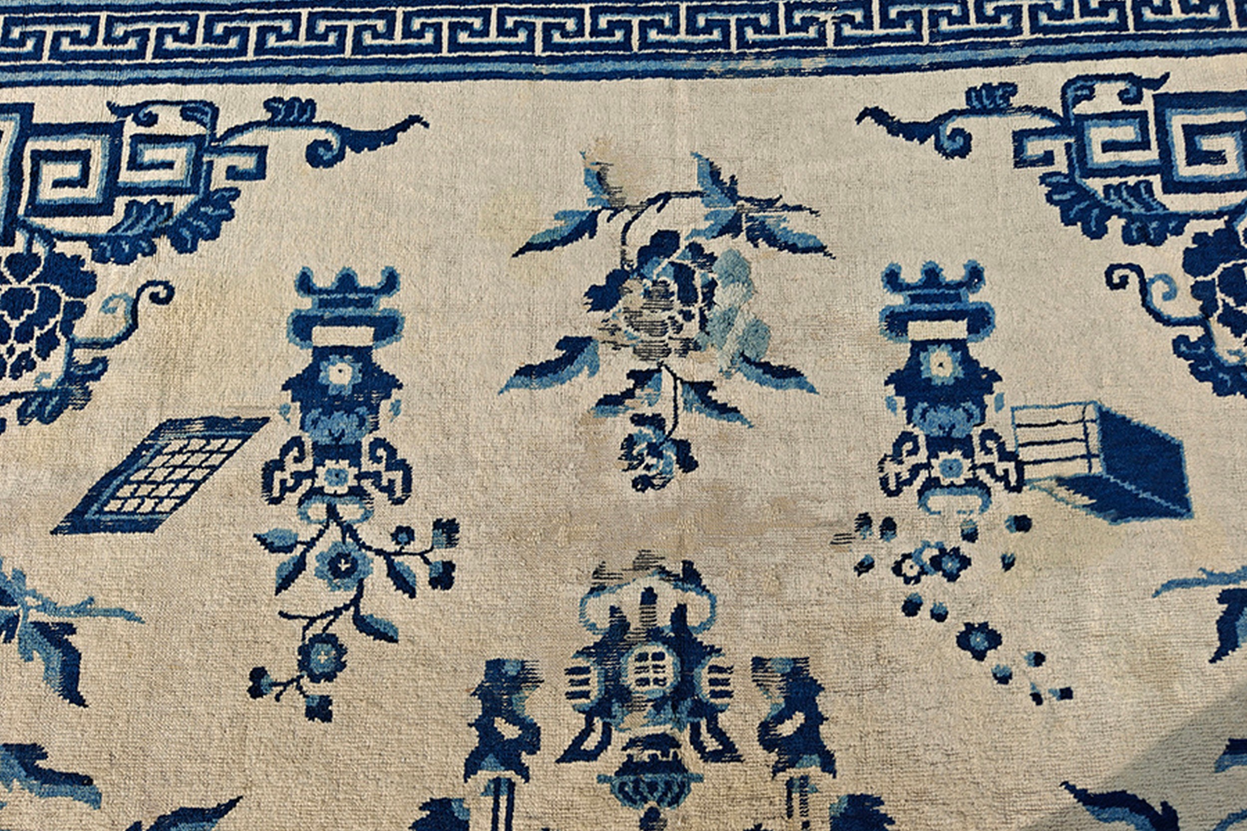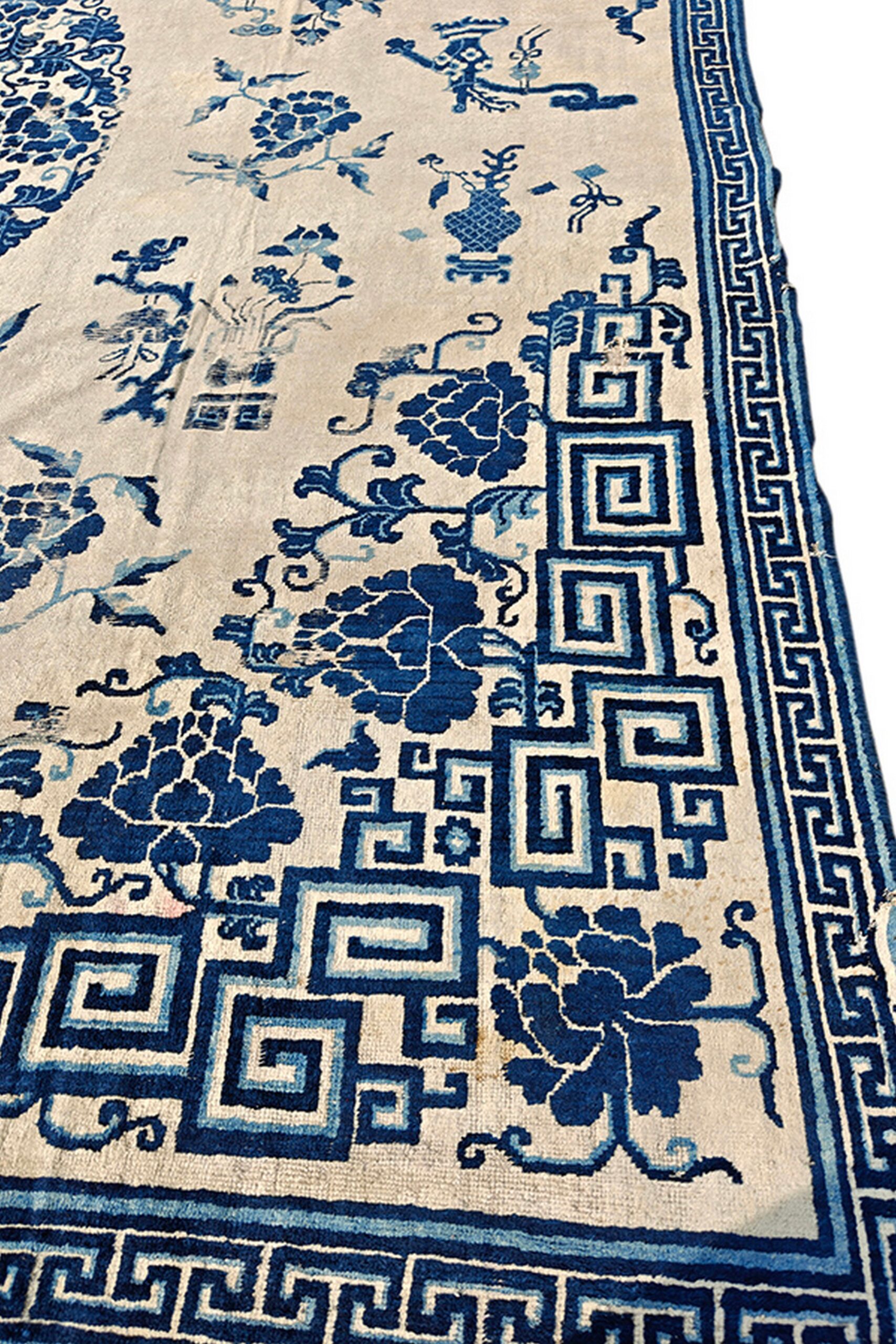 A defining characteristic is the complex, stepped border system, culminating in a bold outer frame featuring the classic Chinese interpretation of the greek Key motif. Known in China as the “Lei Wen” or thunder pattern, this geometric device provides a powerful counterpoint to the organic curves of the field. This rug represents a pinnacle of 19th-century Chinese weaving, offering both historical significance and enduring decorative appeal.