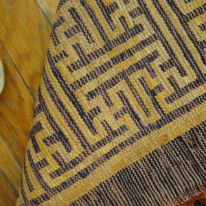 Antique Ningxia Hallway Runner Silk Gold Rug, Circa Date: 1870s. This exceptional Chinese textile from the late Qing Dynasty showcases the refined aesthetic of Ningxia weaving. The field is dominated by a brilliant, saturated gold coloration, achieved through masterful use of natural dyes, setting a tone of imperial luxury and warmth.