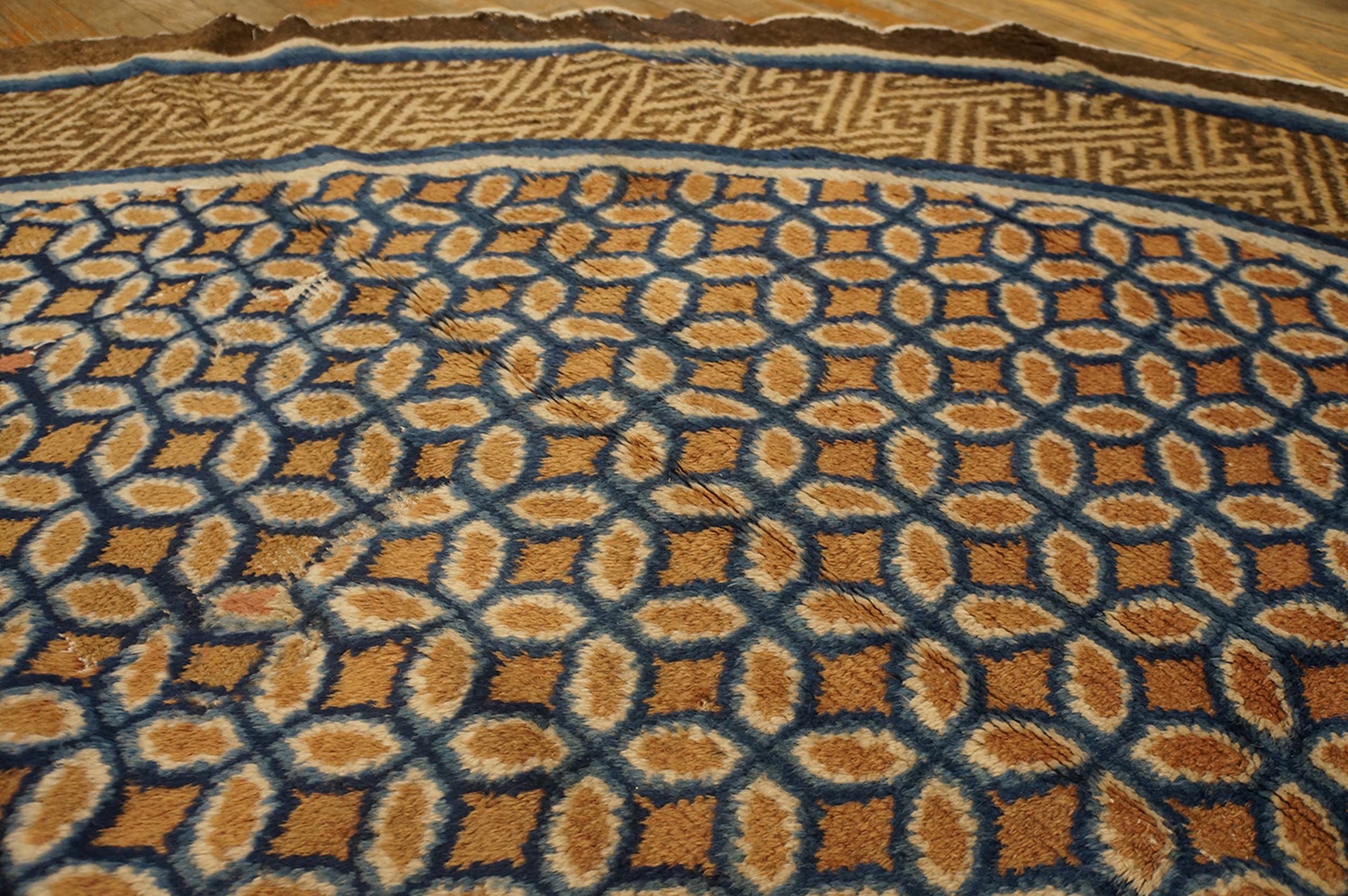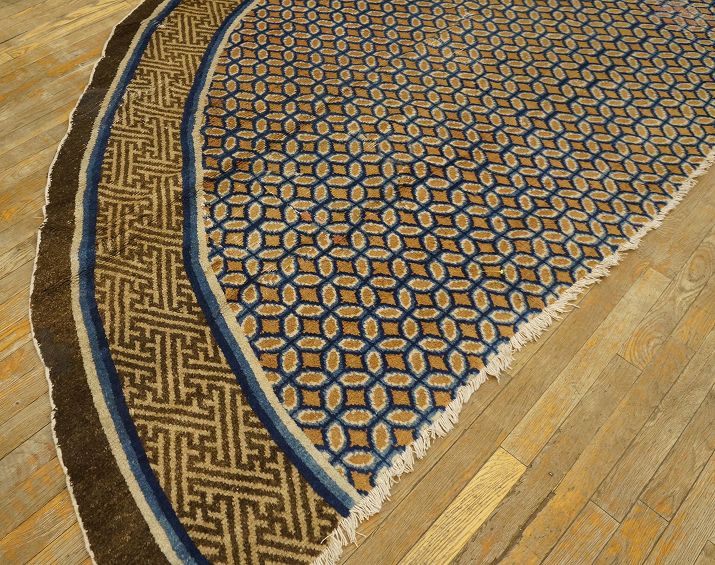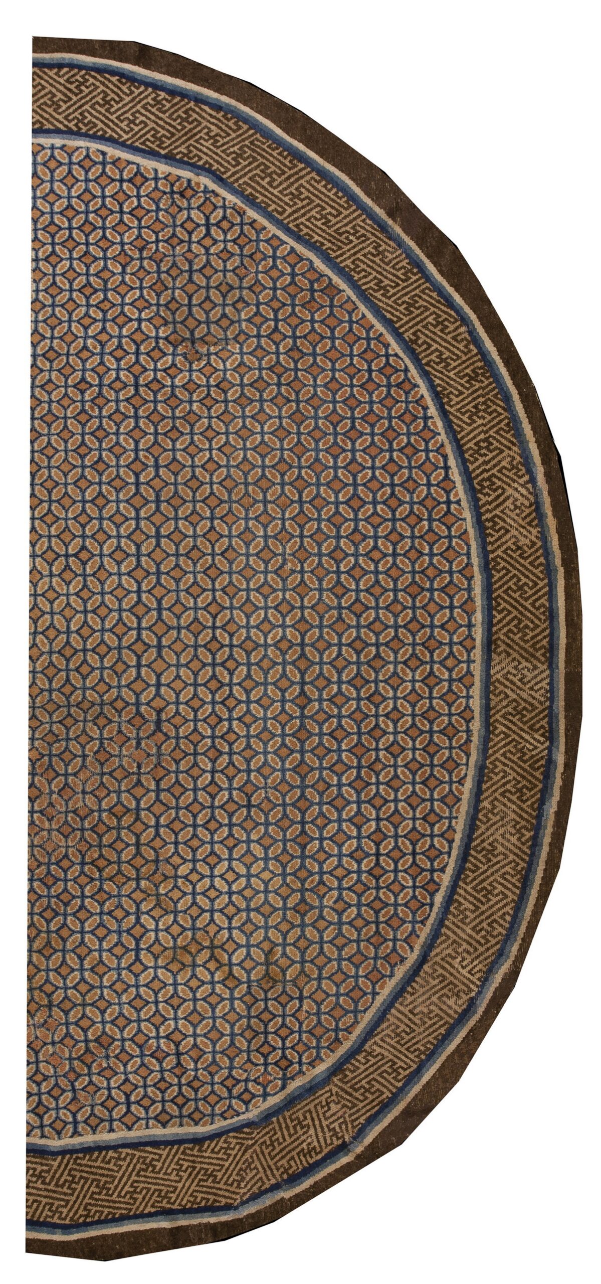 The palette is defined by a striking contrast between rich indigo blue and warm camel tones, set against a deep, earthy border. The overall effect is a masterful study in brown earth-tone color rugs, utilizing natural dyes that have matured beautifully over three centuries to achieve a soft, resonant patina.