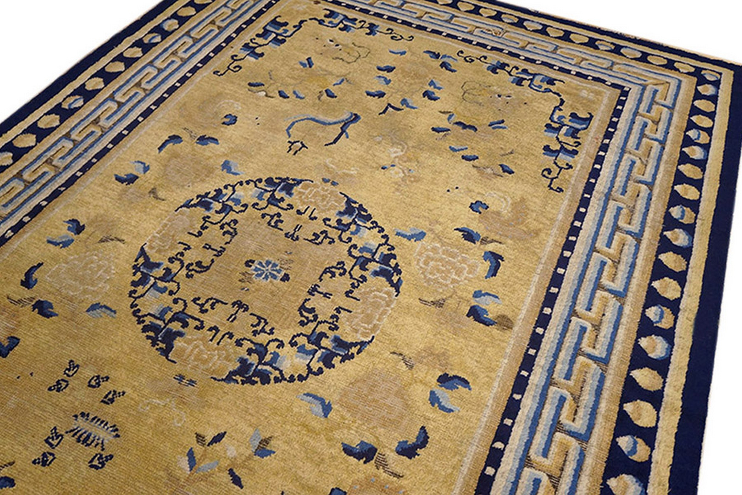 A prominent central medallion anchors the composition, utilizing intricate, stylized scrollwork that echoes traditional Chinese decorative arts. The design is restrained yet highly symbolic, reflecting the refined aesthetic preferences of the mid-18th century. Unlike later, more densely patterned pieces, this rug maintains an elegant sense of open space, allowing the richness of the wool and dye work to dominate.