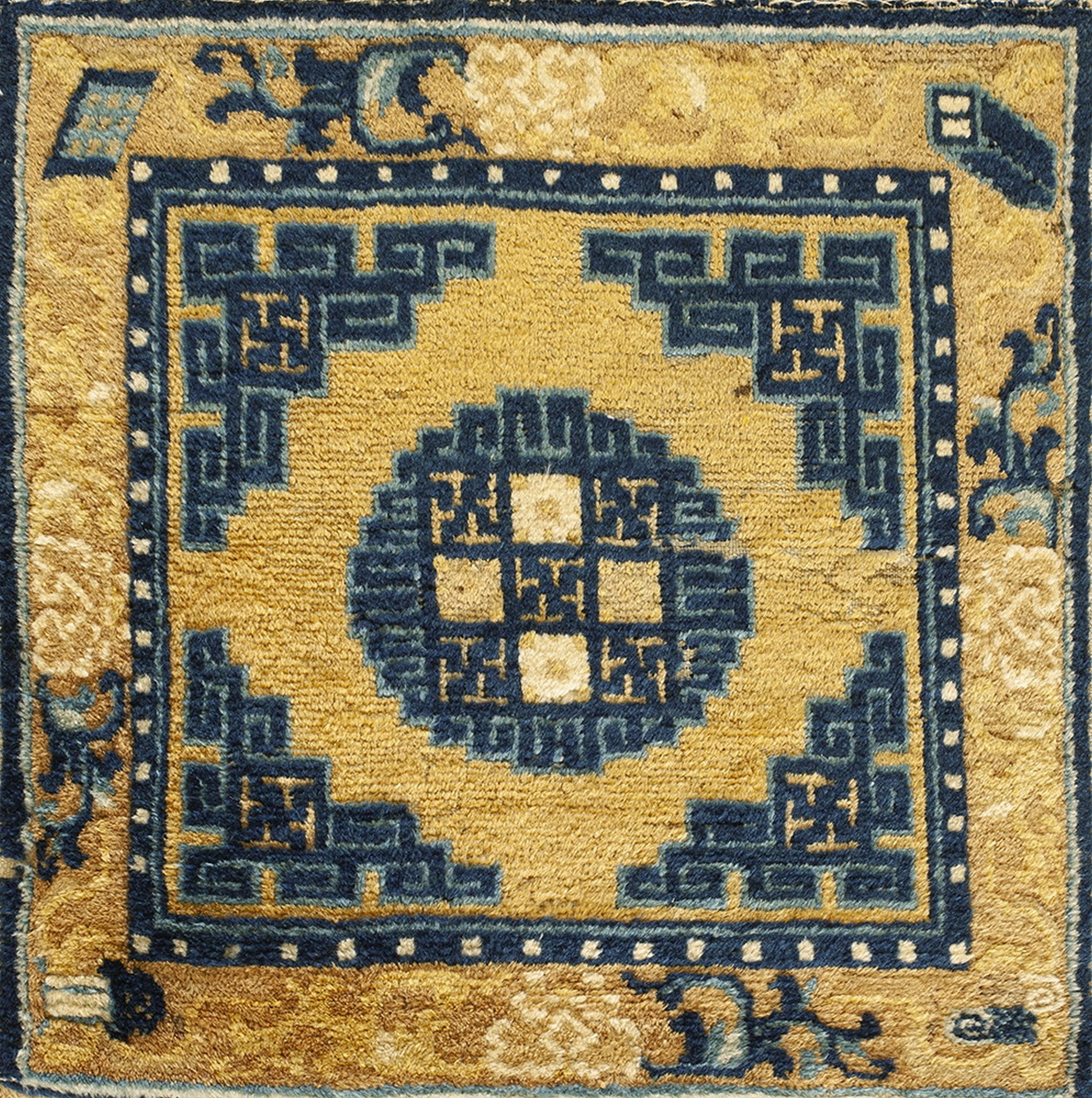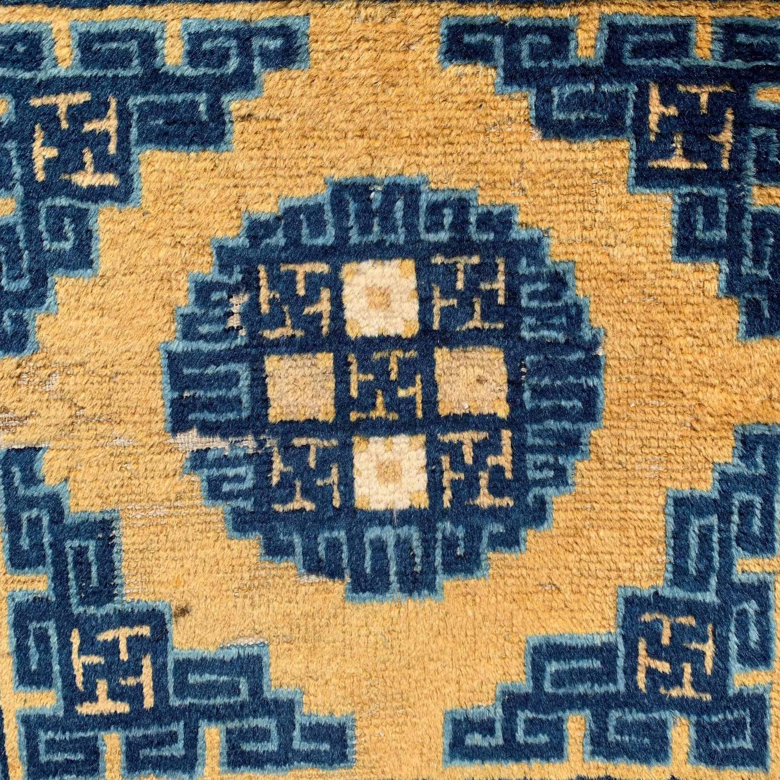Antique Ningxia Small Scatter Size Wool Gold Rug, Circa Date: 1850s. This remarkable piece is a classic example of Chinese weaving from the mid-19th century, representing the refined aesthetic often found in antique rugs of this provenance. The strong, saturated color palette and the deliberate, geometric design elements are highly characteristic of the Ningxia region during this period.