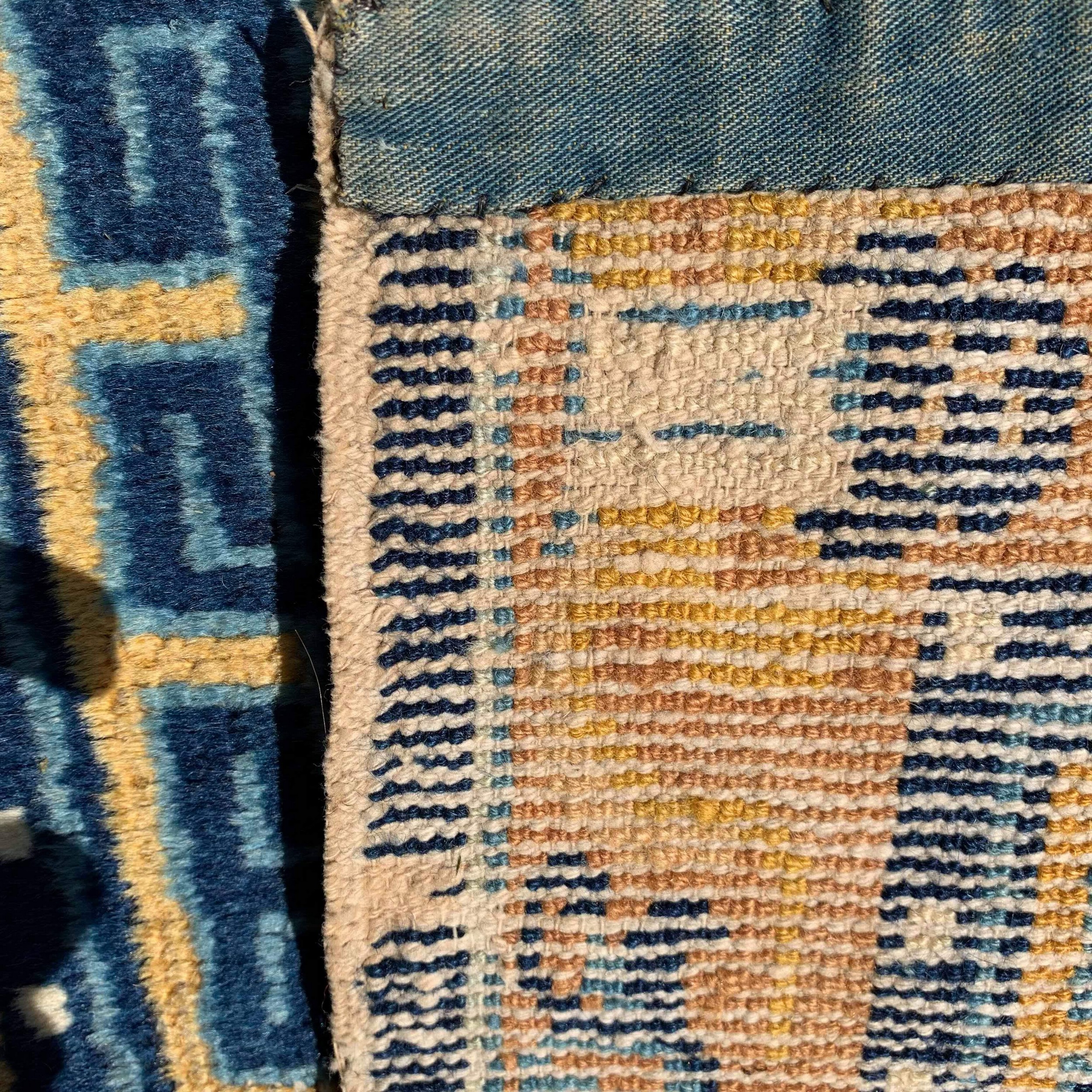 The primary field color is a rich, burnished gold, providing a luminous backdrop for the central medallion and border motifs. This specific shade of yellow-gold, achieved through natural dyes, defines the rug’s overall warmth and places it among desirable gold color rugs. The contrast with the deep indigo blue creates visual depth, highlighting the sophisticated use of negative space.