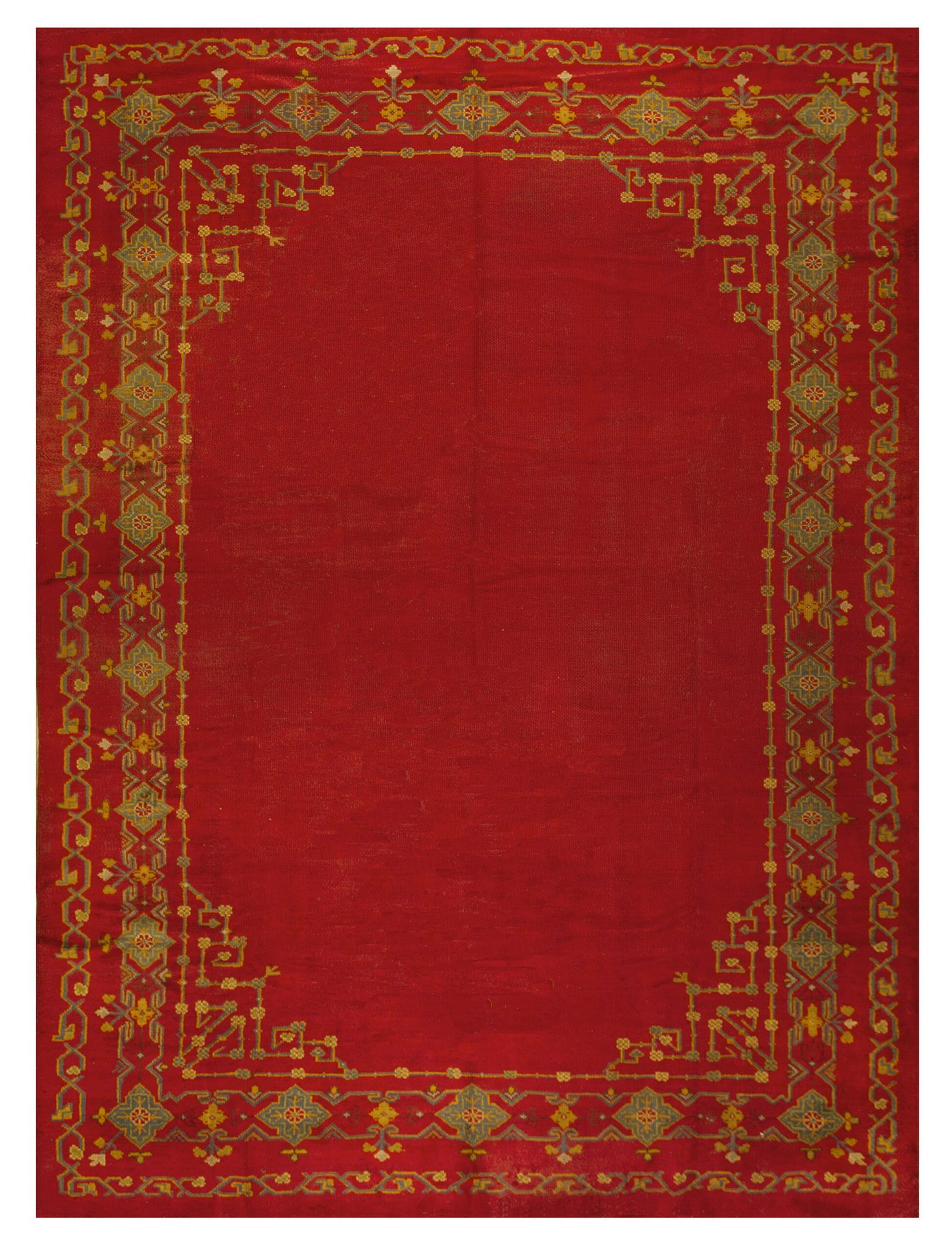 Framing the vibrant center is a highly detailed border system composed of multiple guard bands and a primary meander. Stylized geometric medallions alternate with delicate floral sprays in tones of saffron, sage, and slate grey, demonstrating the weaver’s precision. The overall effect is one of restrained opulence, successfully balancing the boldness of the field with meticulous detail.