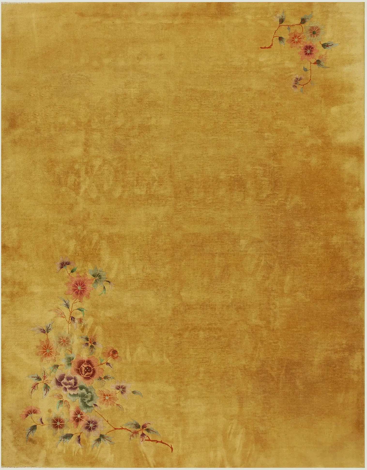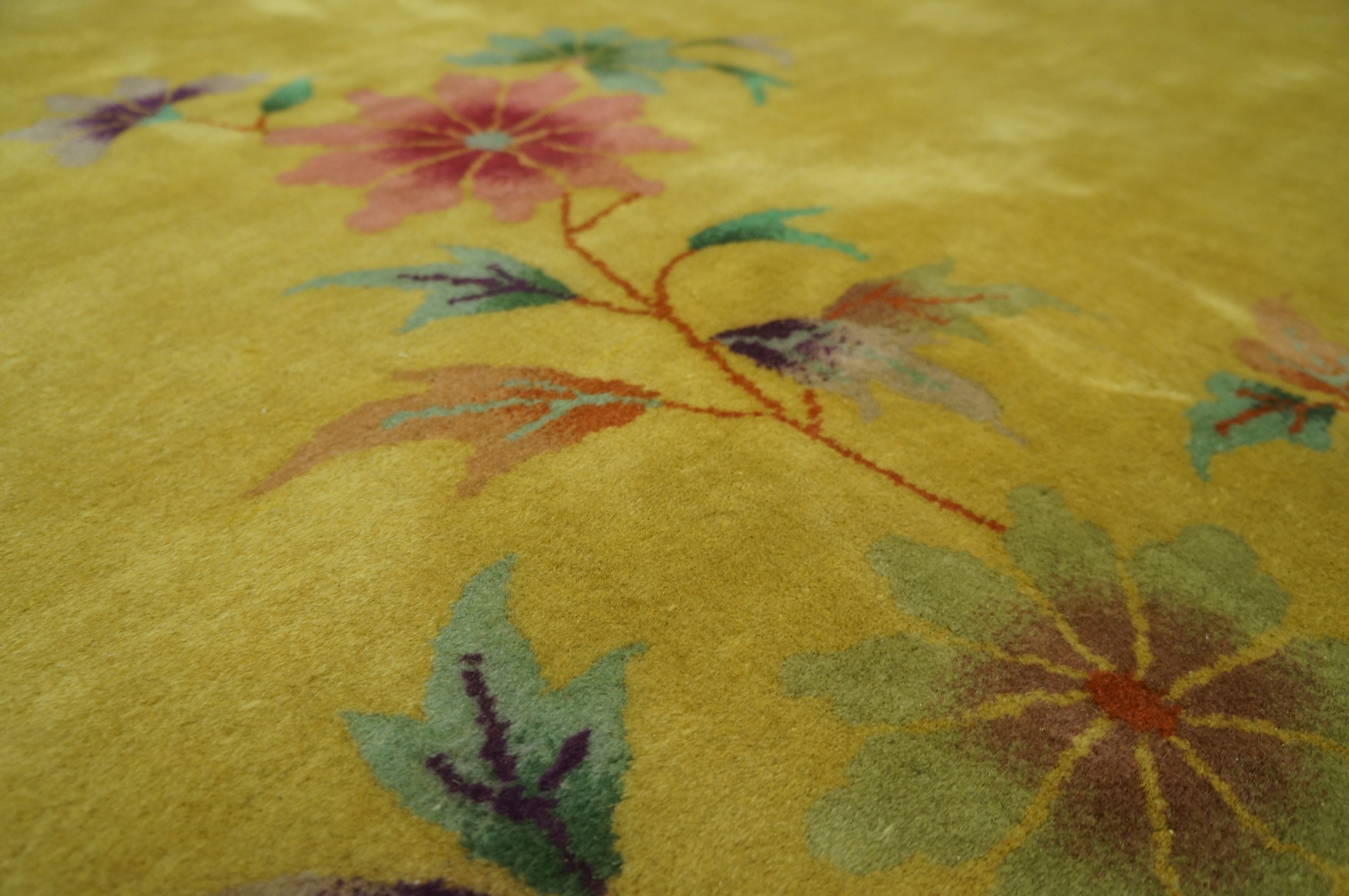 Antique Art Deco Chinese Floral Yellow / Gold / Orange 1920s Rug, Circa Date: 1920s. This exceptional example of early 20th-century Chinese weaving captures the spirit of the Art Deco movement through its bold use of negative space and stylized naturalism. It is a stunning addition to our curated collection of antique rugs.