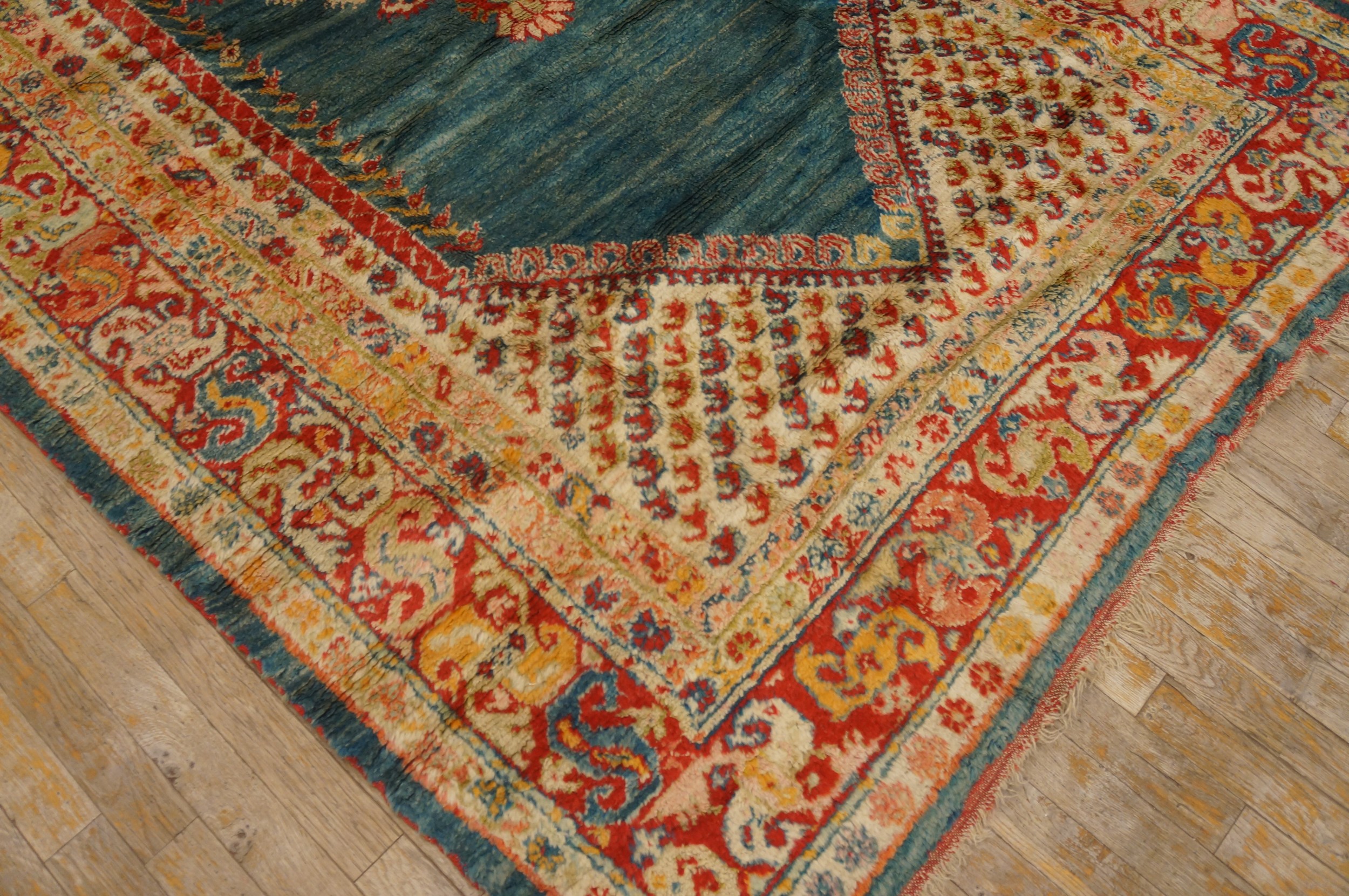 Woven from luxurious Angora wool, the field presents a deep, saturated teal, a sophisticated variation often associated with blue color rugs. This central panel is dramatically framed by stylized floral sprays rendered in rich madder red, saffron, and ivory, demonstrating the masterful use of natural dyes typical of the period.