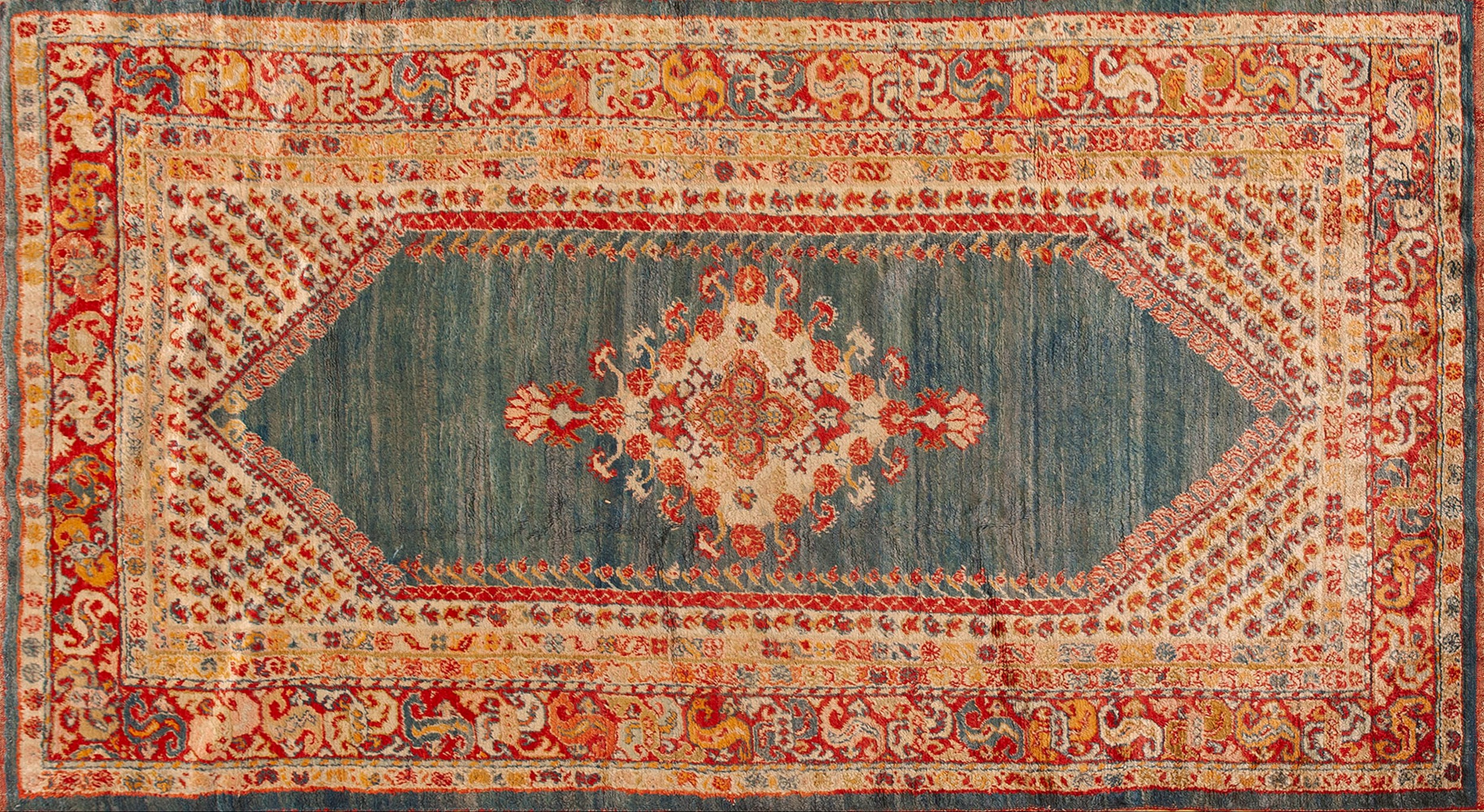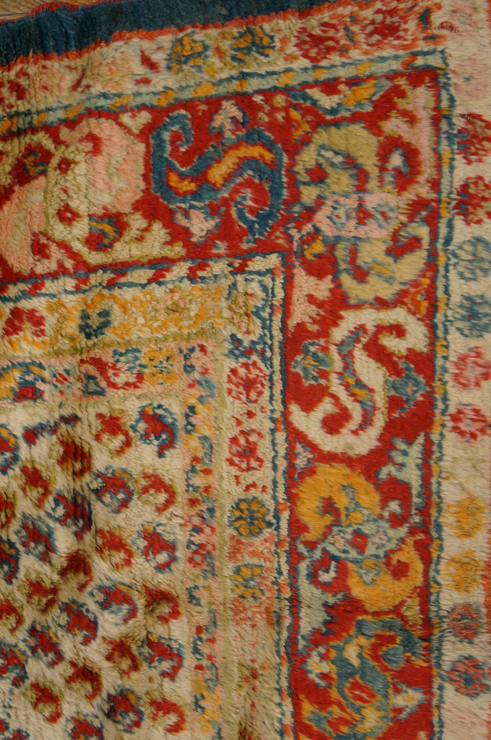 Antique Oushak – Angora Turkish Medallion Knotted Rug, Circa Date: 1890s. This exceptional piece from Western Anatolia exemplifies the refined artistry of late 19th-century Turkish weaving, highly sought after among collectors of antique rugs.