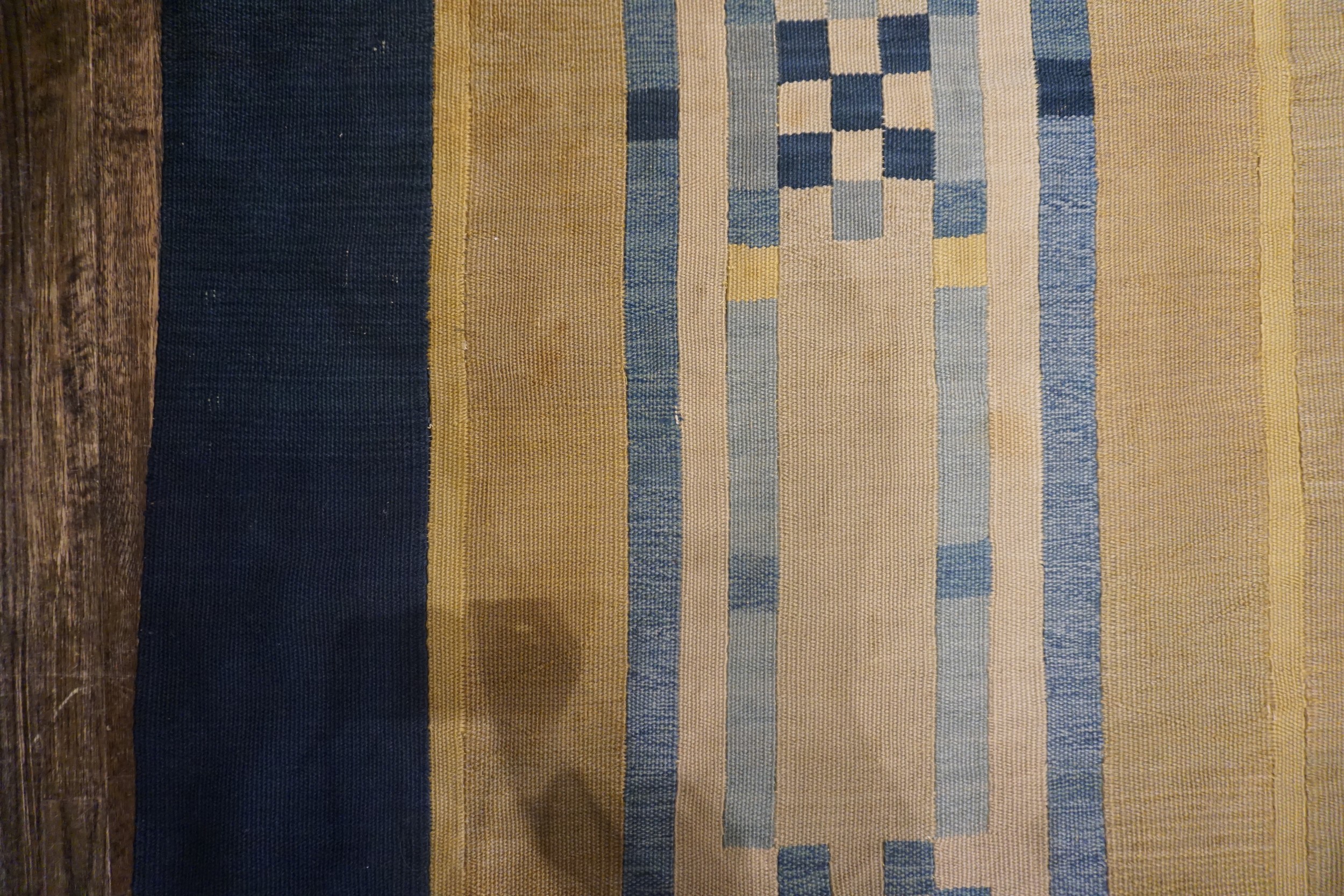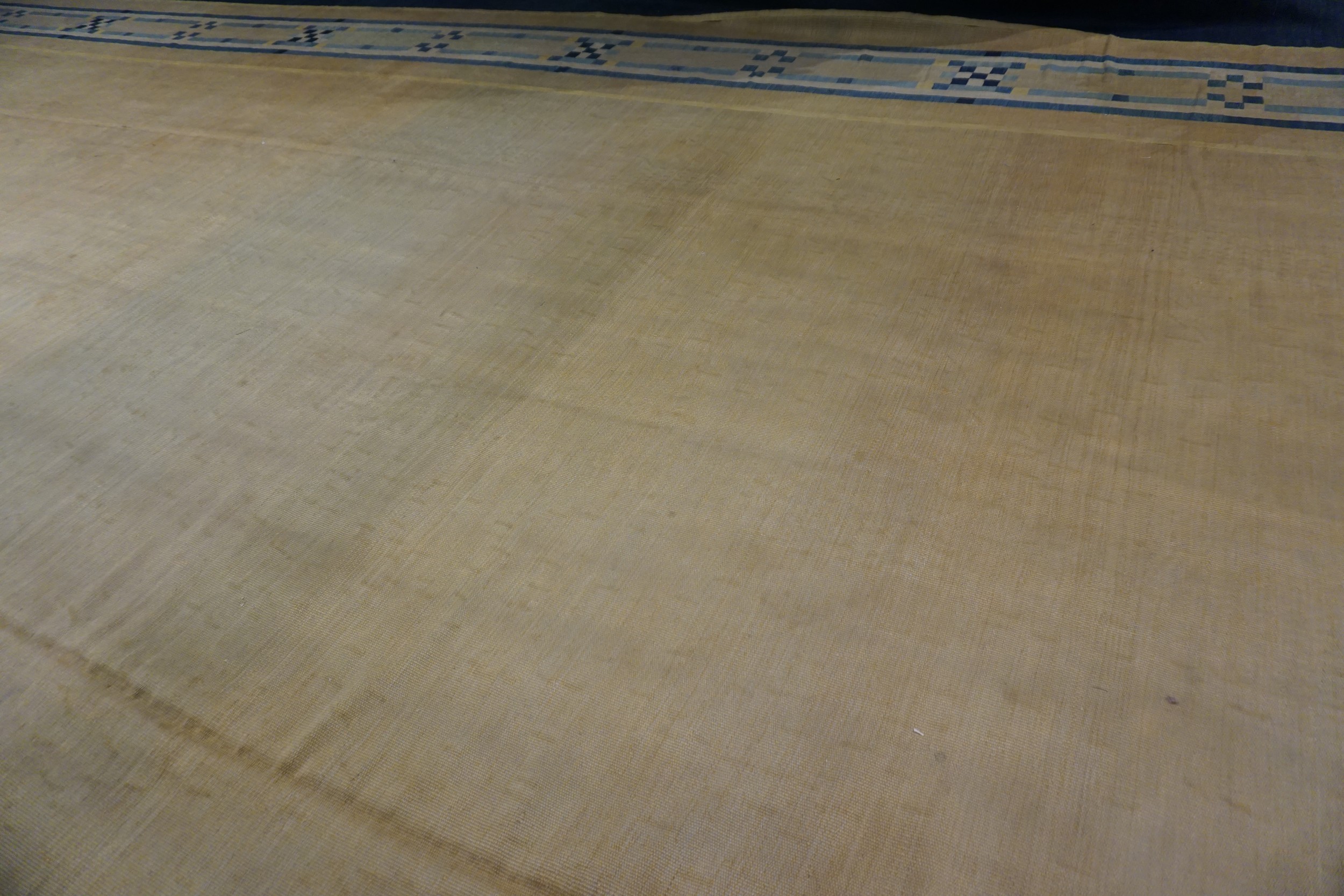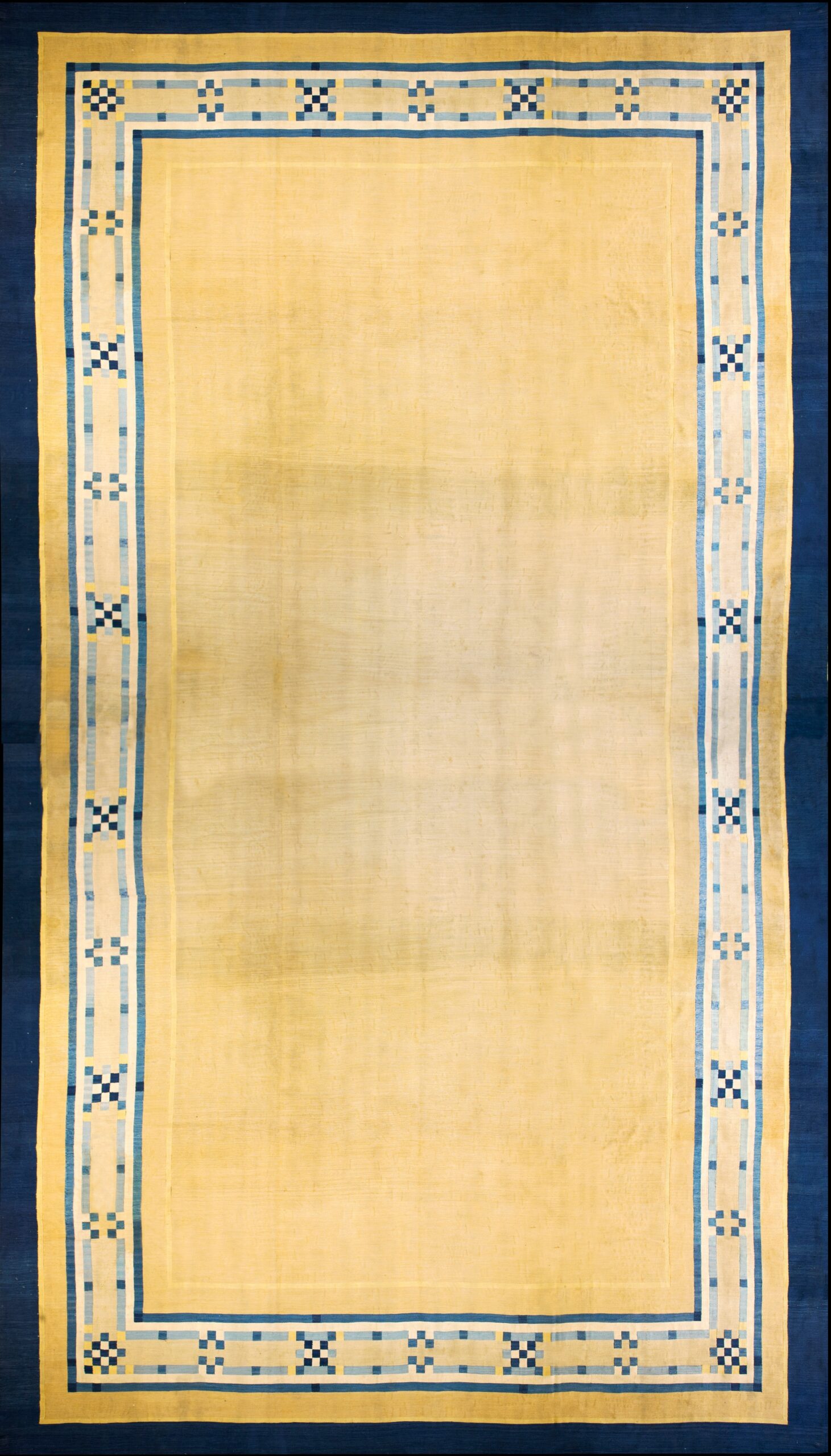 The palette is masterfully balanced, featuring a vast expanse of pale yellow contrasted sharply with deep indigo and lighter cerulean blues in the border. Given its substantial dimensions, this piece is perfectly suited to anchor a grand living space or dining room, providing a rare opportunity to acquire an Art Deco textile in this impressive oversized format.