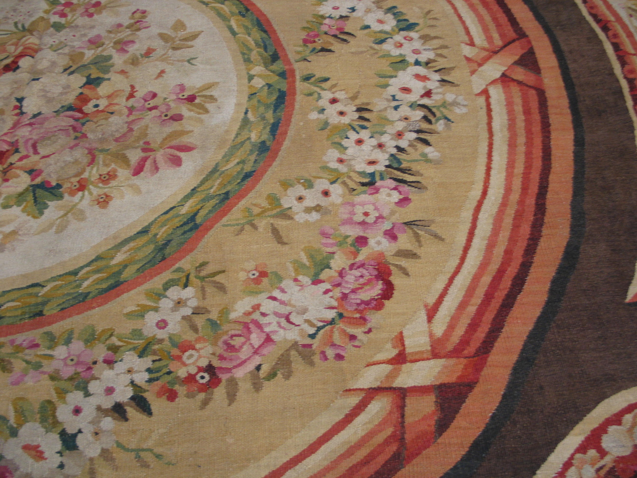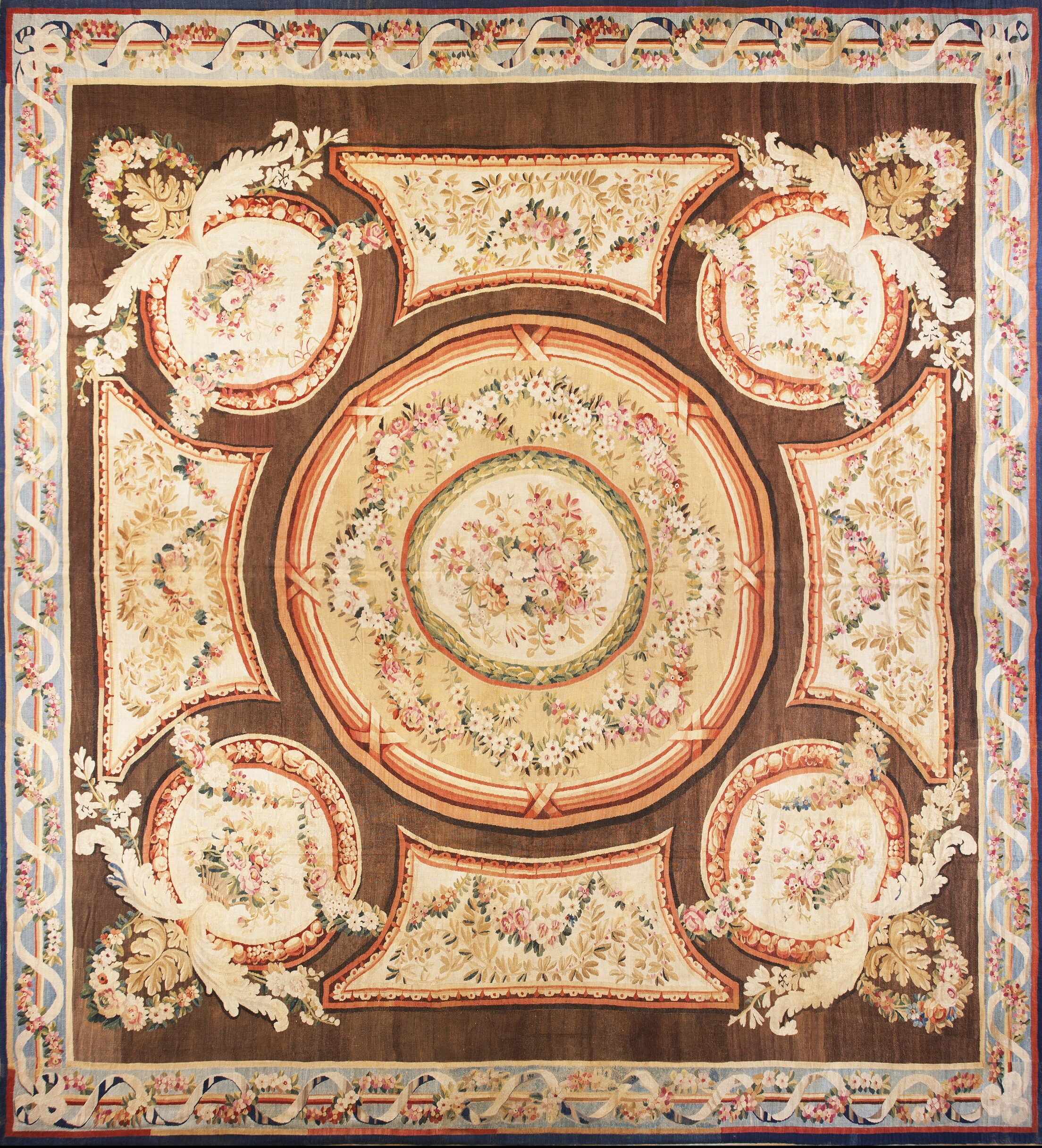 The design is structured around a central oval medallion surrounded by four radiating cartouches, all densely filled with exquisite bouquets and garlands. The masterful execution of these floral rugs patterns, featuring delicate roses, hydrangeas, and trailing ribbons, demonstrates the Aubusson weavers’ unparalleled skill in translating complex painted designs into textile form.