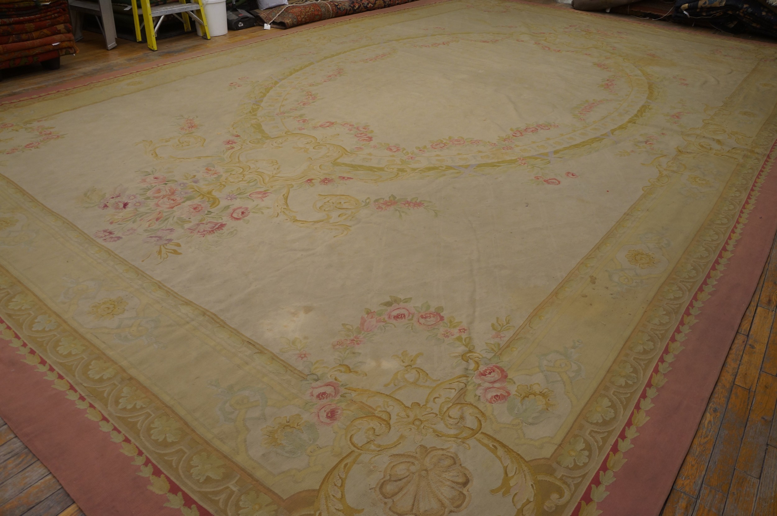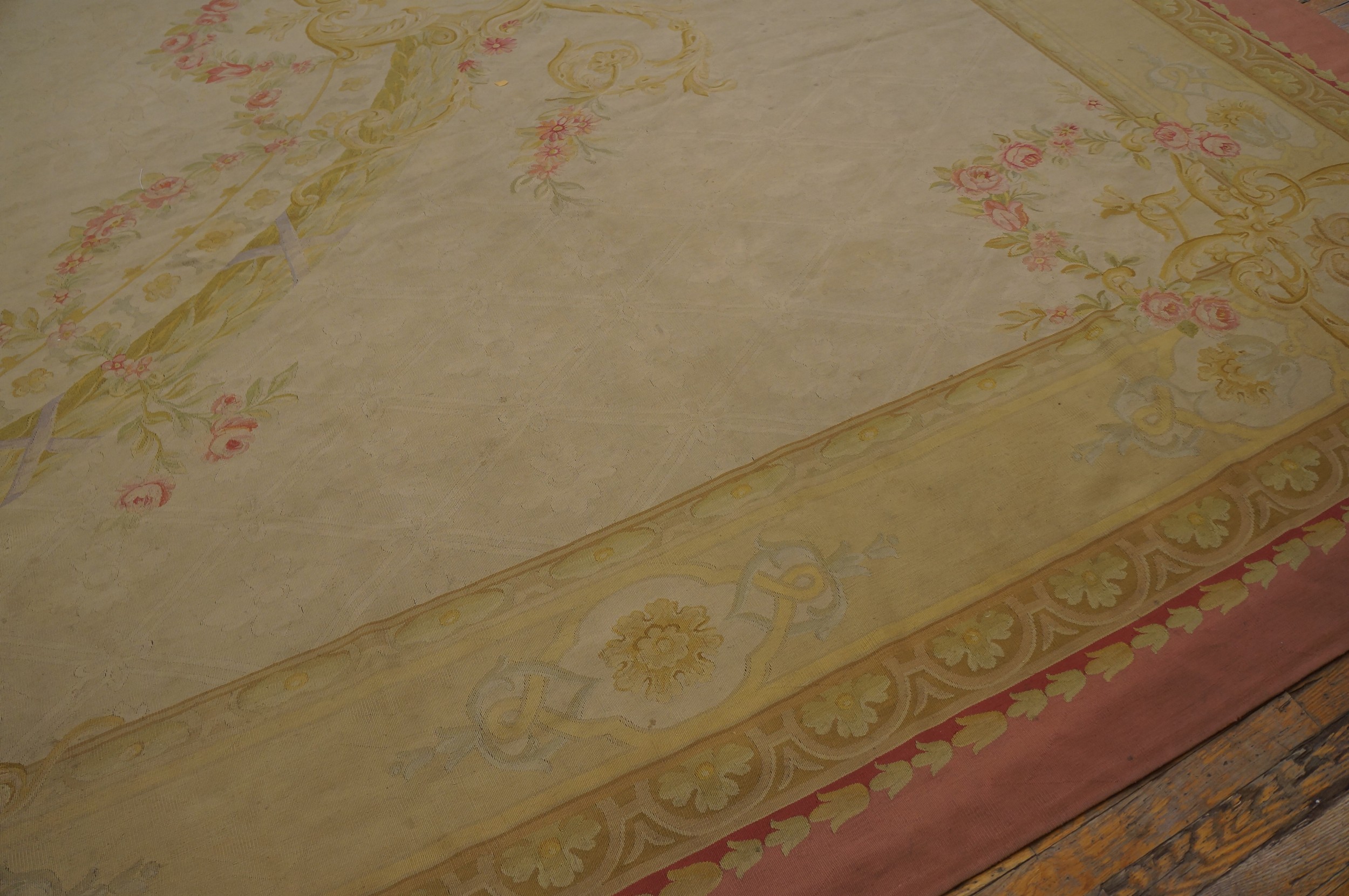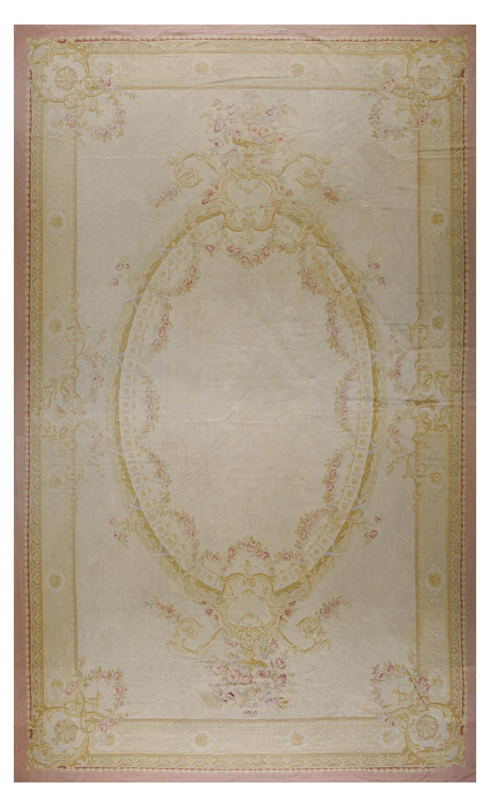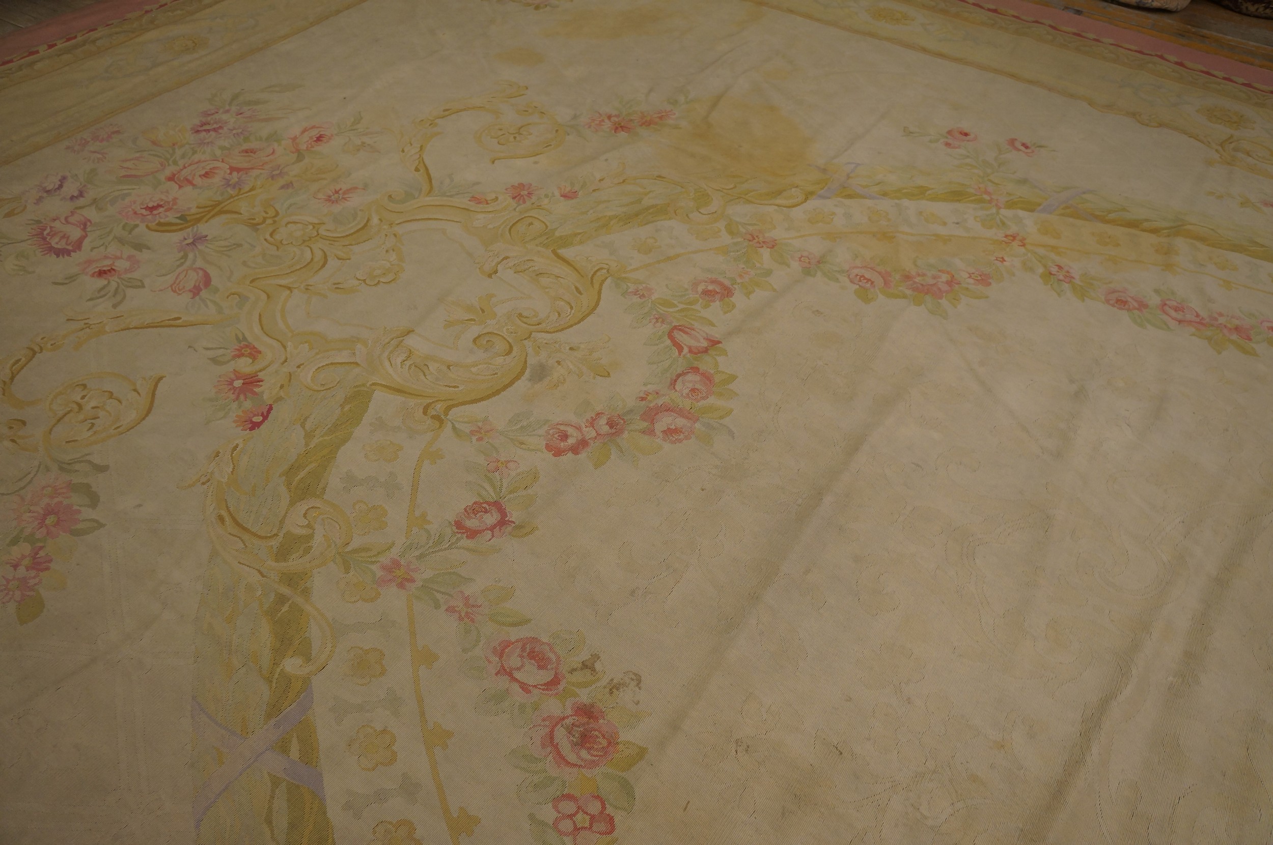 This piece achieves a perfect balance between architectural formality and Romantic softness, making it highly adaptable to both traditional and transitional settings. The sheer size and subdued luxury of this textile make it a rare and highly desirable oversized rug for collectors seeking authentic French decorative arts.