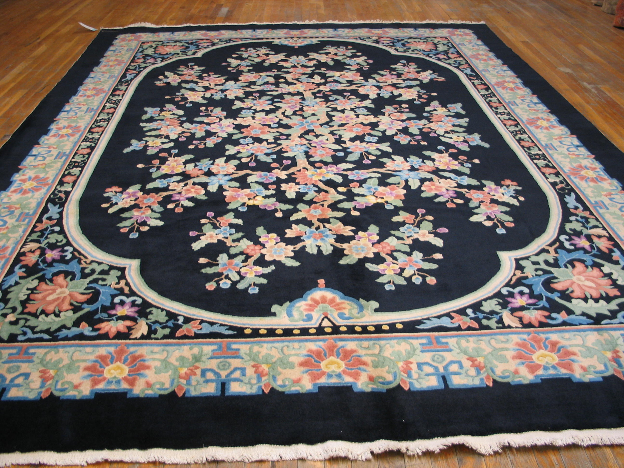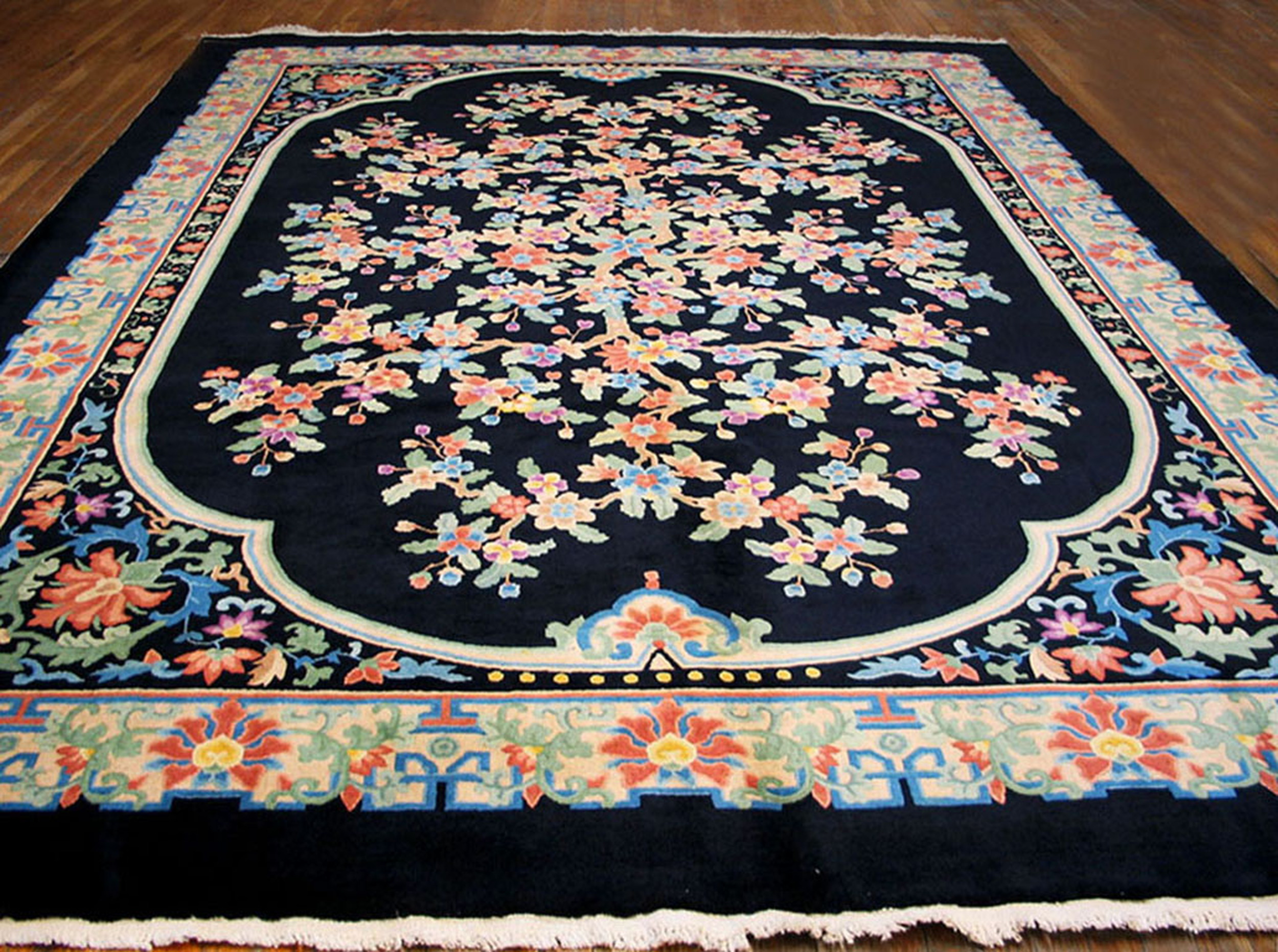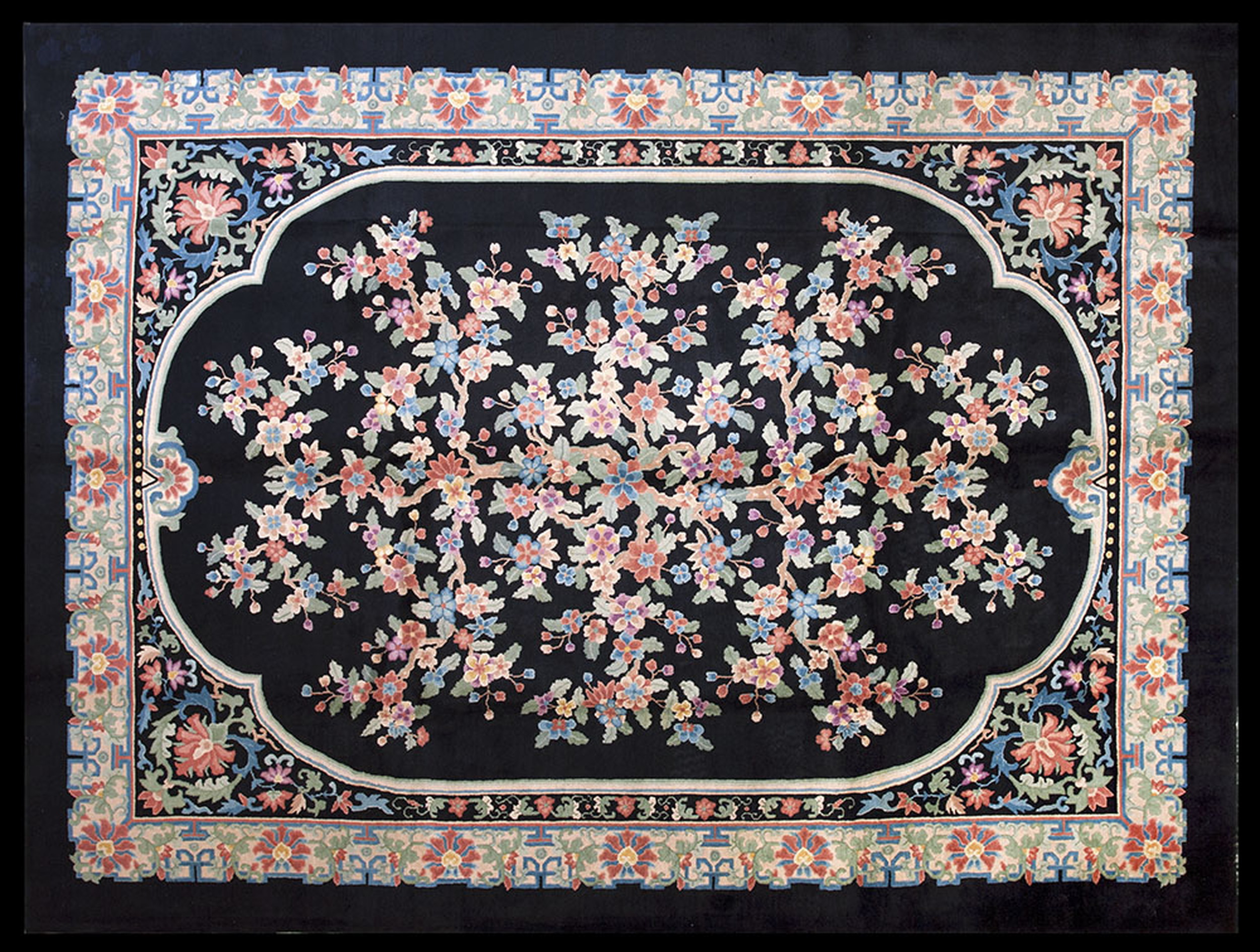 Antique Floral Medallion Wool Hand Knotted Pile Black 1920s Rug, Circa Date: 1920s. This exceptional example of Art Deco textile design is a testament to the enduring appeal of antique rugs. The composition features a dramatic central medallion framing a lush, stylized flowering tree, rendered in a palette of soft pastels against a stark, saturated ground.