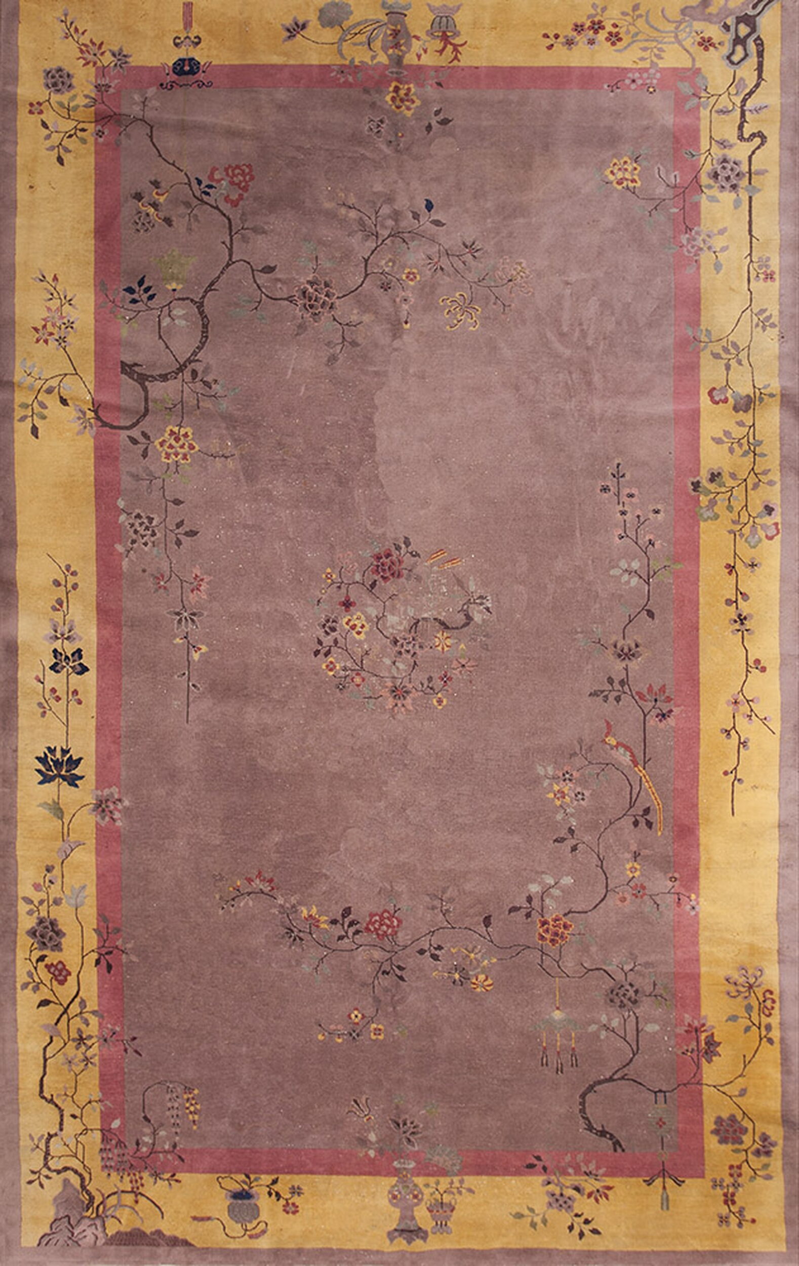 The expansive central field presents a nuanced, dusty mauve hue, offering a subtle backdrop for the design. While nominally an ivory color piece—referencing the pale tones in the accents and border—the overall impression is one of muted sophistication, perfectly capturing the transitional color sensibilities of the 1920s.