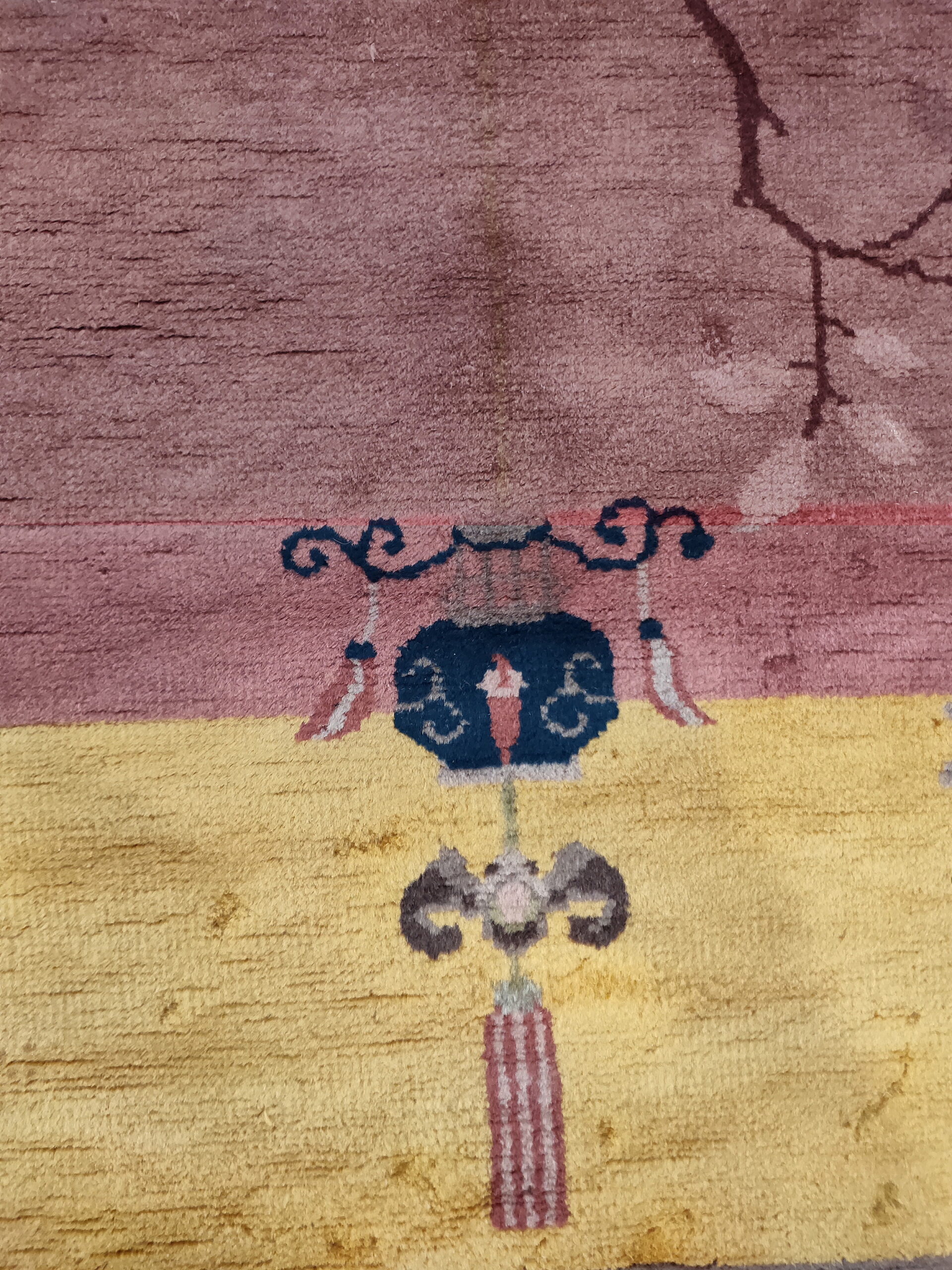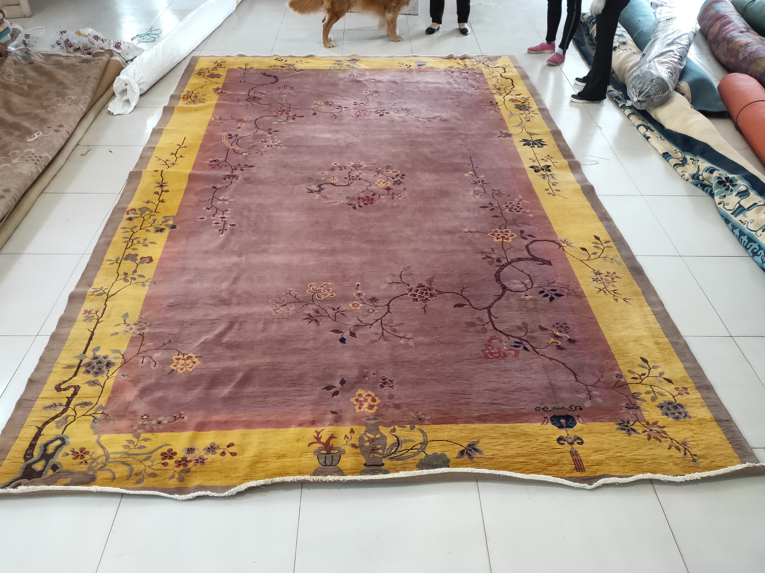 Antique Oversized Chinese – Art Deco Wool Room Size Ivory Rug, Circa Date: 1920s. This exceptional example of early 20th-century Chinese weaving bridges traditional Chinoiserie elegance with the nascent Art Deco aesthetic. It is a remarkable piece among antique rugs, distinguished by its sophisticated scale and unusual coloration.