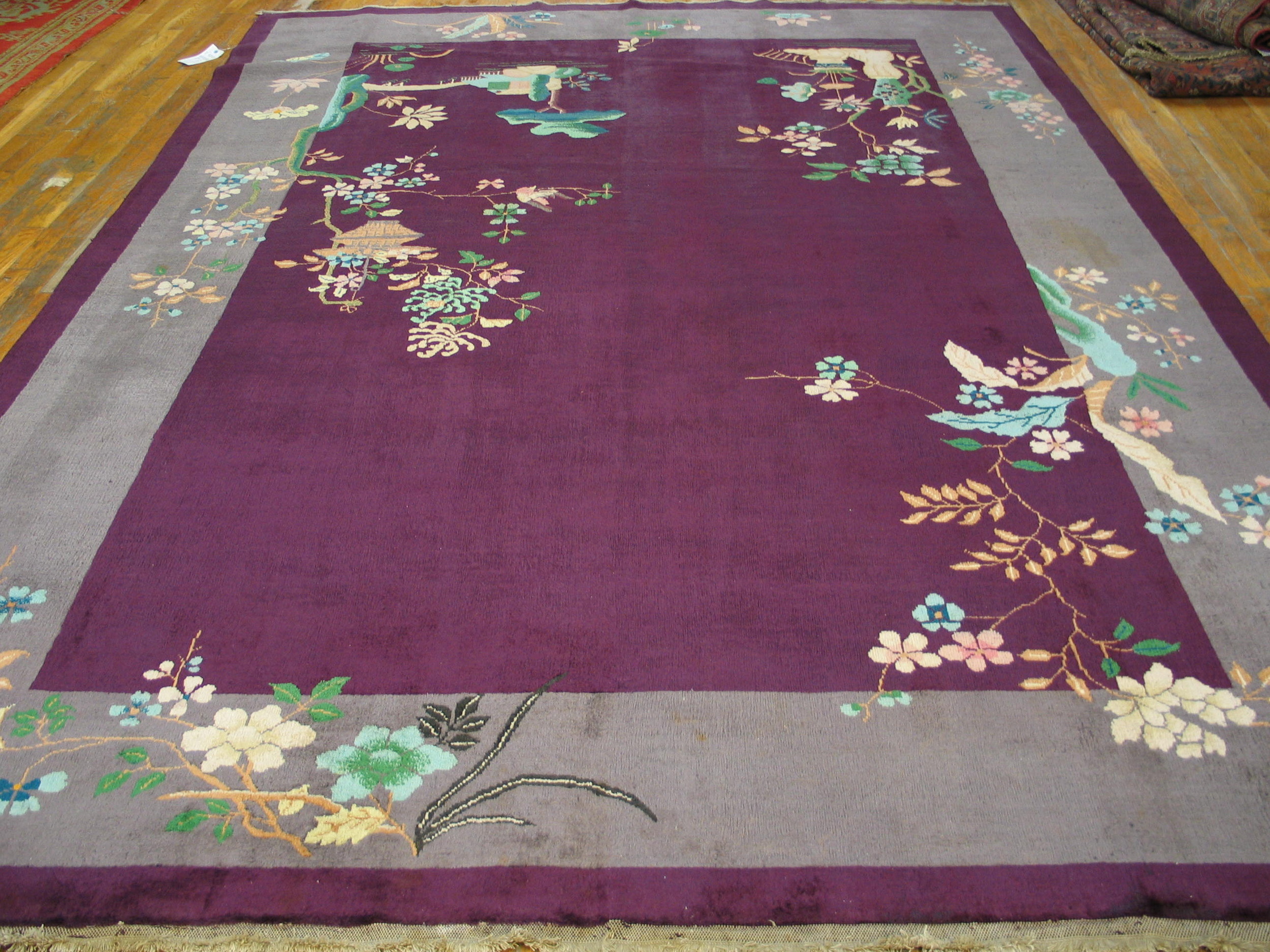 The design is characterized by classic Chinese Chinoiserie elements, where stylized branches and blossoming flora emerge from the edges of the central field. These beautifully rendered vignettes, featuring soft greens, blues, and creams, exemplify the best traditions found in floral rugs of the period, emphasizing naturalistic yet streamlined forms typical of the 1920s aesthetic.