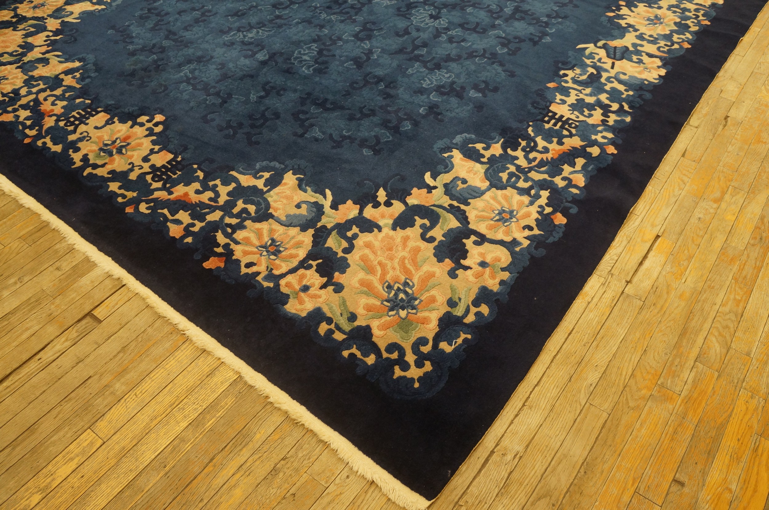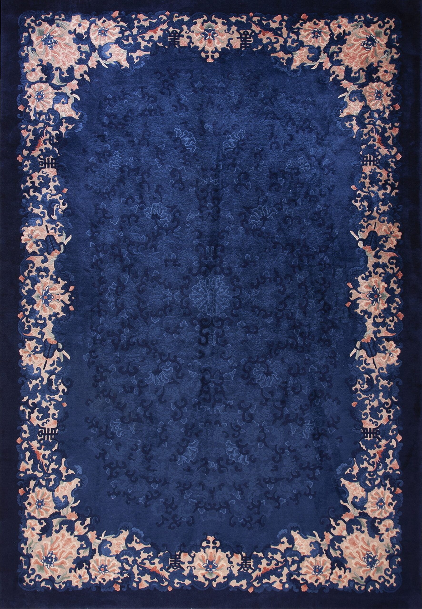 The expansive central field features subtle, tone-on-tone scrolling vine and cloud motifs, rendered in varying shades of sapphire and navy wool. This restrained treatment allows the eye to appreciate the quality of the hand-knotted pile and the luxurious depth of the color. Such classic designs are highly sought after among collectors of antique rugs.