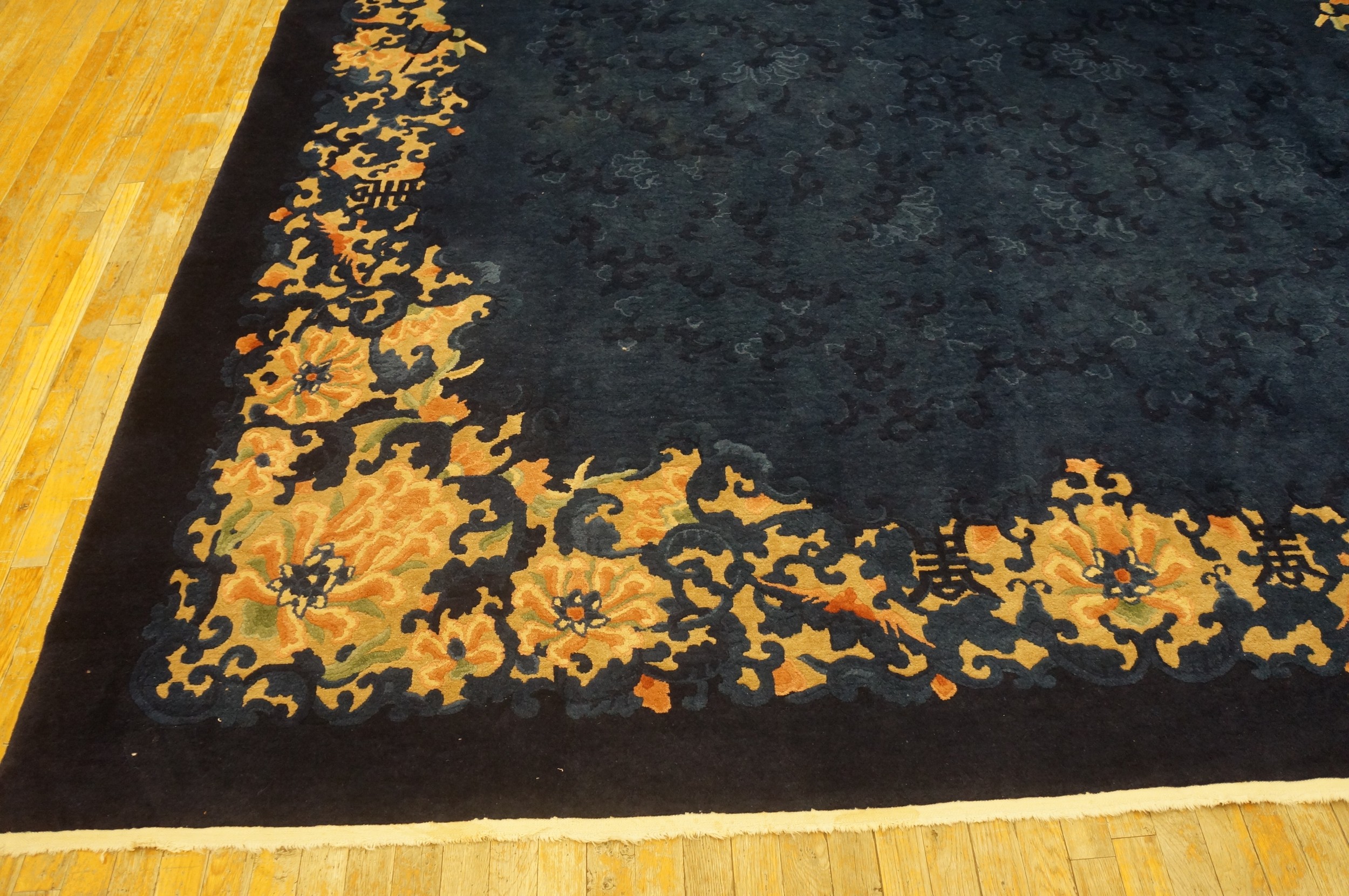 Hand Knotted Pile Rectangle Wool Blue 1920s Antique Rug, Circa Date: 1920s. This exceptional piece of textile artistry captures the sophisticated aesthetic of early 20th-century Chinese weaving. The deep, saturated indigo field is characteristic of the finest blue color rugs from this period, providing a rich backdrop for the highly detailed border design.