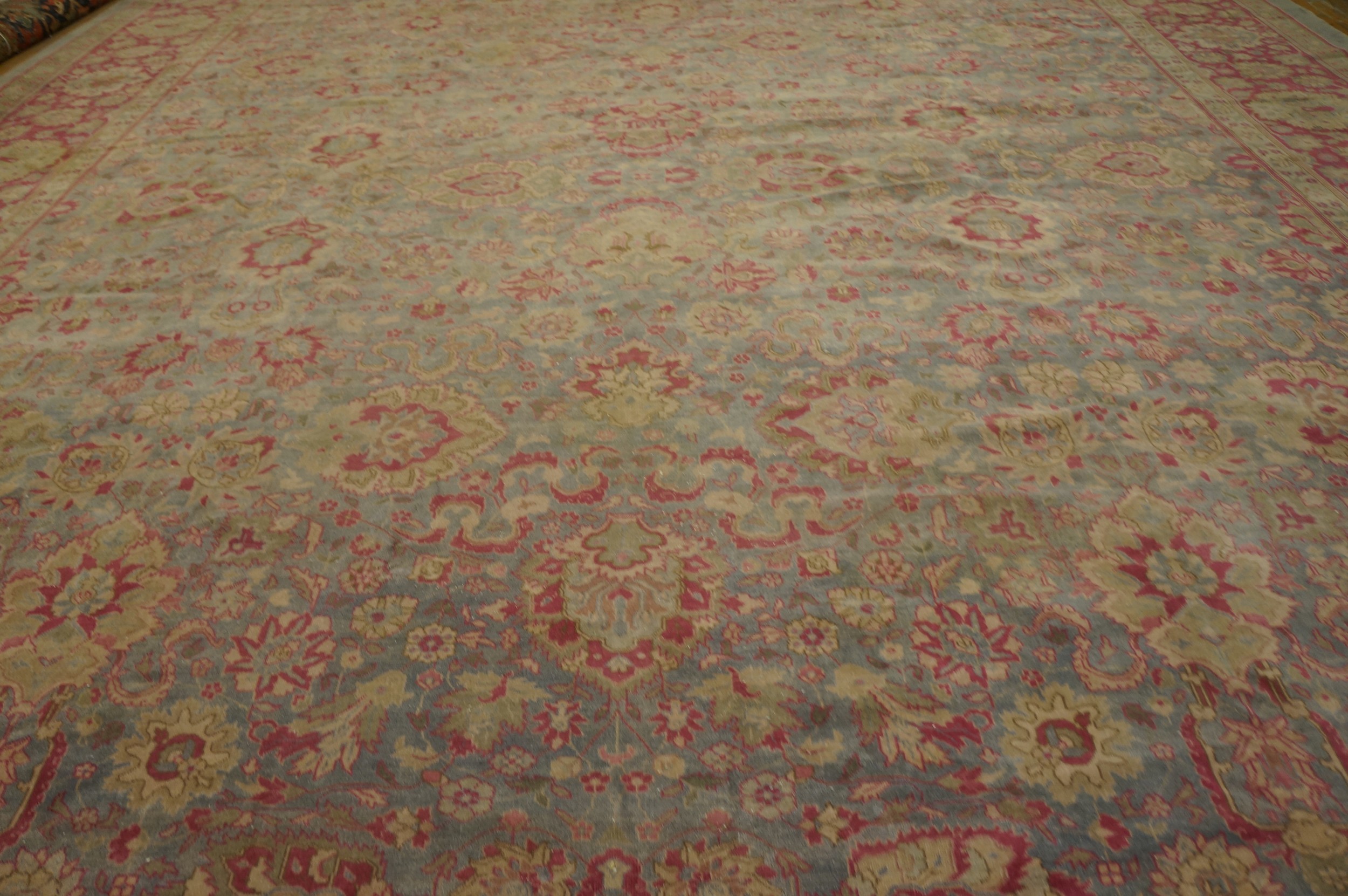 Antique Oversized Lahore Indian Geometric Knotted Rug, Circa Date: 1920s. This exceptional piece from the British Raj era showcases the refined weaving tradition of Lahore, a center known for producing rugs that rivaled Persian court carpets. The sheer scale of this piece makes it a commanding foundation for any grand interior, fitting perfectly within our collection of large oversized rugs.