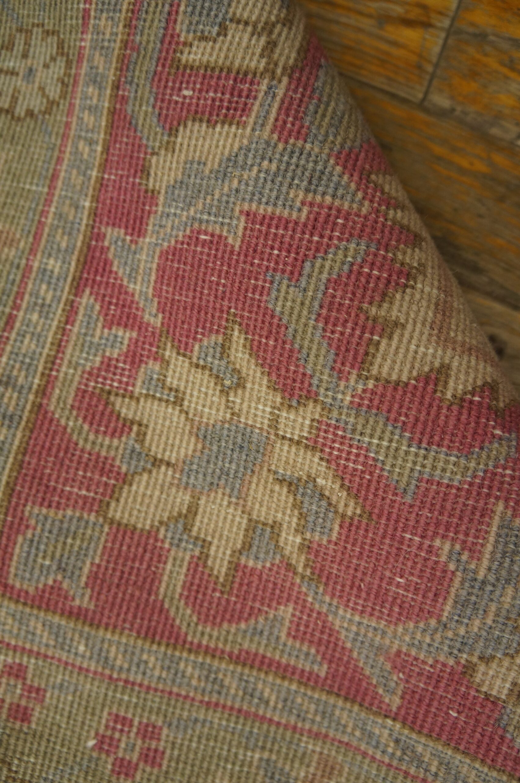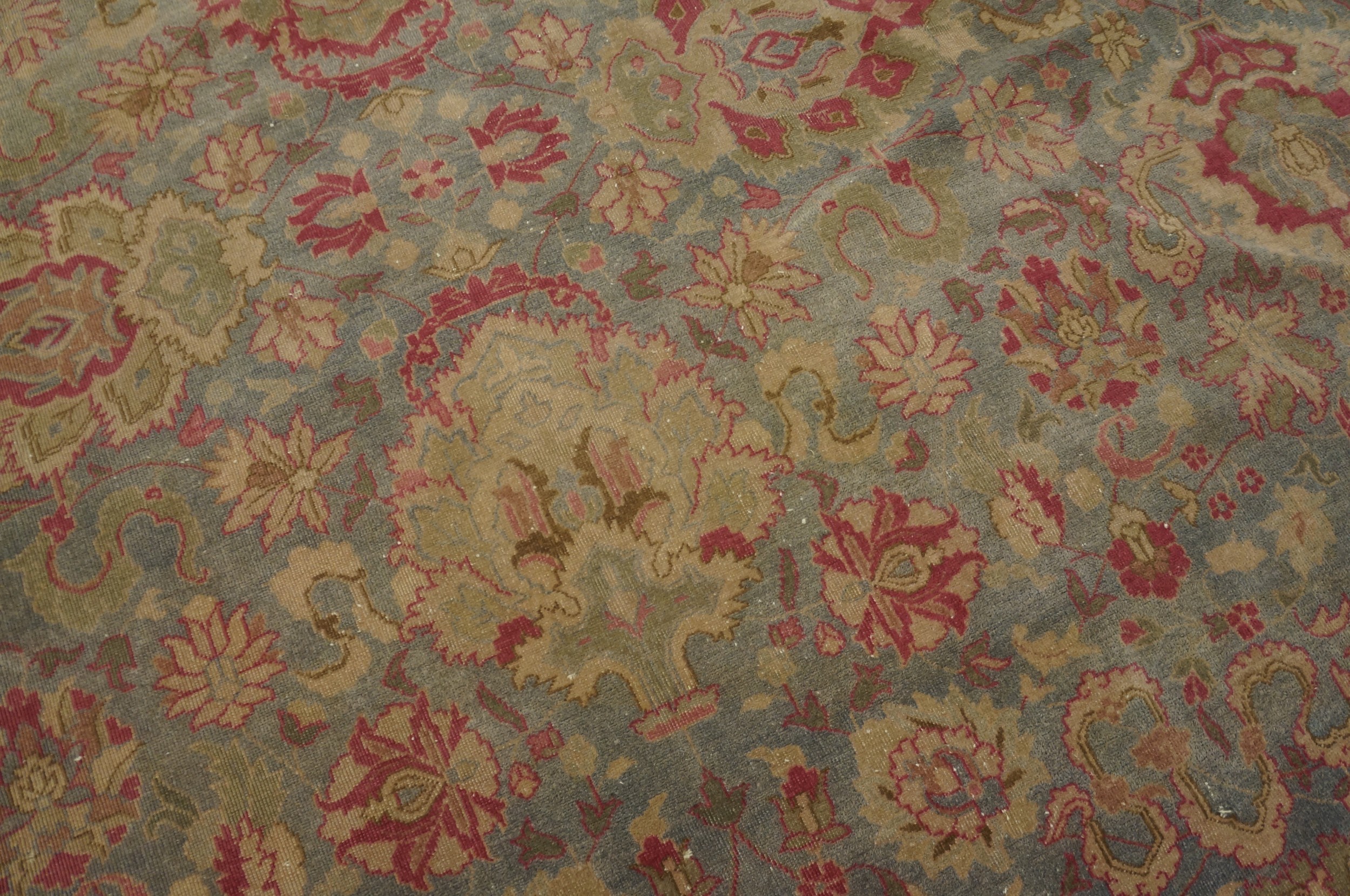 Despite the title’s reference to geometric structure, the field is densely populated with an intricate, all-over pattern of stylized palmettes, delicate blossoms, and meandering vines, characteristic of classical Indian court designs influenced by Safavid aesthetics. The complexity of the knotting ensures that the pattern retains its clarity even after decades of use, reflecting the high caliber of early 20th-century craftsmanship.