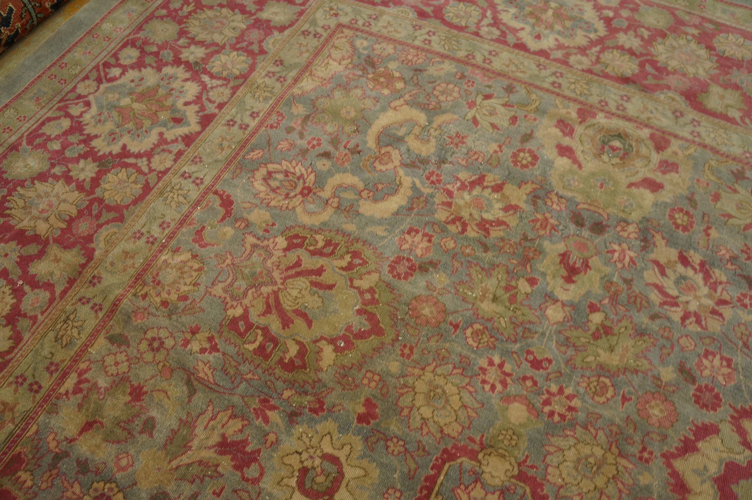 The palette is defined by a soft, ethereal sky blue field, which has mellowed beautifully over a century, providing a serene backdrop for the complex design. This calming hue is dramatically framed by a wide main border rendered in deep rose and magenta tones, a classic contrast that highlights the rug’s stately proportions. This specific shade places it among the finest examples of blue color rugs from the period.