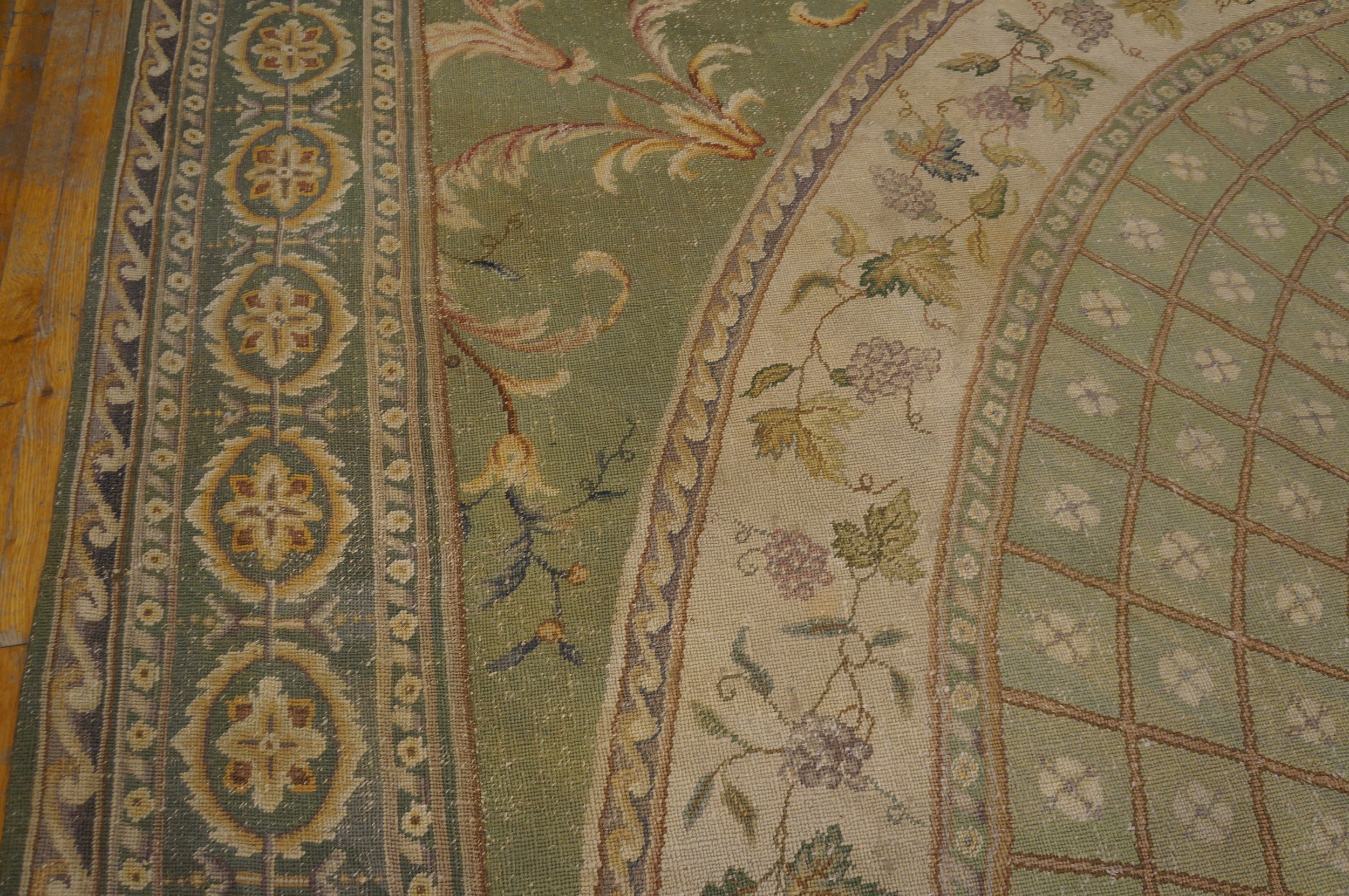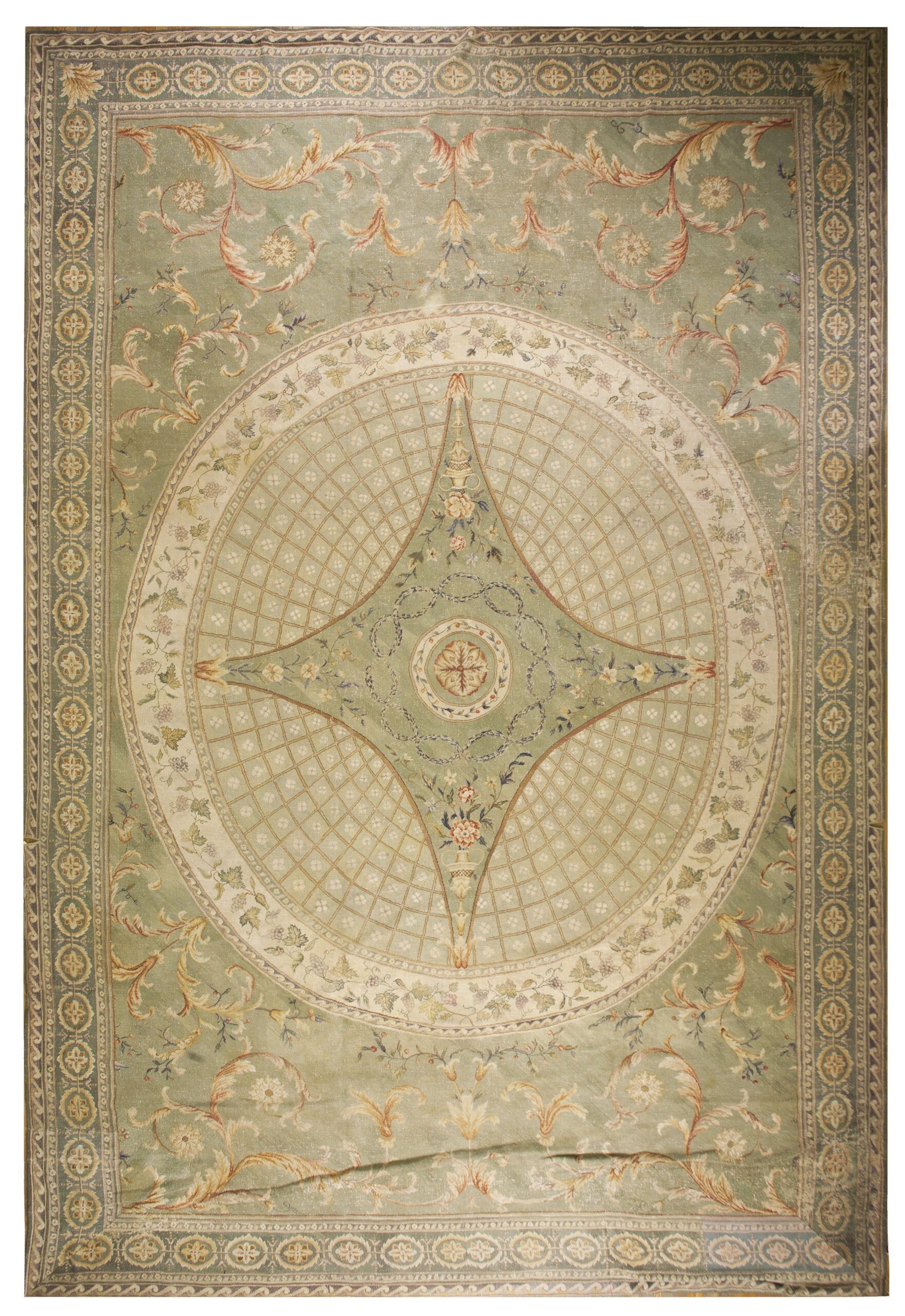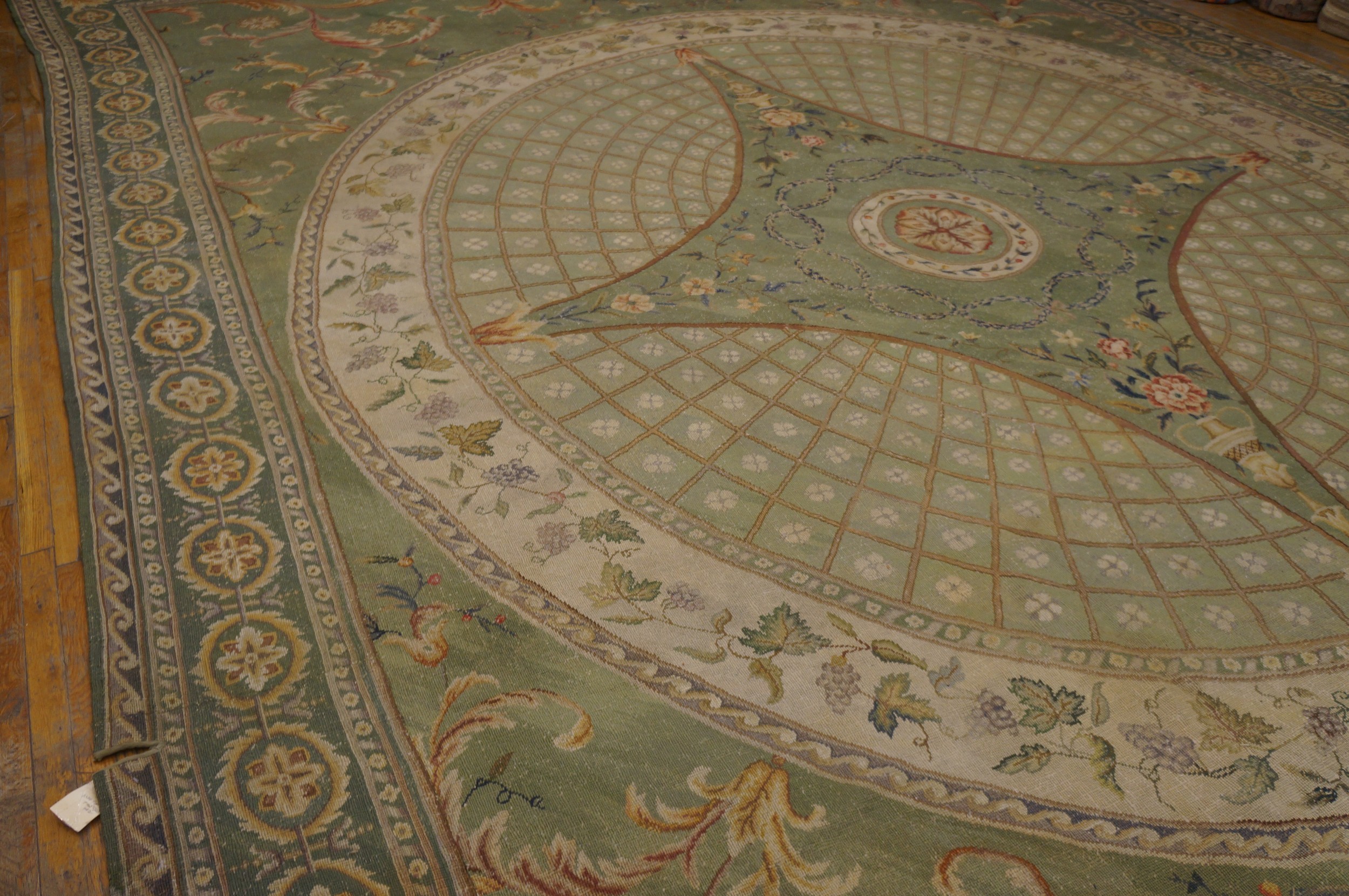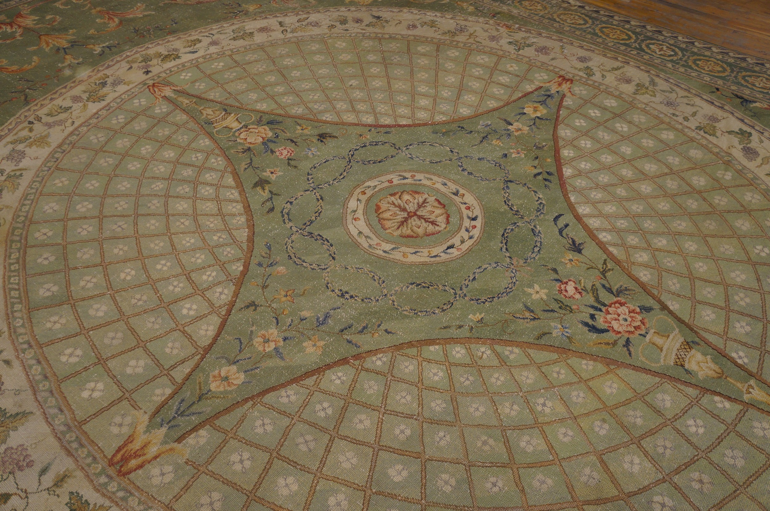 Dominating the composition is a monumental circular medallion, meticulously rendered with a delicate trellis pattern radiating from a central quatrefoil motif. This architectural structure, typical of English floor coverings designed to complement ceiling plasterwork, anchors the vast scale of the piece, ensuring visual balance across the expansive surface.