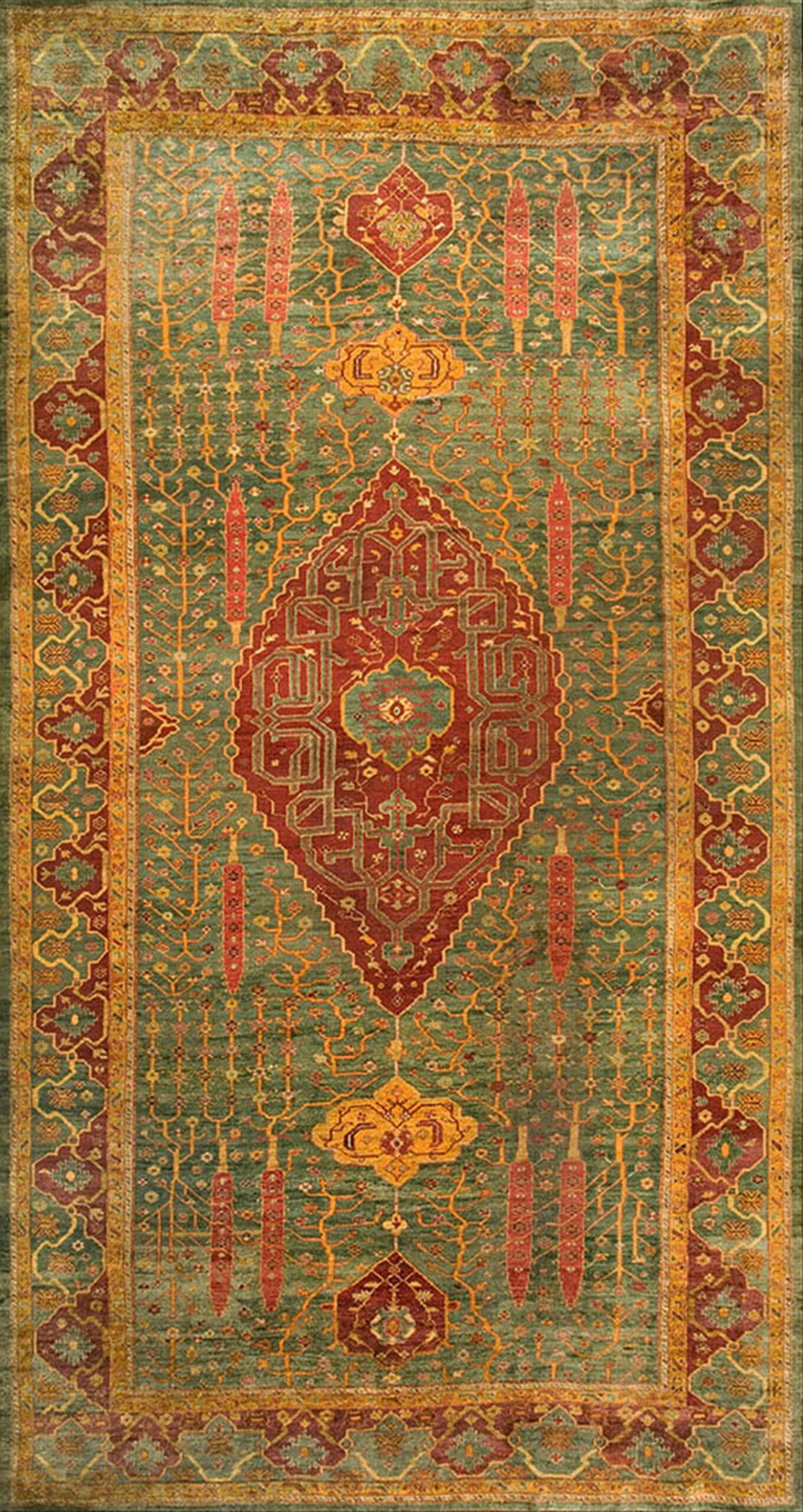 A striking, highly stylized central medallion anchors the composition. While incorporating traditional vine and palmette elements, the overall structure of the central motif leans toward the abstract, lending it the powerful symmetry often found in geometric rugs. Subtle, stylized Tree of Life elements emerge from the green field, rendered in fine yellow lines that articulate the complex underlying structure.