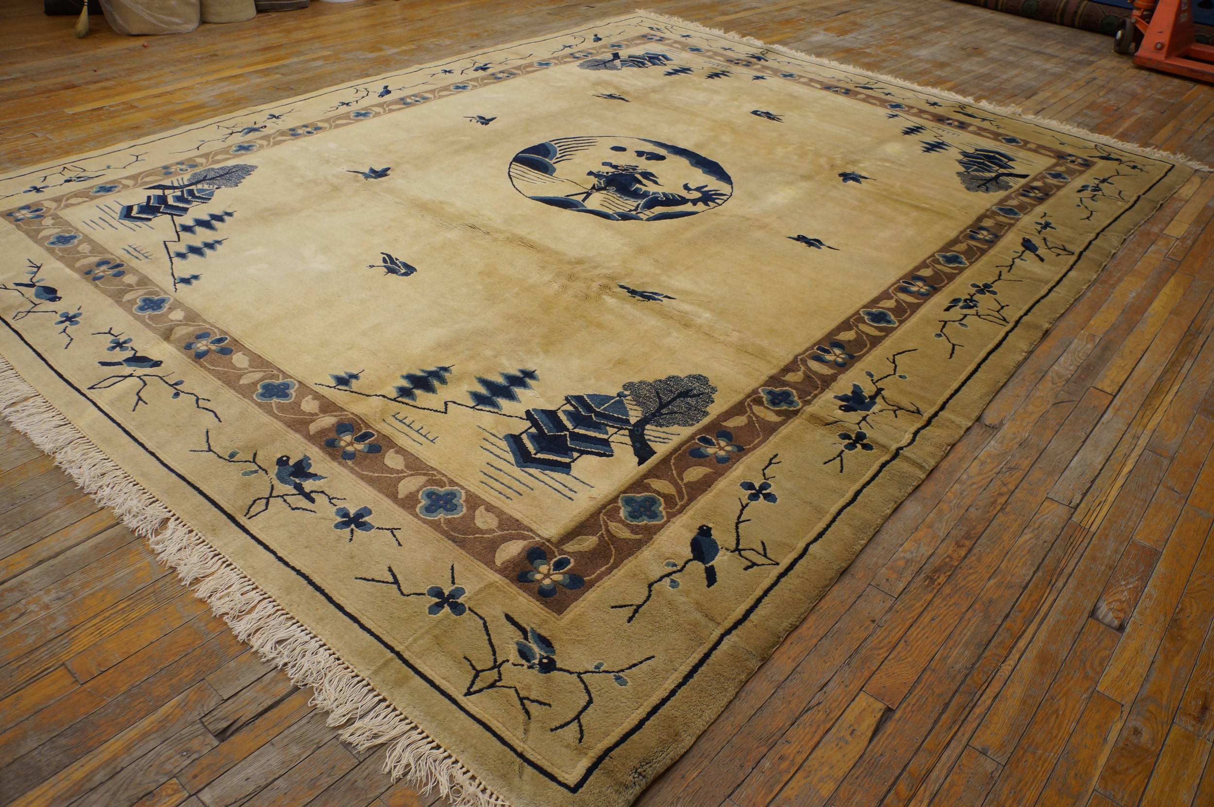 The composition is centered around a striking circular medallion depicting a mythological beast, possibly a Qilin or stylized dragon, rendered in deep navy blue. This central element is balanced by delicate, free-floating birds scattered across the main field, a characteristic feature of high-quality antique rugs from this period, emphasizing spaciousness and tranquility.