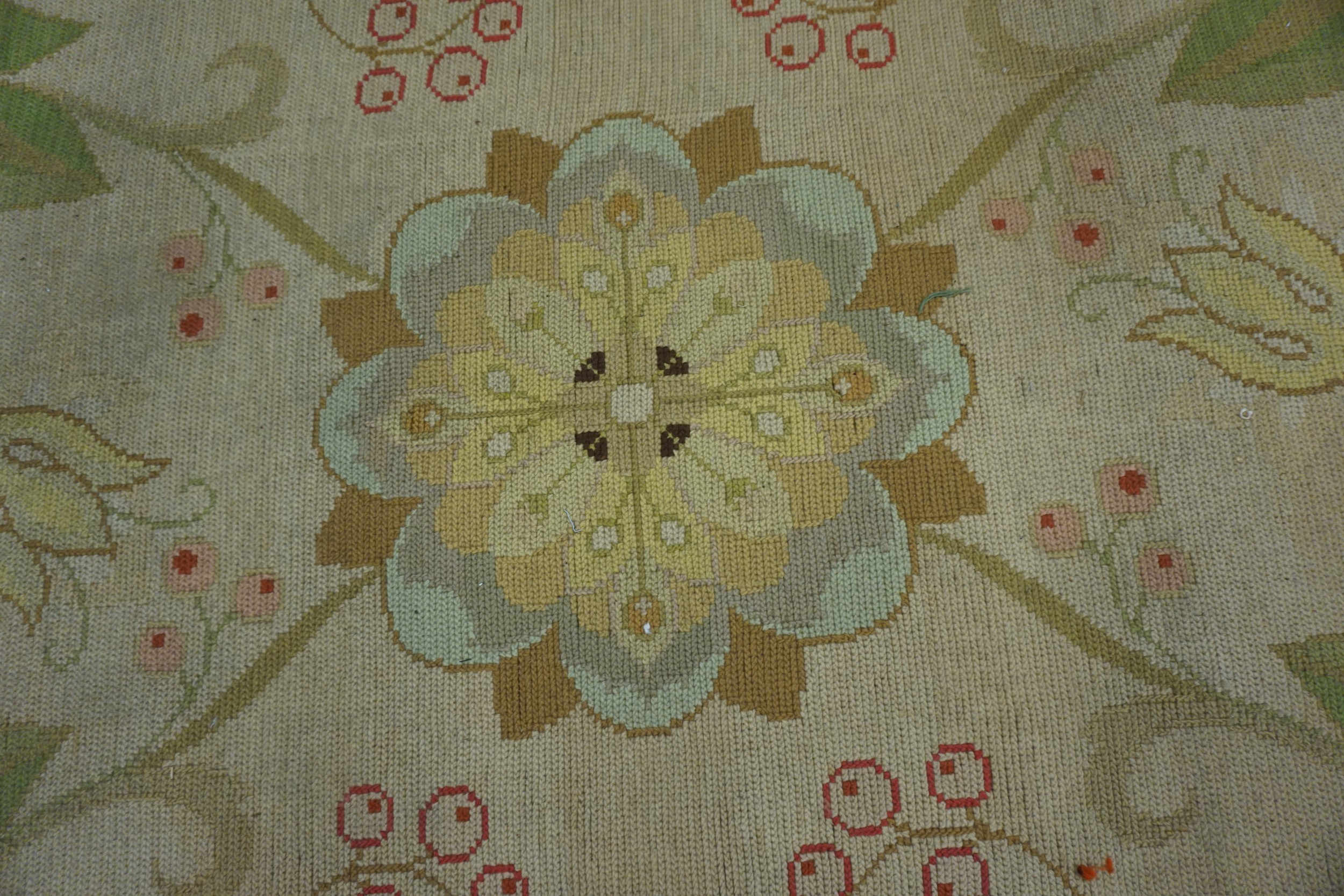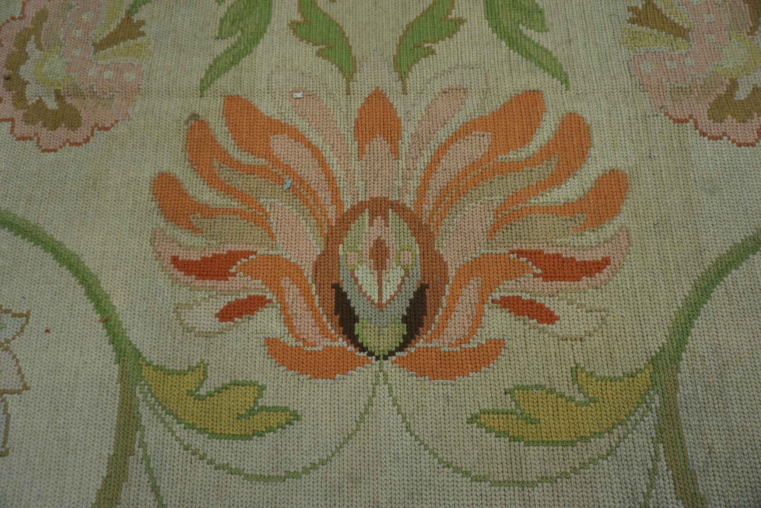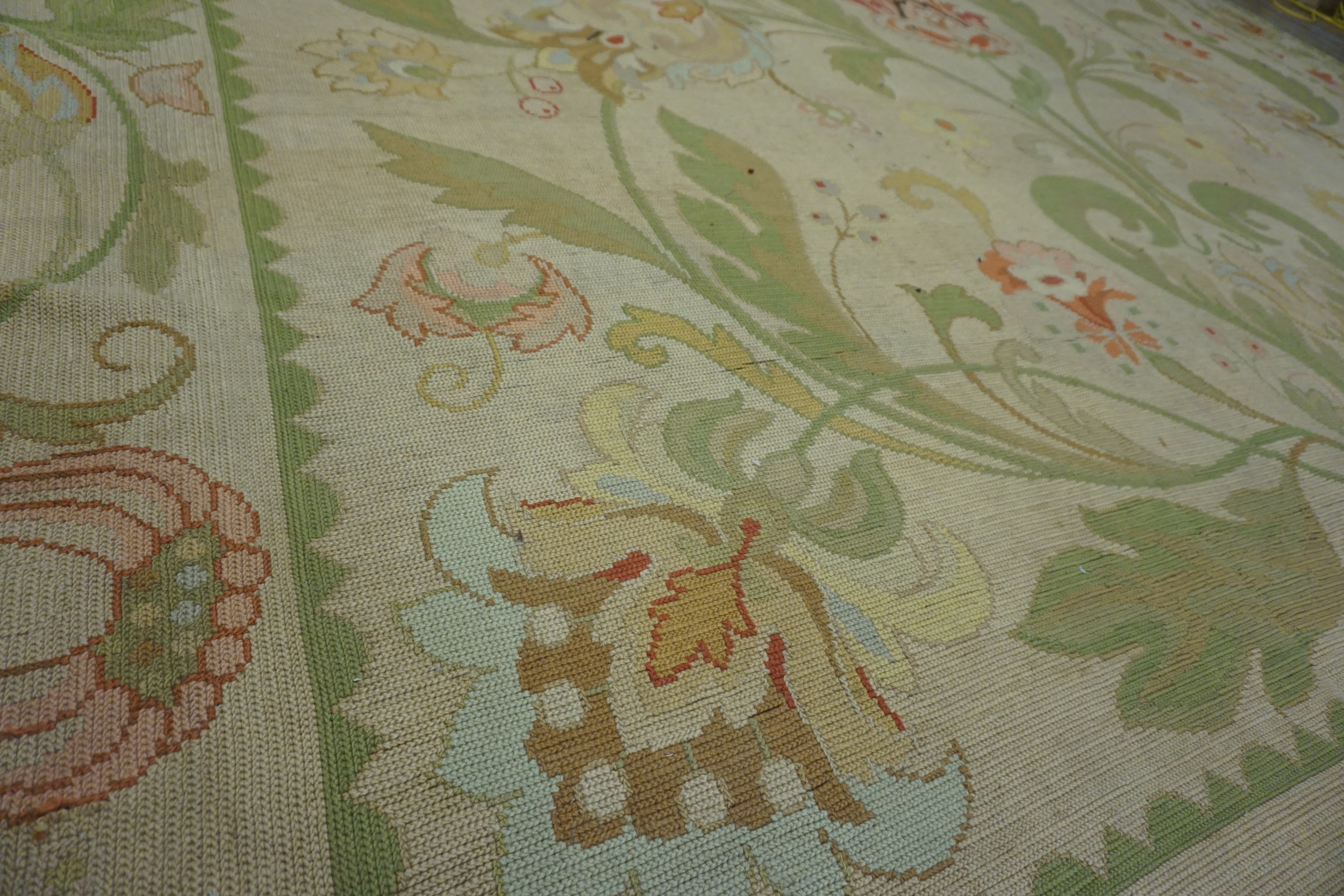 Beyond its aesthetic merit, the sheer scale of this piece makes it a significant decorative asset. Finding large oversized rugs from this period with such delicate European styling is rare. This textile is ideally suited to anchor a grand salon or formal dining room, offering both historical depth and a refreshing, light color story.
