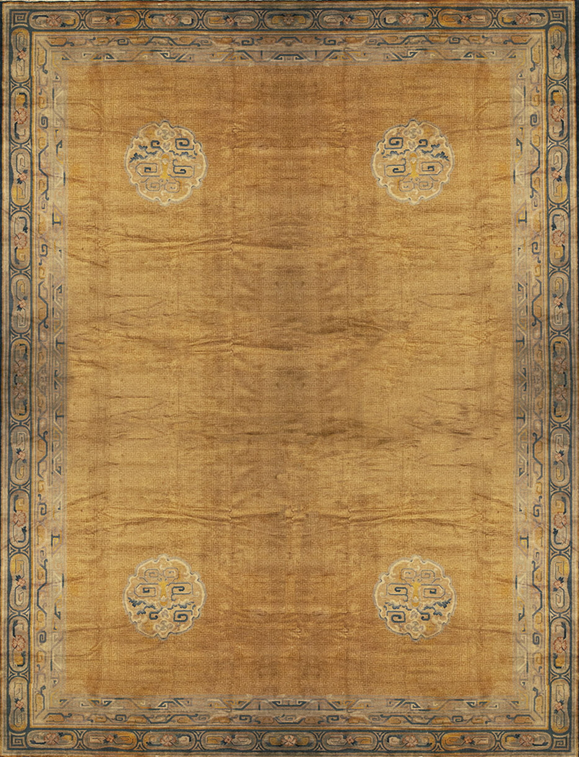 The rug’s impressive scale is defined by its oversized format, making it ideal for a formal drawing-room or a grand hall. The central field is dominated by a mesmerizing, subtly textured background rendered in a rich gold palette. This expansive color choice provides a sophisticated, luminous foundation, allowing the sparse, medallion-like motifs to float elegantly within the space.