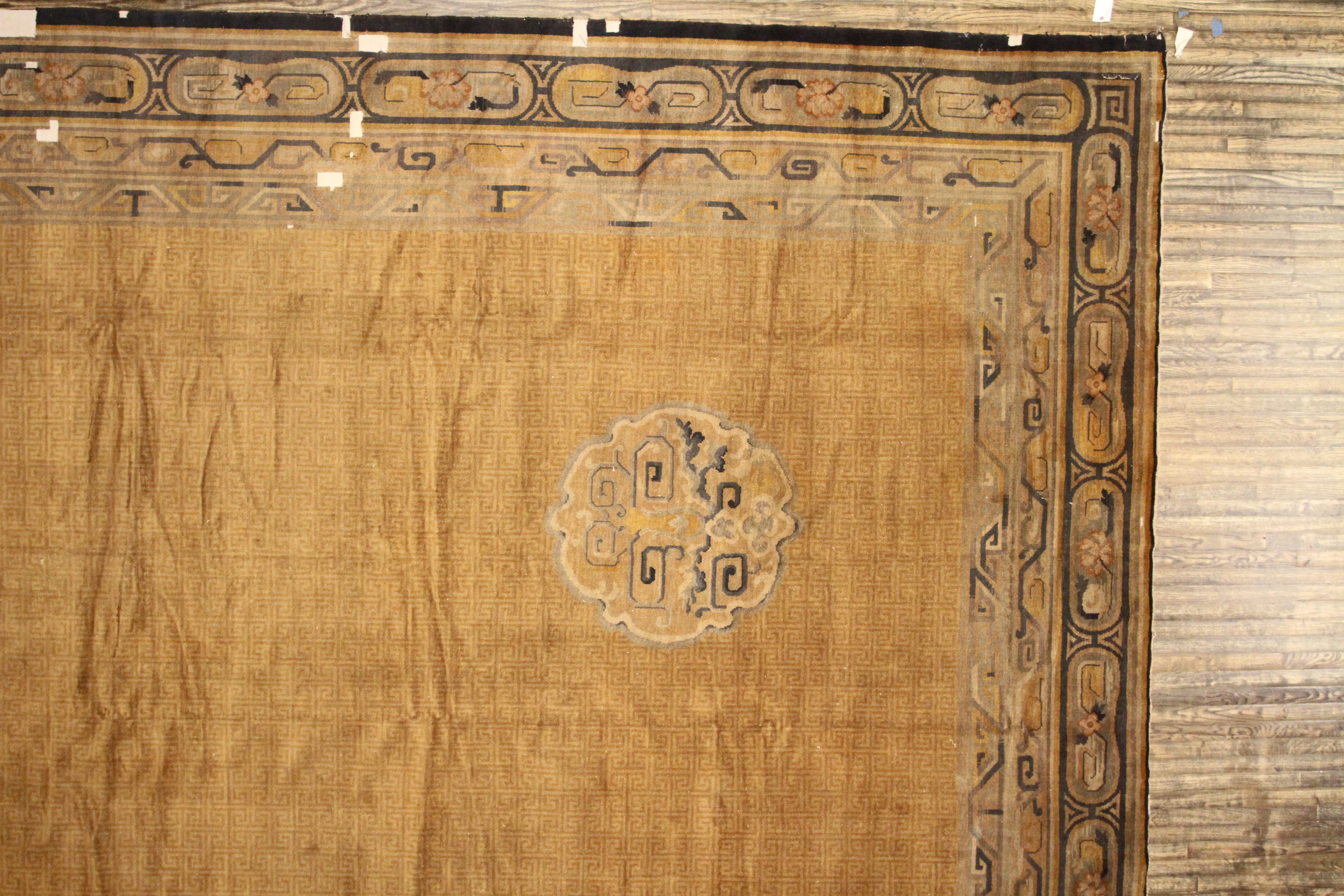 Originating from Austrian rugs workshops during the interwar period, this piece reflects a fascinating cross-pollination of classical European design and subtle Orientalist influences, particularly visible in the geometric meander pattern that covers the ground. The subtle, repeating fretwork adds depth without detracting from the overall minimalist grandeur of the composition.