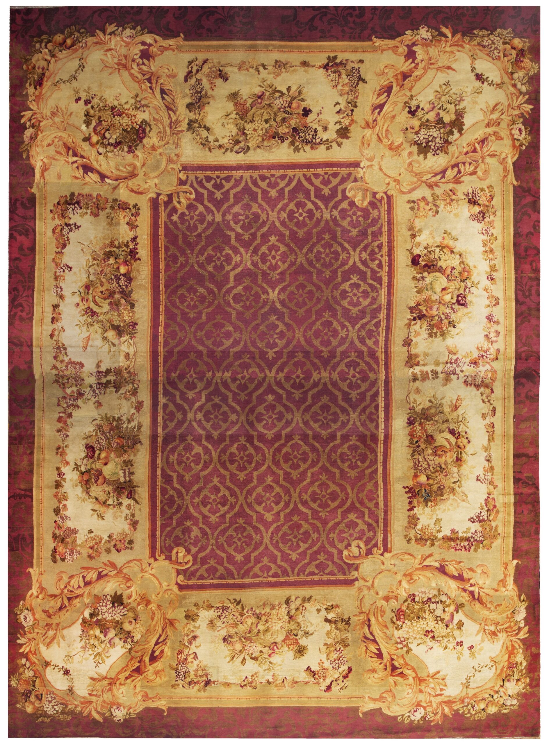Surrounding the geometric core is a wide, pale border defined by exquisite cartouches and abundant naturalistic elements. The highly detailed garlands of fruit and blossoms that frame the composition are characteristic of the best French weaving, distinguishing these pieces among other antique rugs.