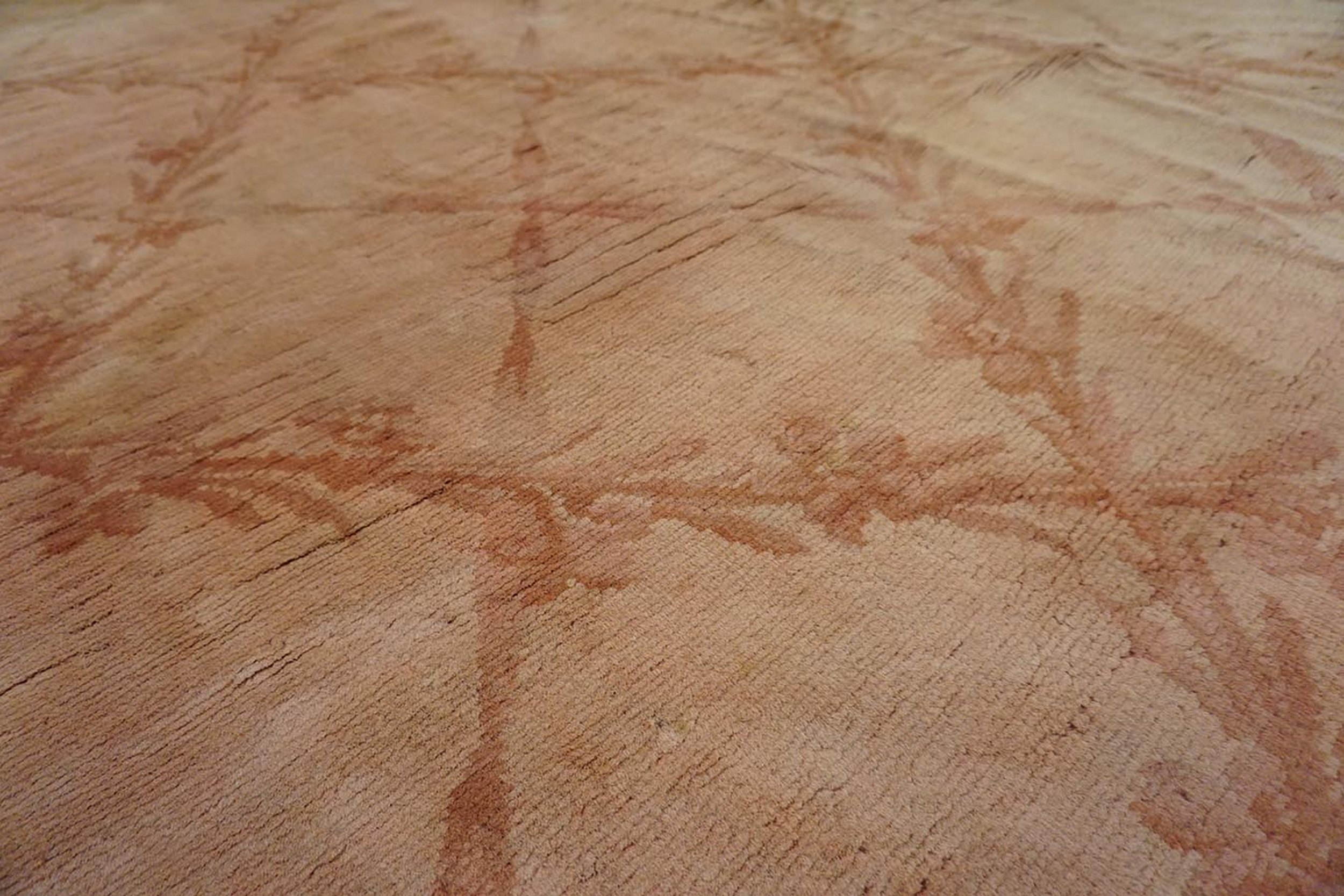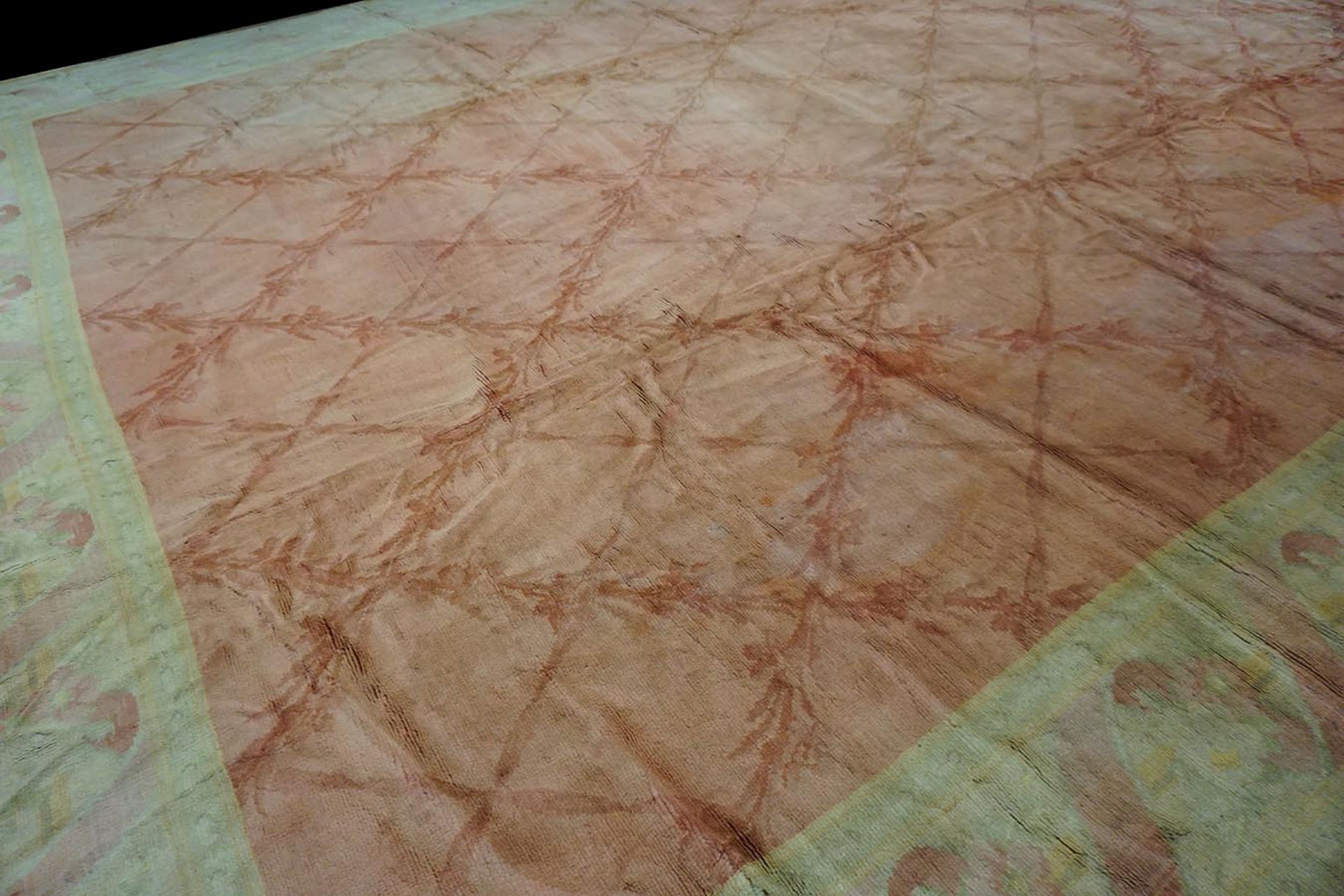 Antique Oversized Savonnerie French Allover Geometric Knotted Rug, Circa Date: 1900s. This magnificent example of French textile artistry captures the refined elegance of the Belle Époque era. The field is dominated by a gentle salmon hue, featuring a subtle trellis of stylized vines and delicate antique rugs woven into the design.