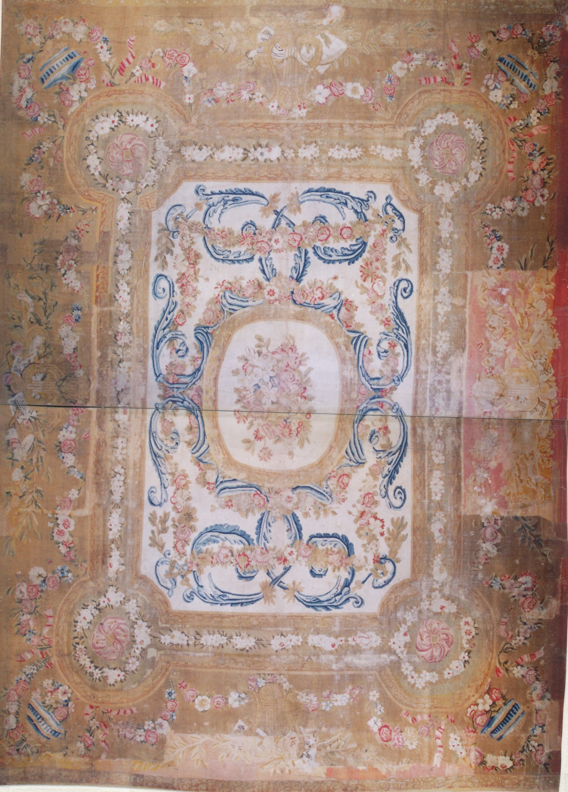 The design features a grand central medallion framed by intricate blue acanthus scrolls, characteristic of court commissions. The field utilizes a sophisticated palette, contrasting rich ochre tones with a luminous center of ivory beige cream, lending the piece an undeniable sense of regal elegance despite the profound wear of centuries.