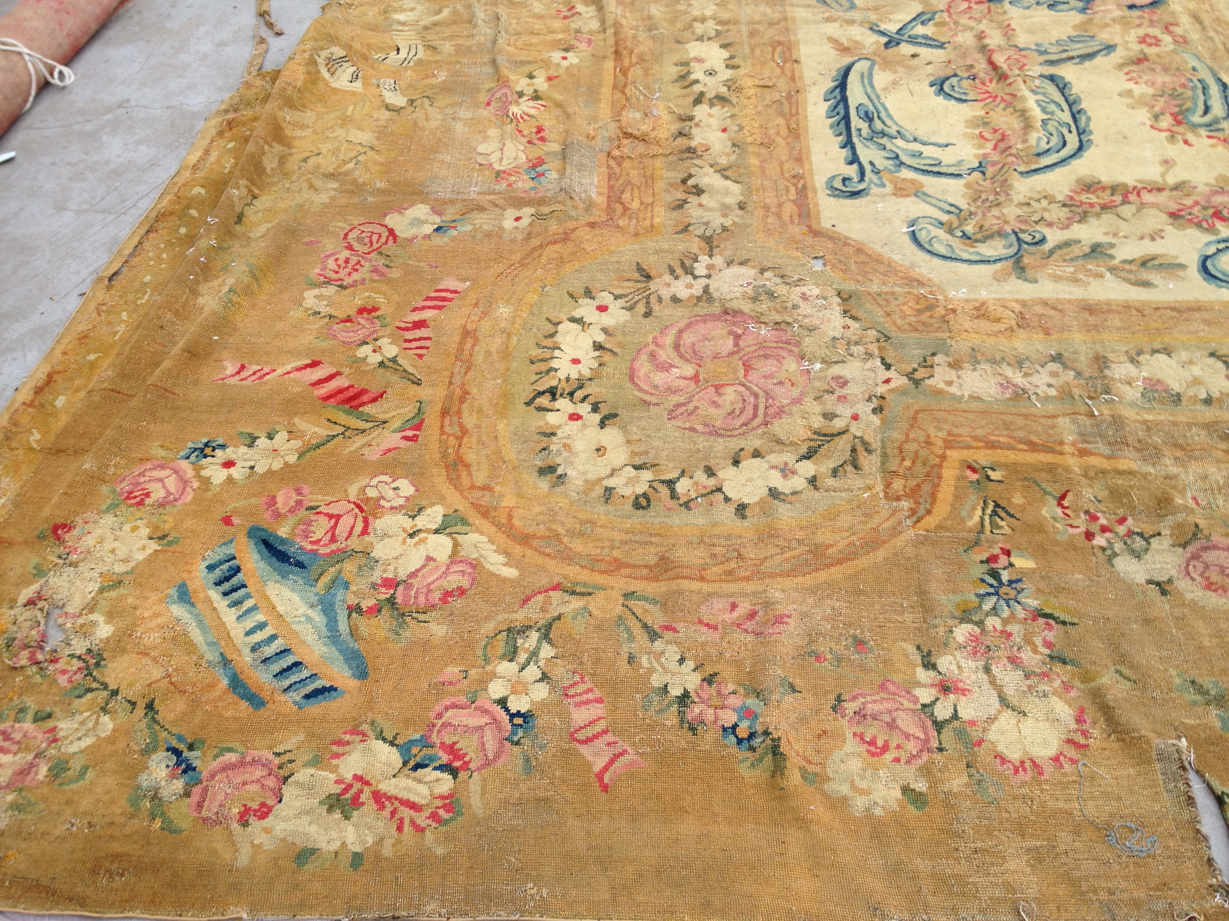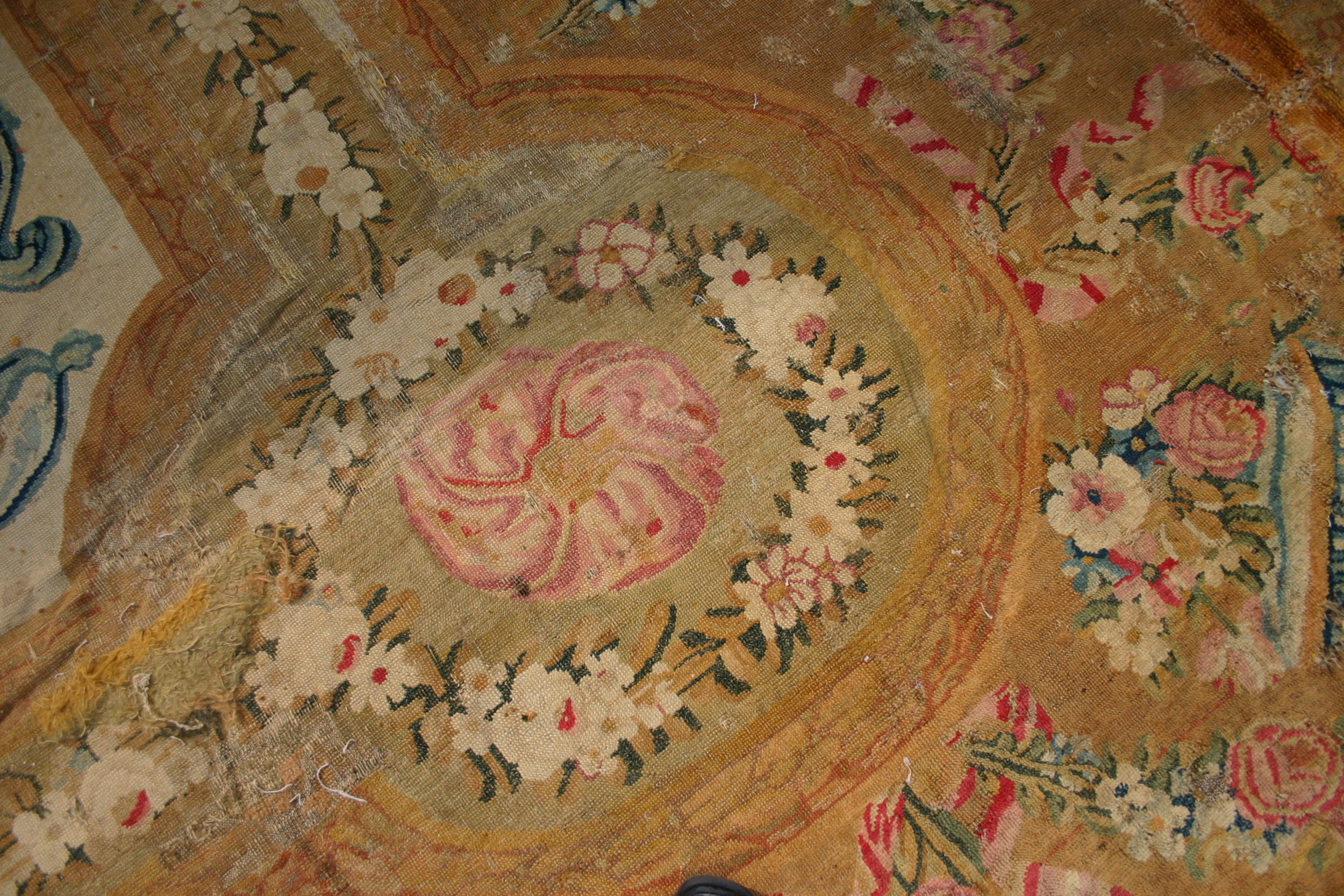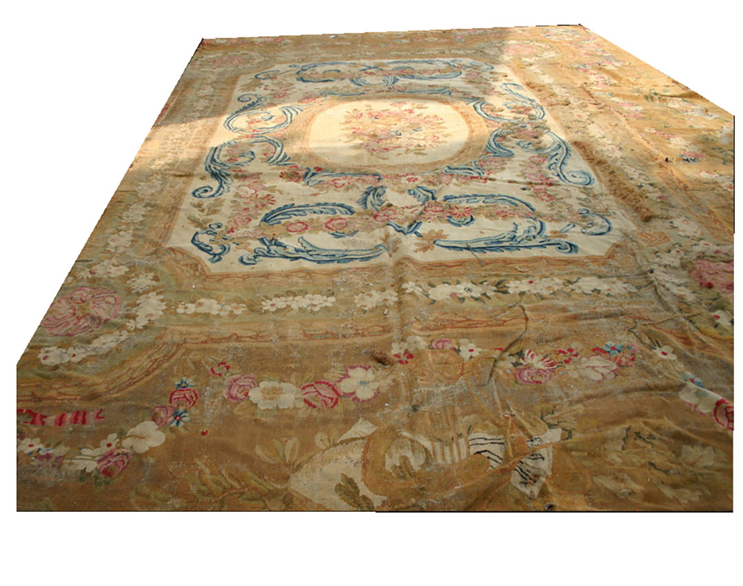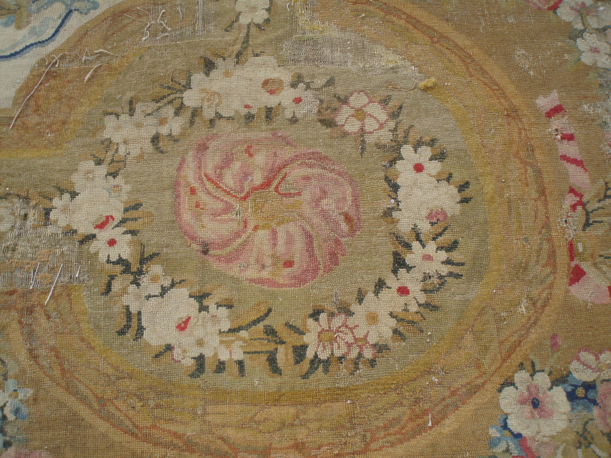 Though currently showing the profound patina of history, this textile remains a crucial historical document of the French weaving tradition. It is an invaluable example of early Savonnerie rugs, showcasing the technical skill and artistic ambition that defined the royal manufactories established under Louis XIV.