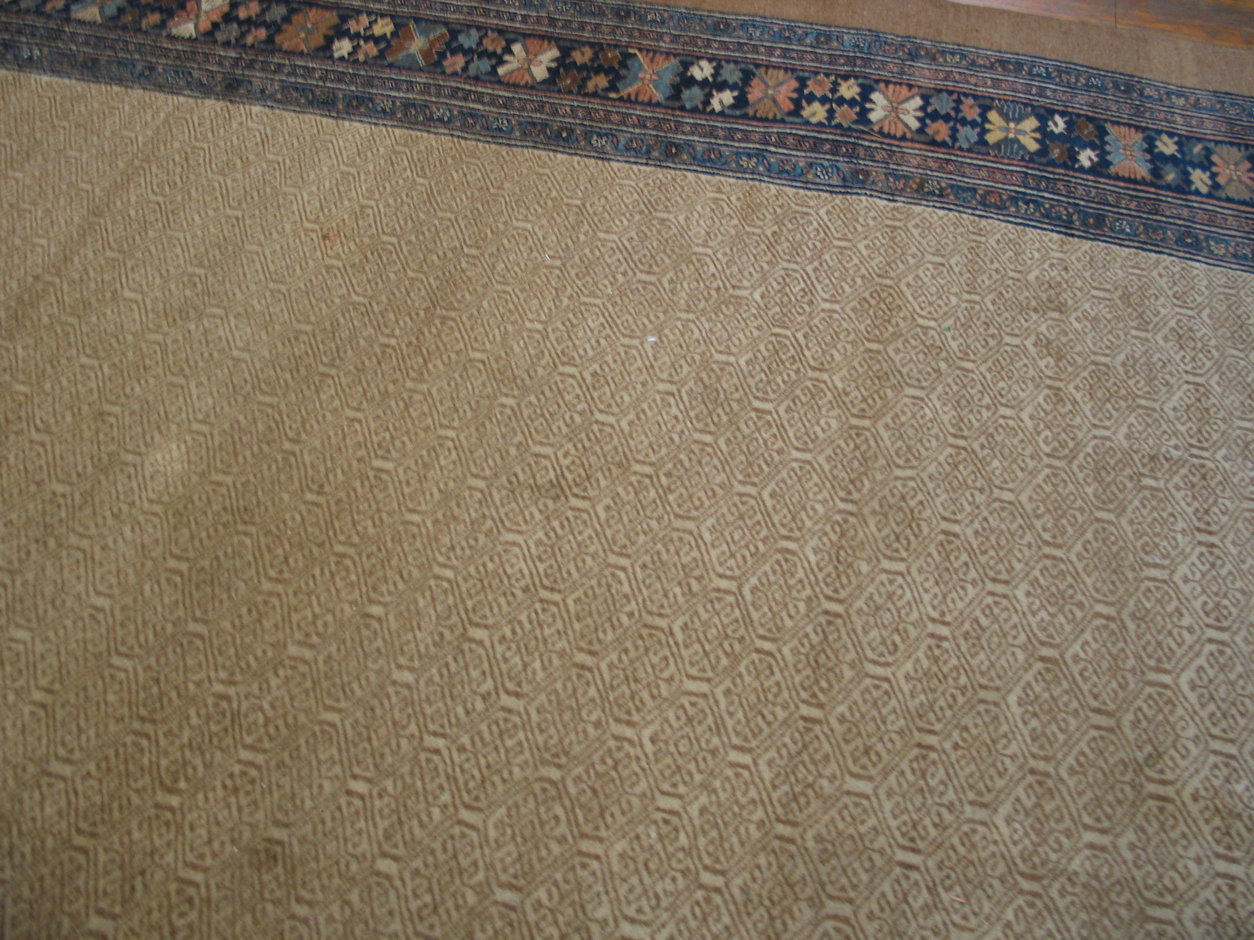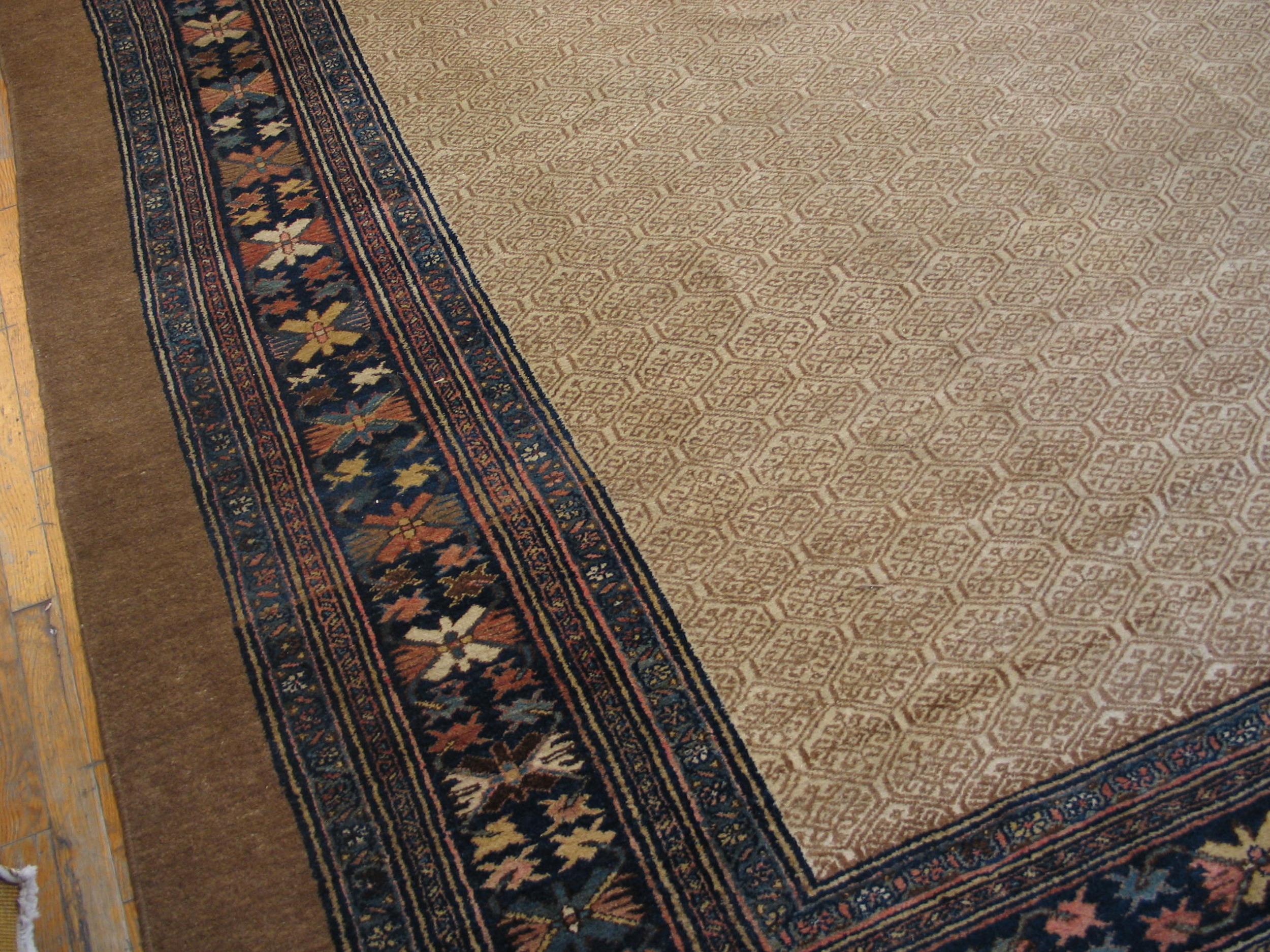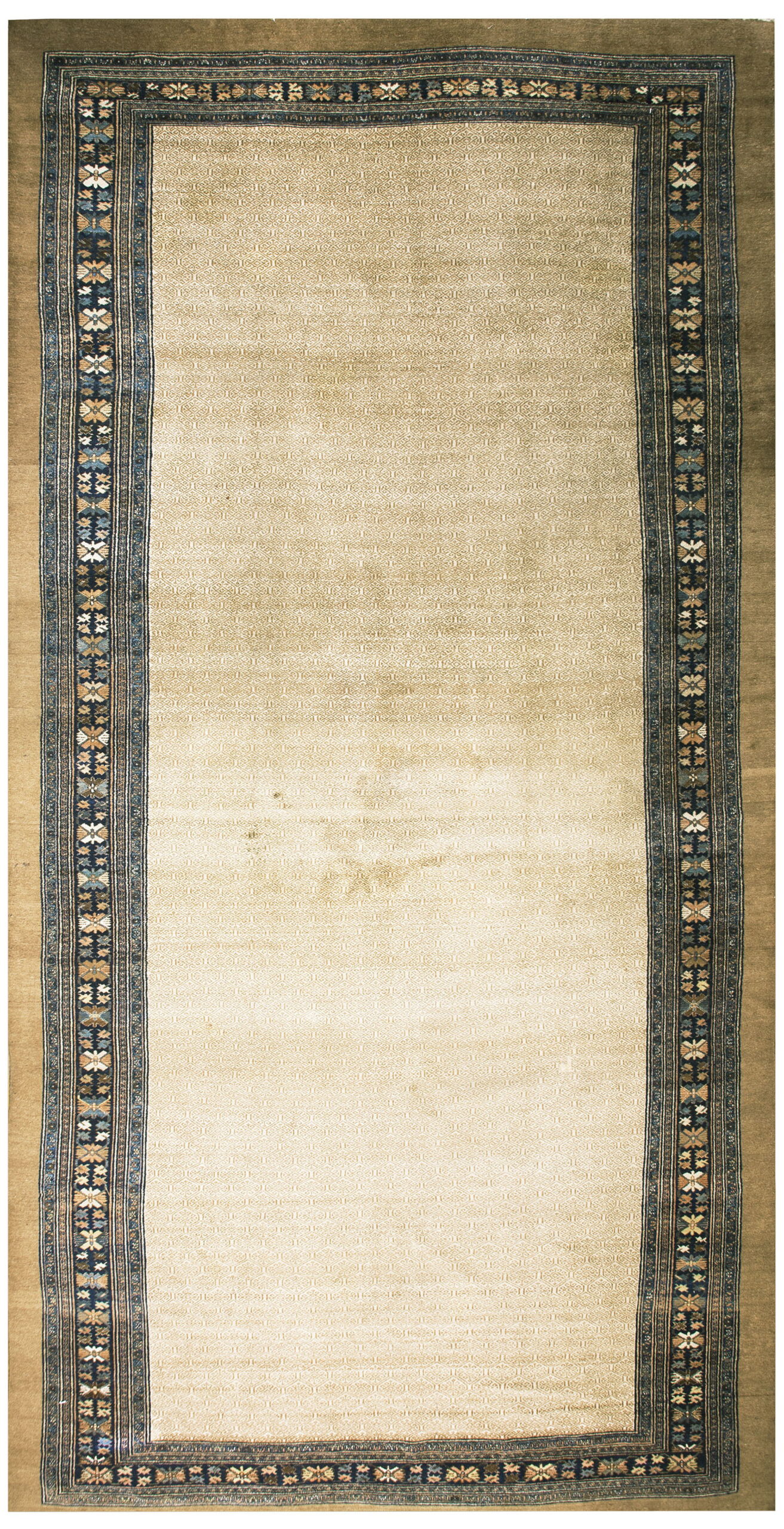 A striking contrast is provided by the deep indigo main border, which frames the light field with stylized floral and geometric medallions in muted earth tones and soft blues. This piece is a testament to the enduring quality of Iranian Persian rugs, offering both historical provenance and timeless design. View our complete collection of antique rugs to appreciate the depth of this craft.