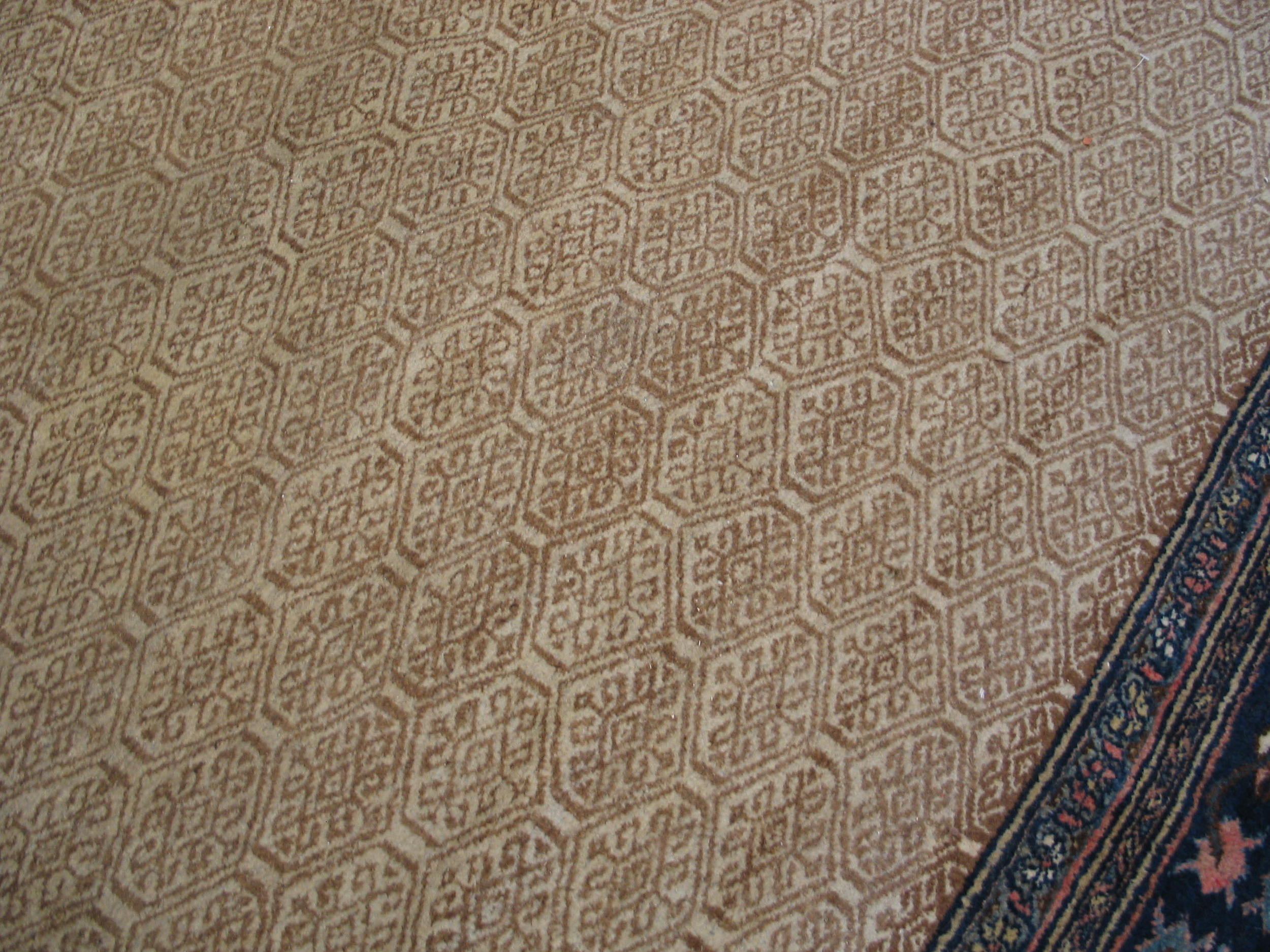 The expansive central field is rendered in a soft, luminous tone, characteristic of ivory beige cream coloration. This neutral expanse is subtly articulated by a delicate, repeating geometric lattice pattern, minimizing visual clutter and maximizing the sense of space. The use of natural dyes ensures a rich patina that only deepens with age.