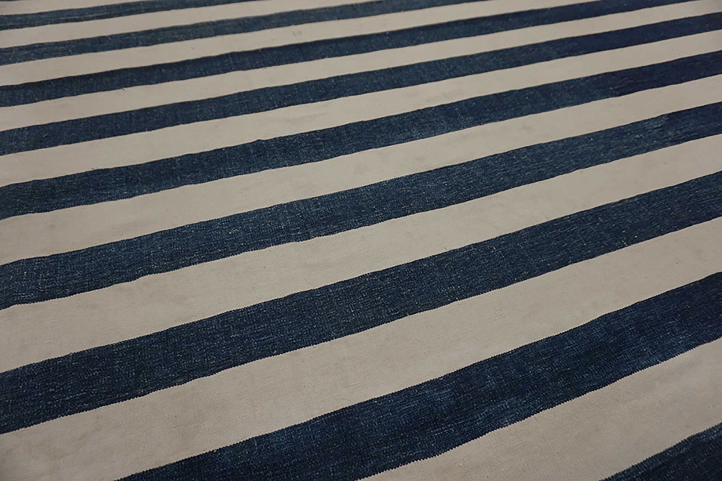The palette is defined by a crisp, high-contrast pairing of deep indigo blue and a warm, aged ivory beige cream. The natural fading and slight bleed evident in the indigo dye add a layer of organic texture, softening the geometric rigor of the stripes and providing a depth of character only found in textiles of this age.