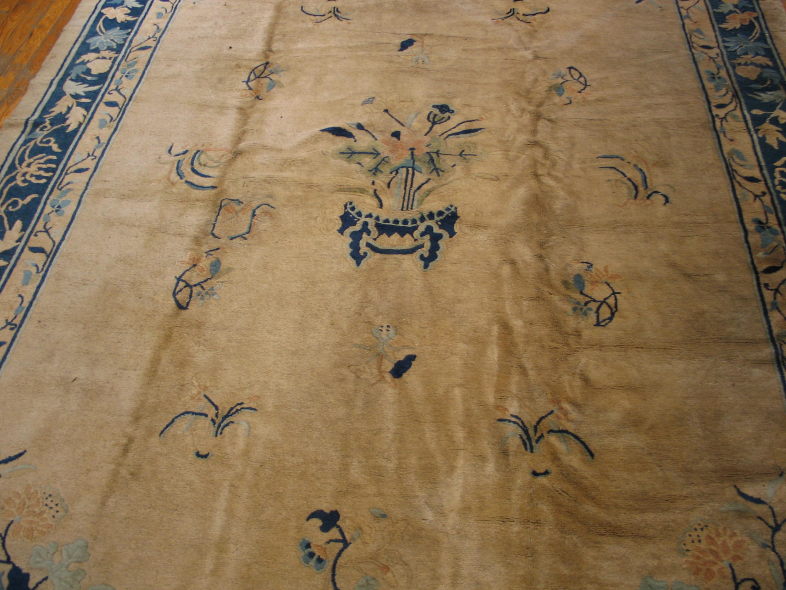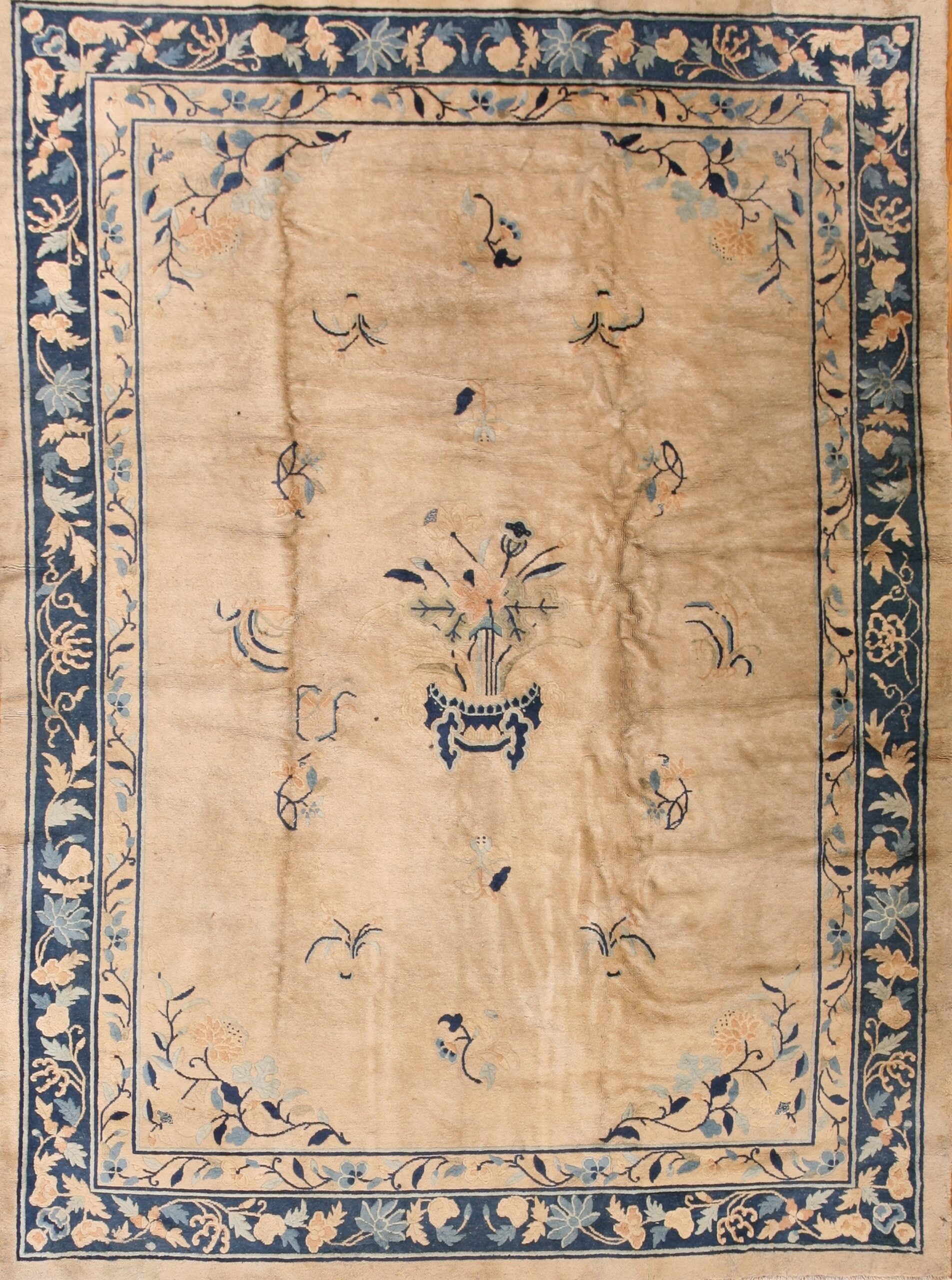 The design employs an open, almost minimalist approach, featuring scattered sprays and a stately central vase holding a bouquet of chrysanthemums and peonies. This spacious arrangement contrasts beautifully with the densely articulated border, which utilizes a rich indigo blue ground to highlight continuous scrolling vines. These pieces represent a distinct chapter in the history of oriental rugs.