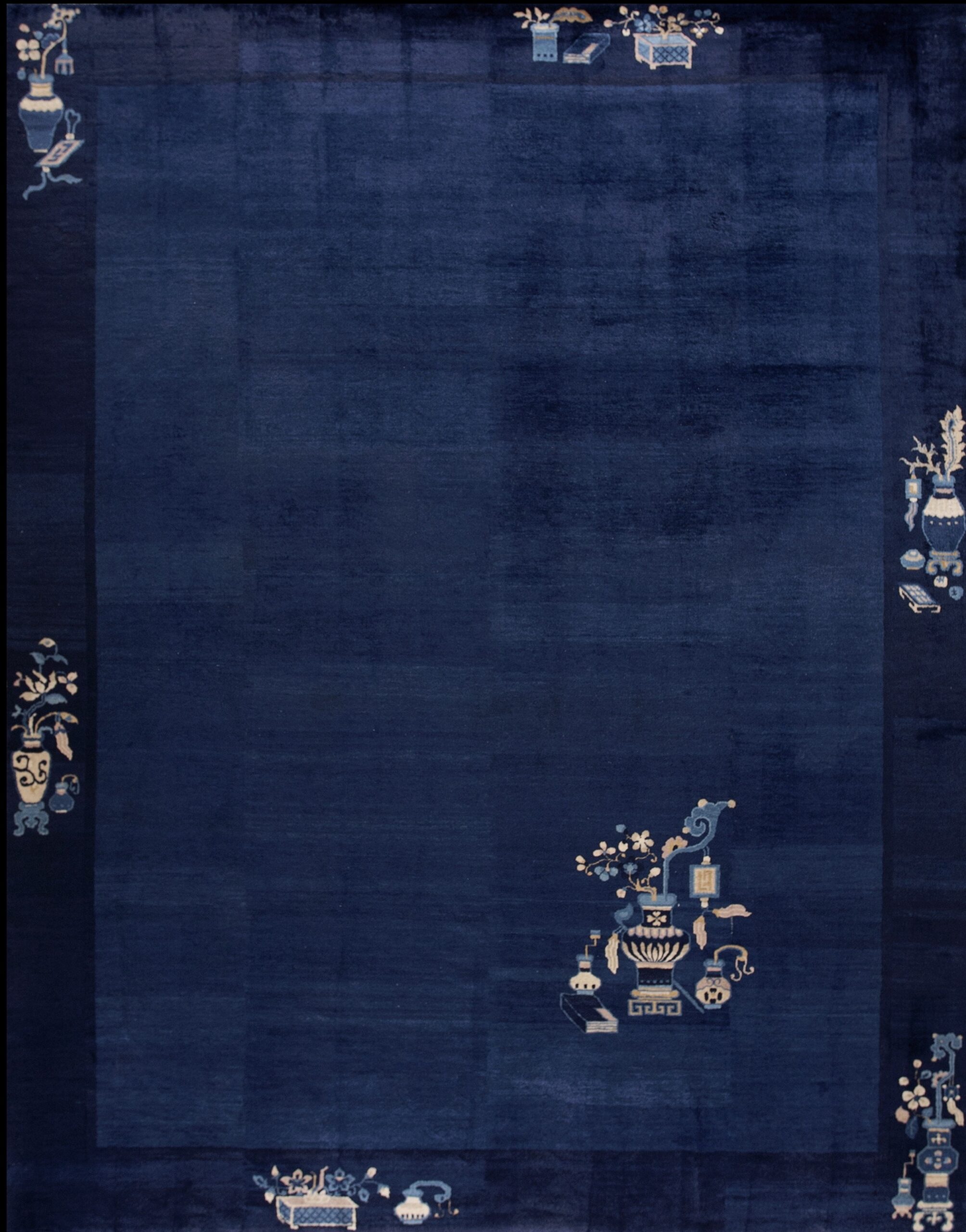 The “allover floral” description refers not to a repeating pattern across the center, but to the carefully placed corner spandrels and border cartouches featuring stylized vases, blossoming branches, and auspicious scholar’s objects. These delicate ivory and pale blue accents provide a stunning, restrained contrast against the dark ground, highlighting the precision of the knotting and the subtlety of the composition.