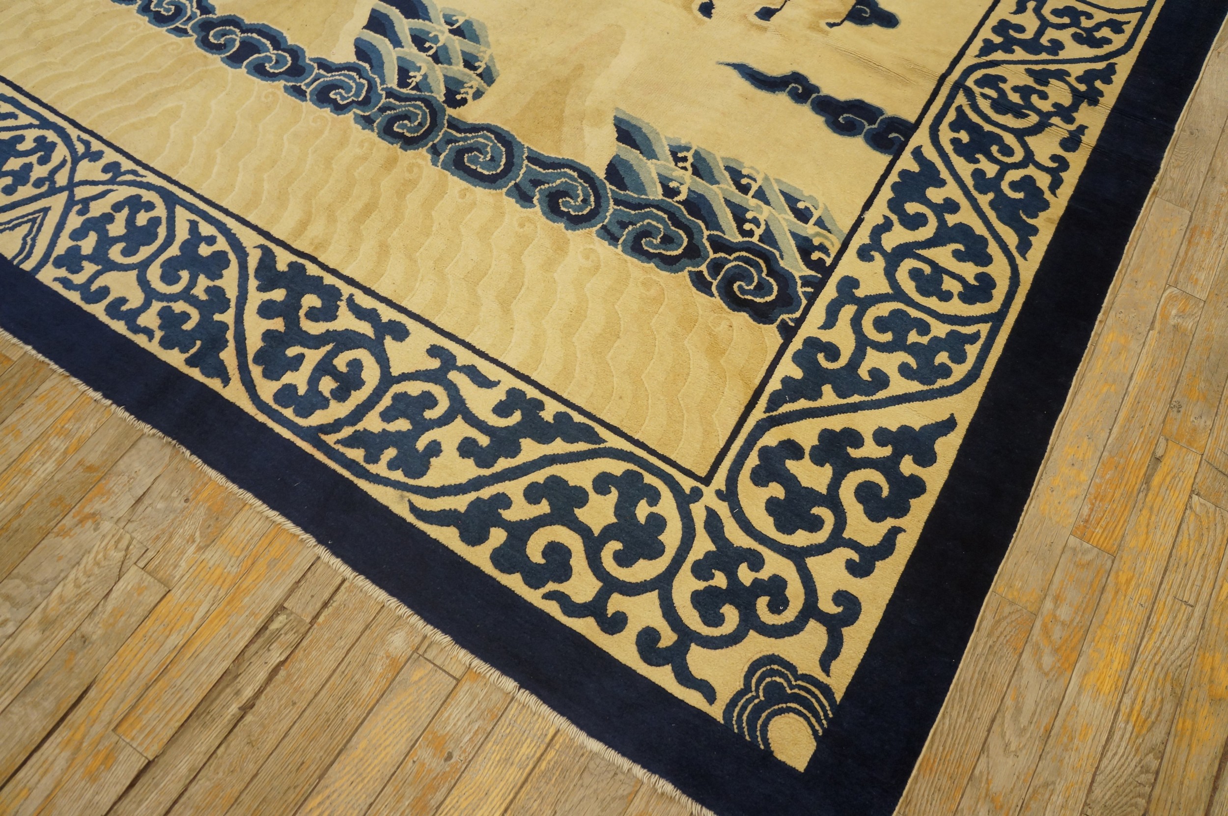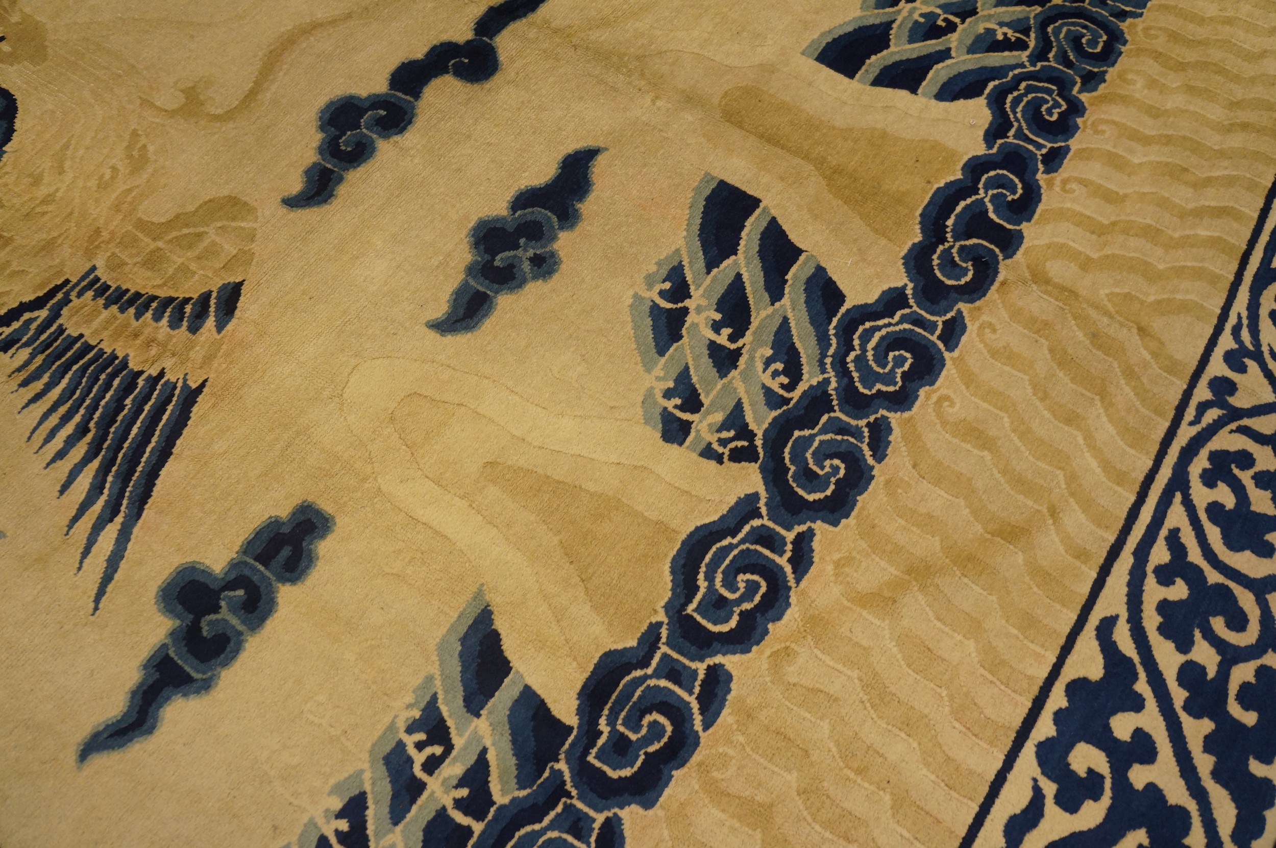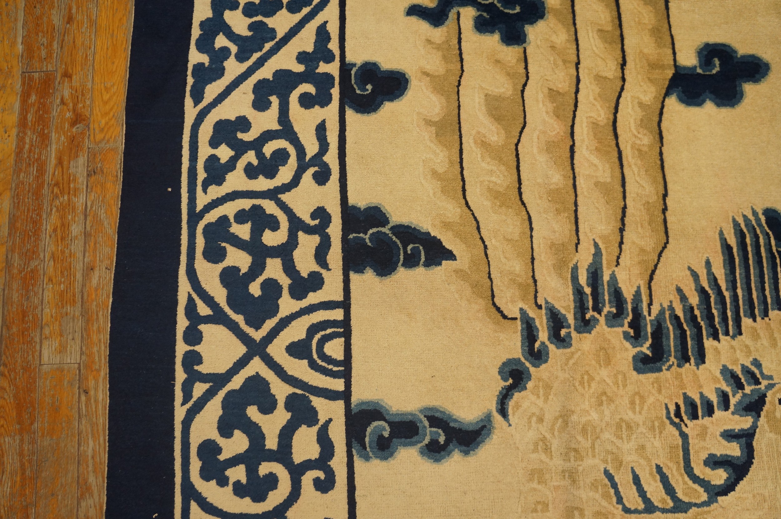 Antique Peking Chinese Allover Ivory 1890s Rug, Circa Date: 1890s. This exceptional late 19th-century Chinese Peking weaving represents the pinnacle of imperial-era textile art, offering a refined aesthetic that appeals to collectors of antique rugs. The composition is dominated by a striking contrast between the luminous, expansive ivory field and the deep indigo border and motifs.
