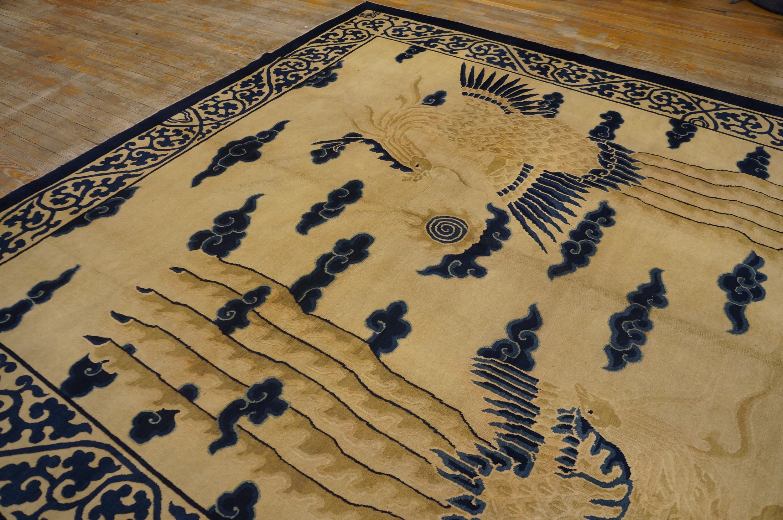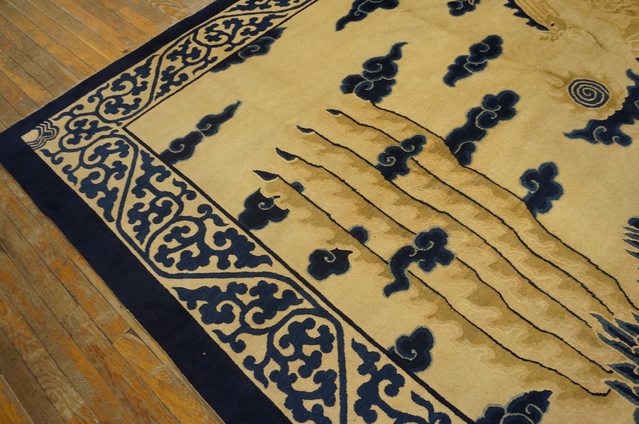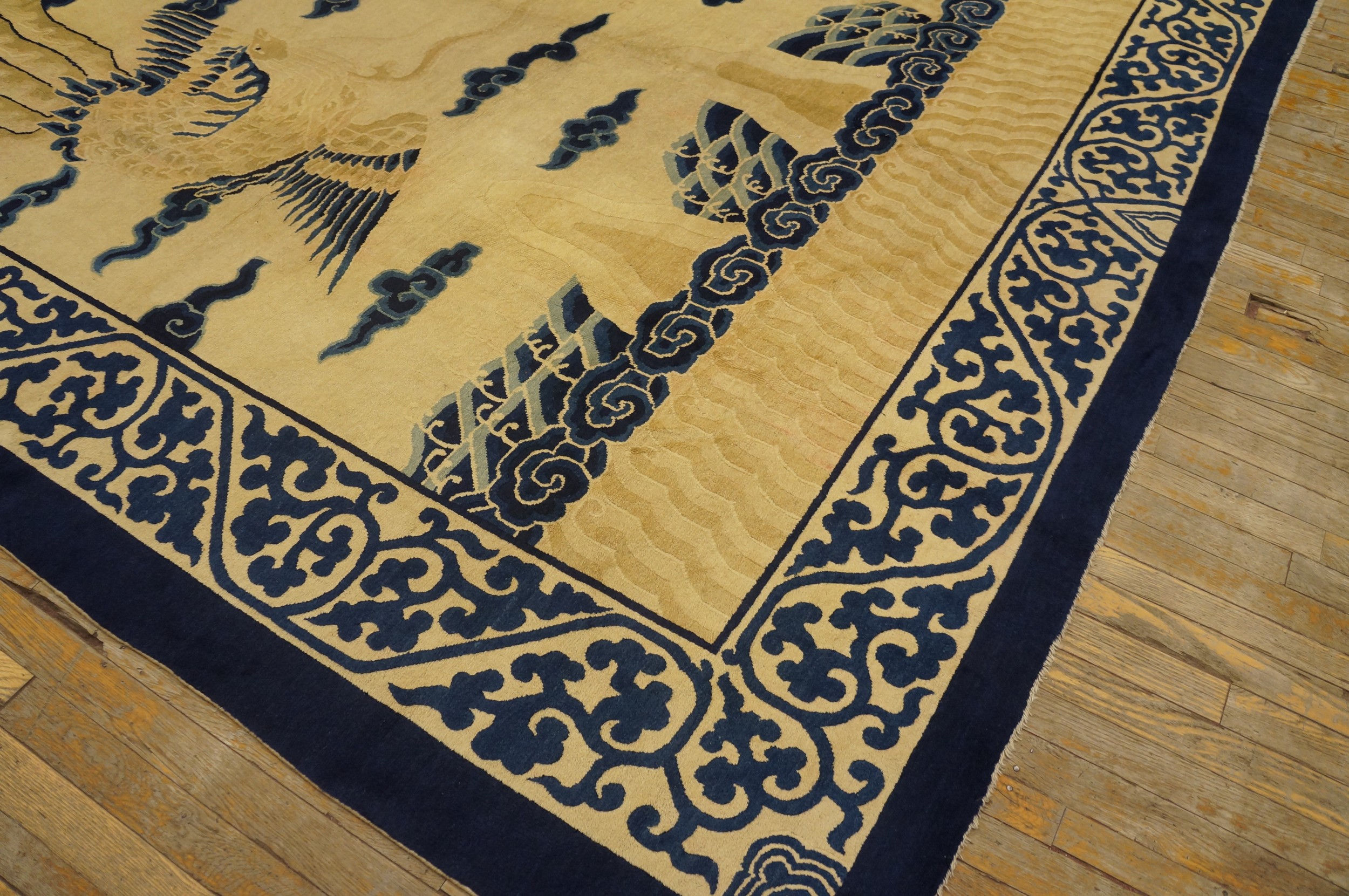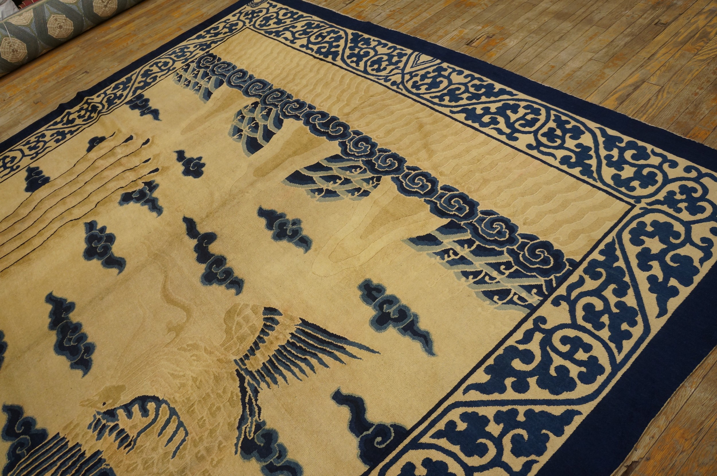 Antique Peking Chinese Allover Ivory 1890s Rug, Circa Date: 1890s. This exceptional late 19th-century Chinese Peking weaving represents the pinnacle of imperial-era textile art, offering a refined aesthetic that appeals to collectors of antique rugs. The composition is dominated by a striking contrast between the luminous, expansive ivory field and the deep indigo border and motifs.