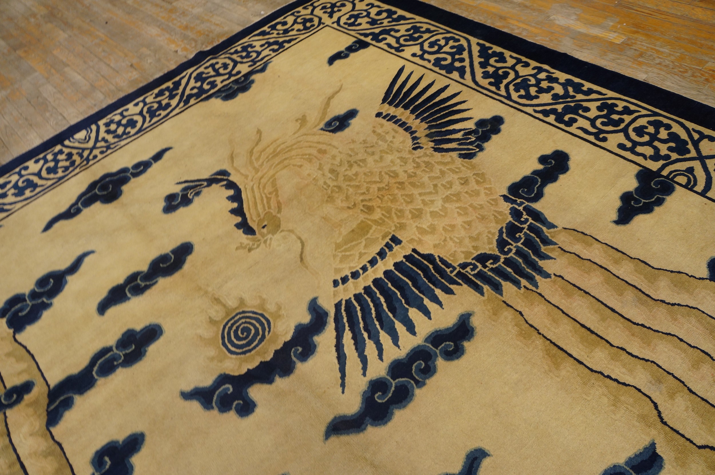 The central field utilizes a rich, saturated ivory color rugs palette, providing a perfect ethereal backdrop for the dramatic mythological scene. Two majestic Fenghuang (Chinese phoenixes) descend through a scattering of stylized navy blue clouds, symbolizing grace, prosperity, and the union of Yin and Yang.