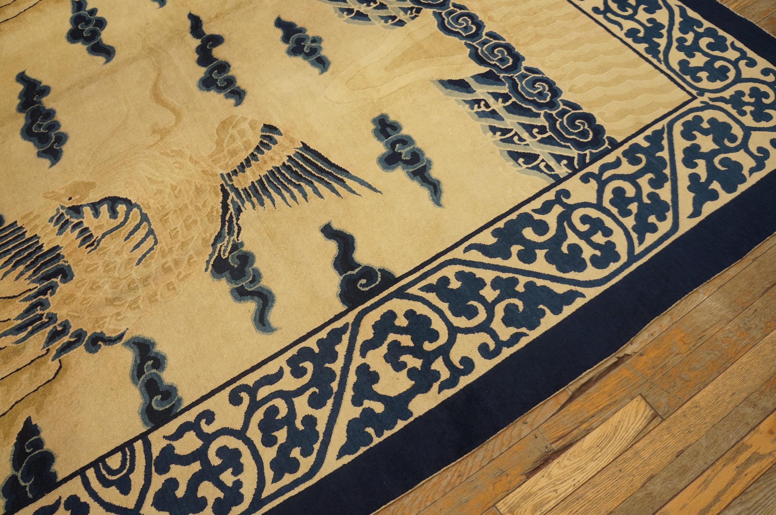 Below the soaring creatures, the design anchors itself upon stylized mountains rising from turbulent, foaming waves—a classic representation of the cosmic axis and the earthly realm. The powerful use of mythical creatures places this piece firmly within the tradition of sophisticated bird rugs woven for high-ranking officials or the court.