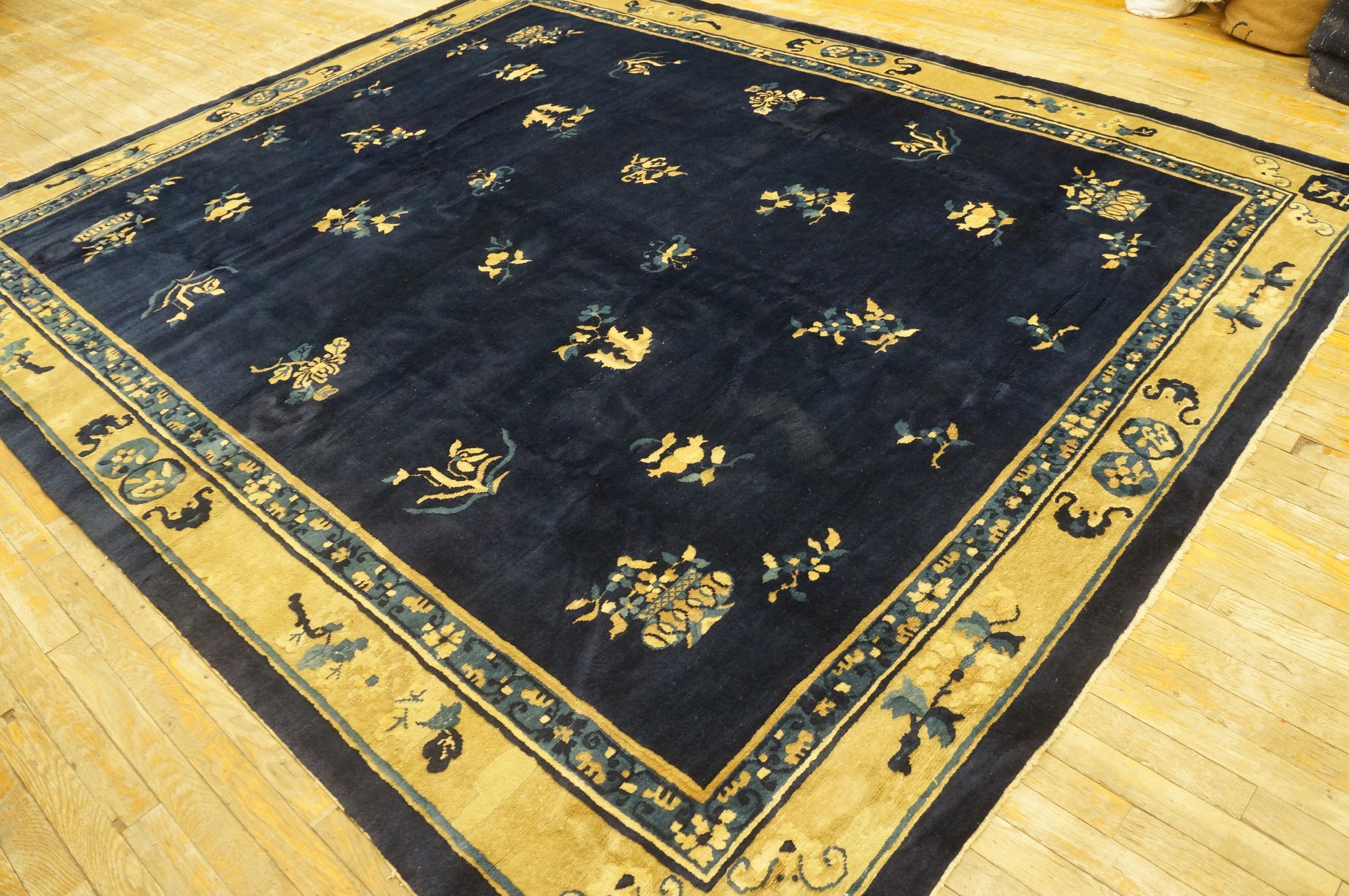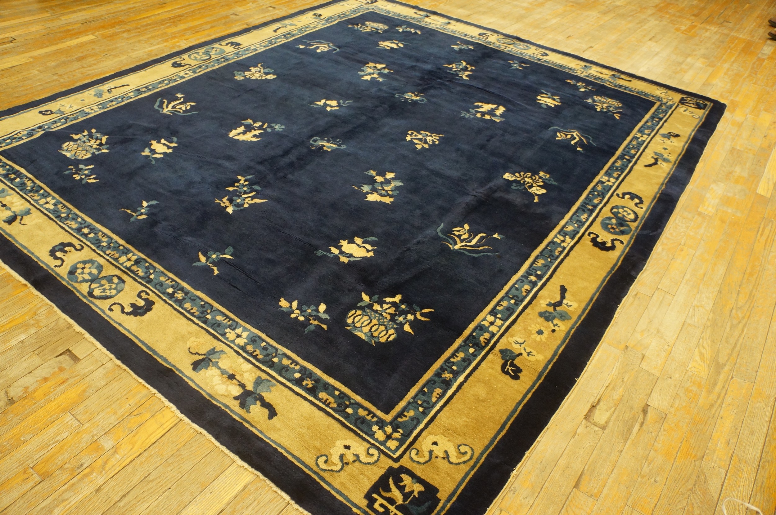 Antique Peking Chinese Floral Beige, Blue Navy 1930s Rug, Circa Date: 1930s. This exceptional Chinese Peking carpet captures the refined elegance typical of the Art Deco period, yet maintains a deep connection to classical Chinese symbolism. The choice of a dramatically saturated field distinguishes it among many antique rugs of the era, offering a luxurious foundation for any sophisticated interior.