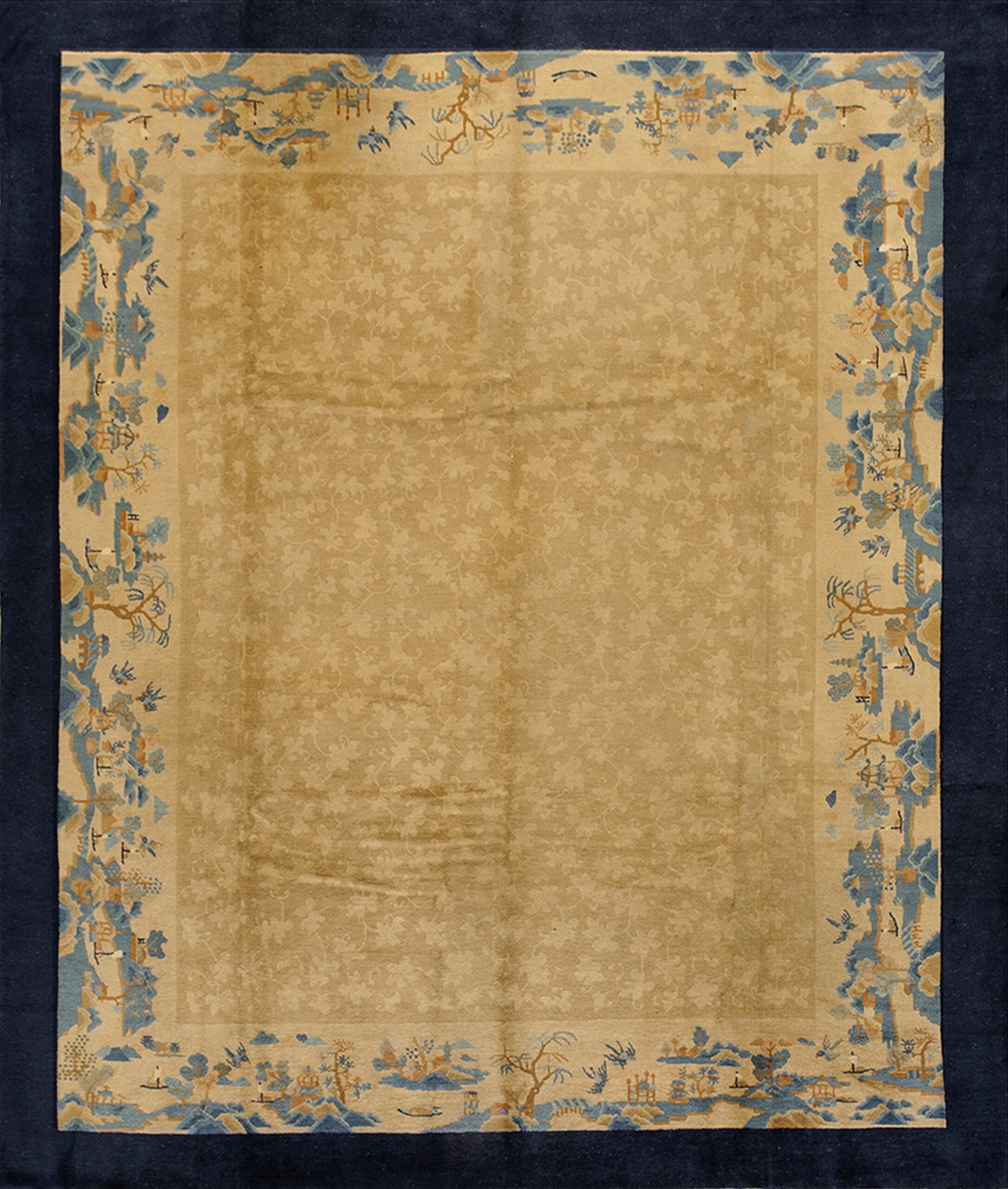Antique Peking Chinese Floral Blue, Ivory Beige Cream White 1920s Rug, Circa Date: 1920s. This exquisite example of Chinese Art Deco weaving captures the sophisticated aesthetic of the era. The vast central field is rendered in a warm, muted ivory and beige, featuring a subtle tone-on-tone floral pattern that speaks to the quality of these antique rugs.