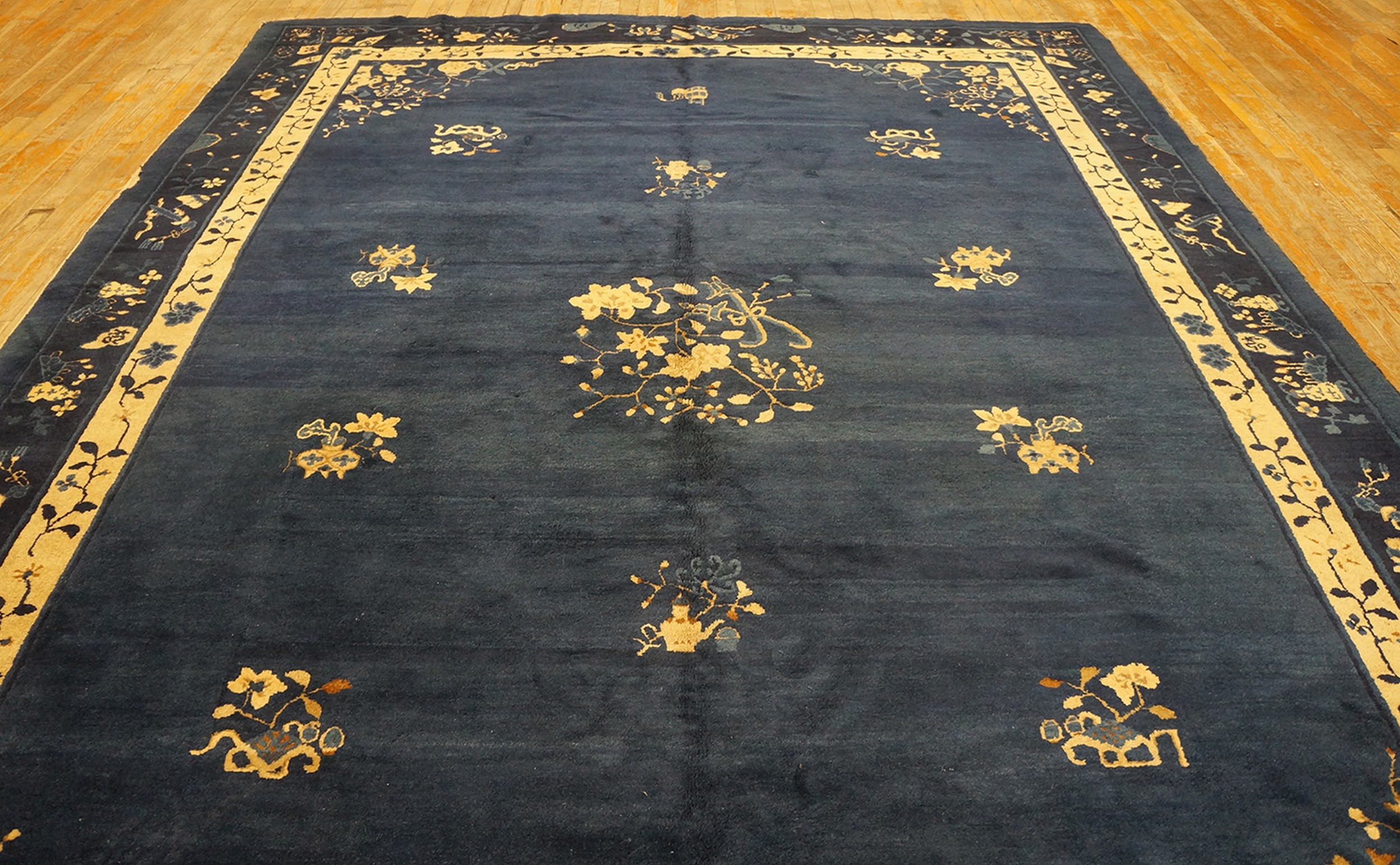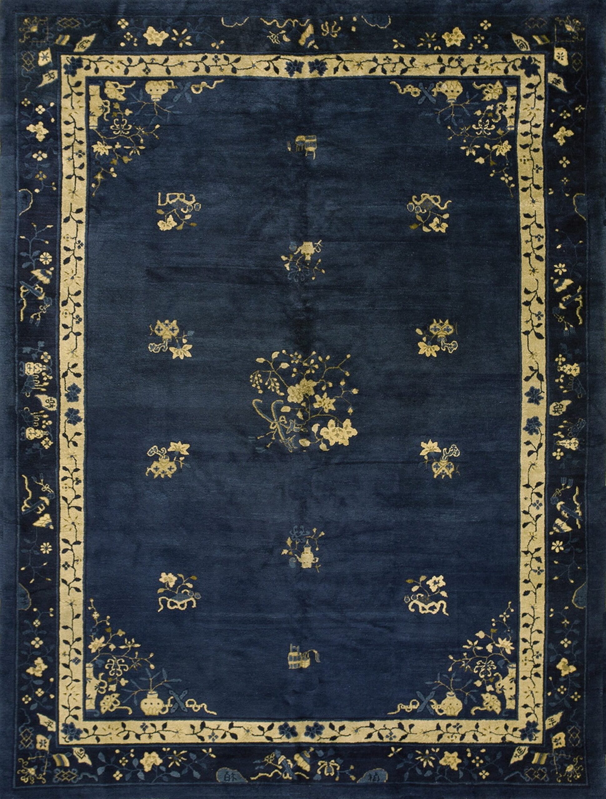 The field is intentionally sparse, allowing the deep indigo hue to dominate while emphasizing the finely rendered golden-ochre floral sprays. These stylized blossoms and symbolic vases are placed with careful asymmetry, reflecting the influence of traditional Chinese painting. The subtle shading and high-quality wool construction lend the surface a luxurious, almost velvety sheen, typical of antique rugs woven for export or the imperial court.