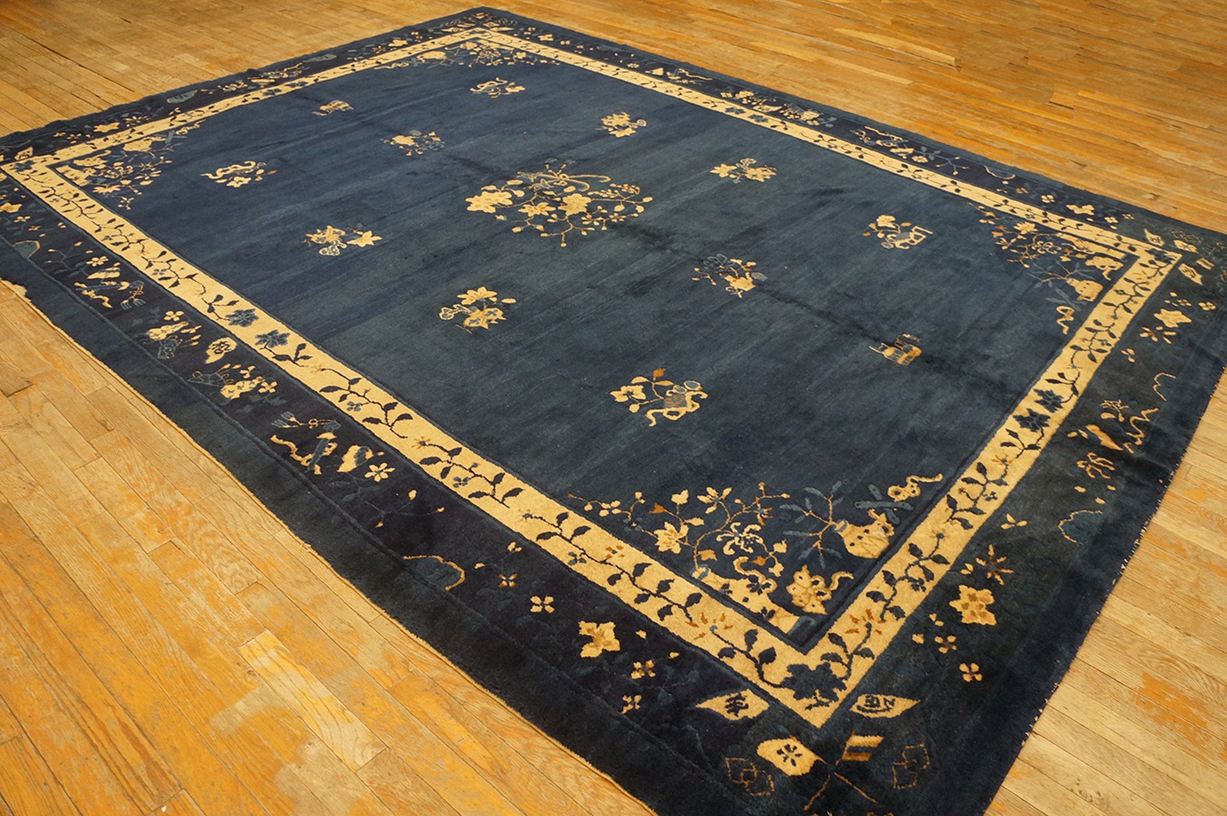 Antique Peking Chinese Floral Blue Navy 1900s Rug, Circa Date: 1900s. This exceptional example of early 20th-century Chinese weaving captures the restrained elegance characteristic of the Peking style. The design utilizes a strikingly saturated, near-navy field, a hallmark of the finest blue color rugs from this period, which serves as a dramatic backdrop for the delicate, scattered motifs.