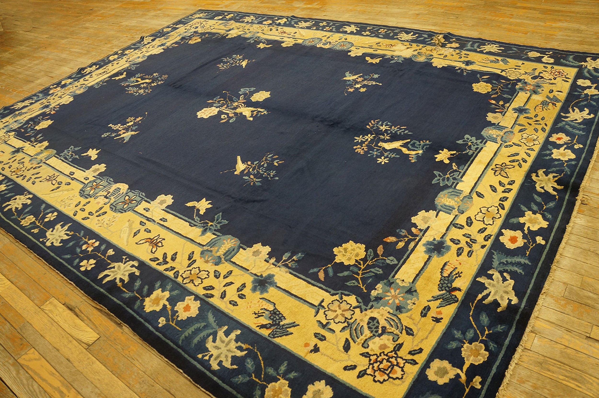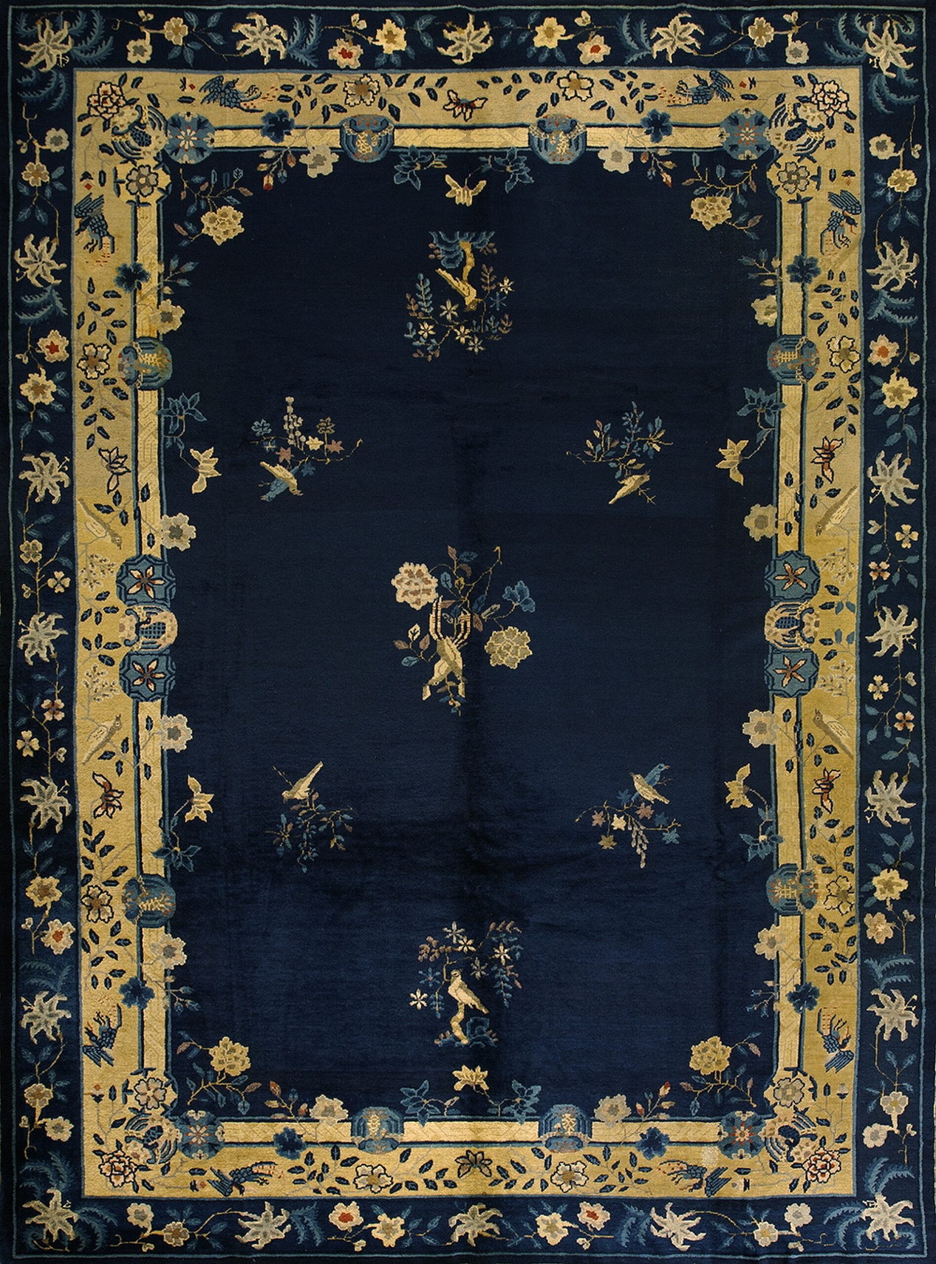 Antique Peking Chinese Floral Blue Navy, Camel 1920s Rug, Circa Date: 1920s. This exceptional example of early 20th-century Chinese weaving presents a dramatic contrast between its deeply saturated navy field and the luminous camel-toned border. The palette is characteristic of the refined designs produced in Peking during this era, appealing to collectors of fine antique rugs.
