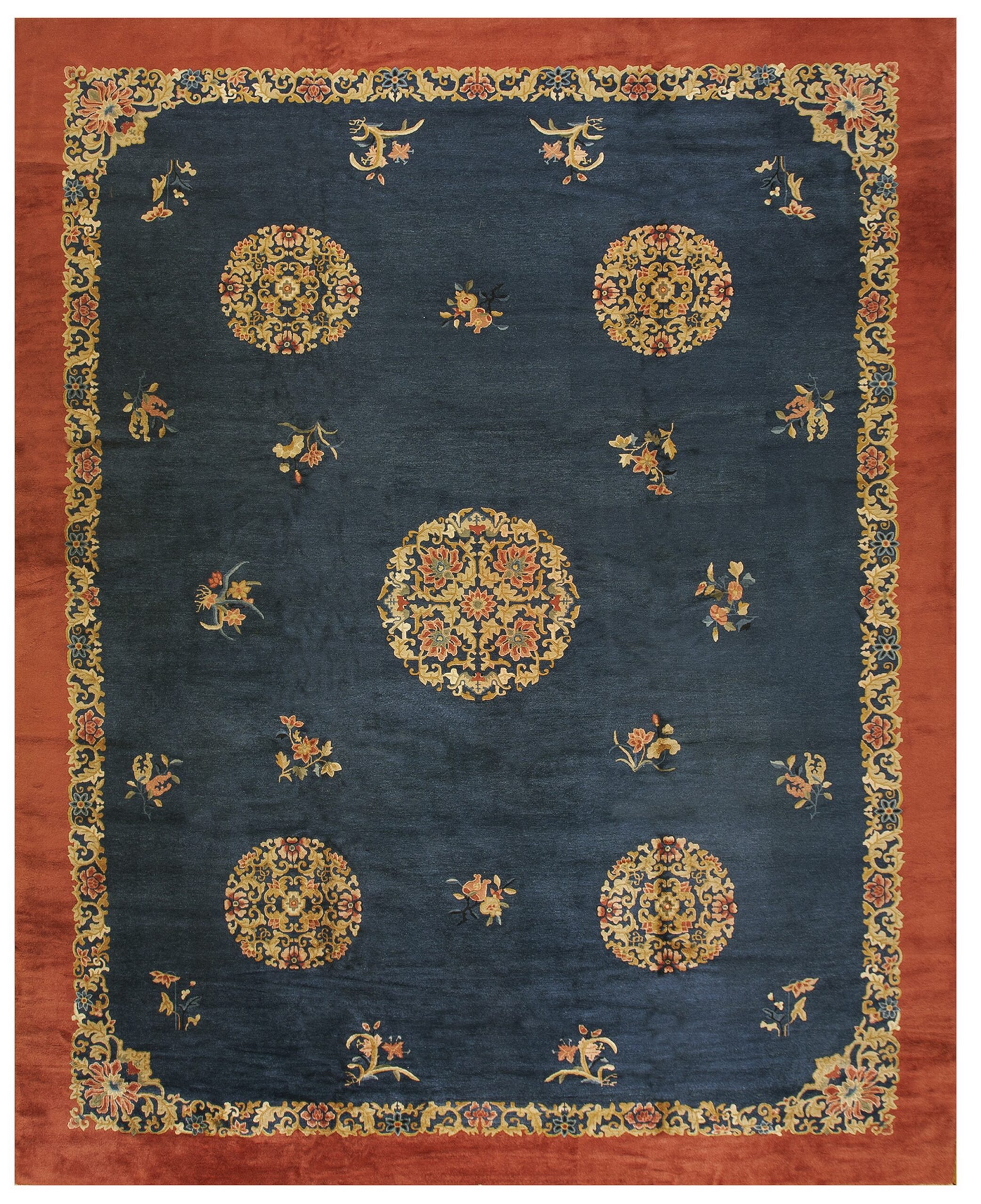 The expansive central field is rendered in a deep, lustrous indigo, a classic choice for high-quality Peking production. This rich, dark hue provides a dramatic contrast to the terracotta-red primary border, creating visual depth and emphasizing the rug’s generous scale. The use of such a pronounced blue color rugs field allows the scattered floral sprays to appear almost illuminated against the depth of the pile.