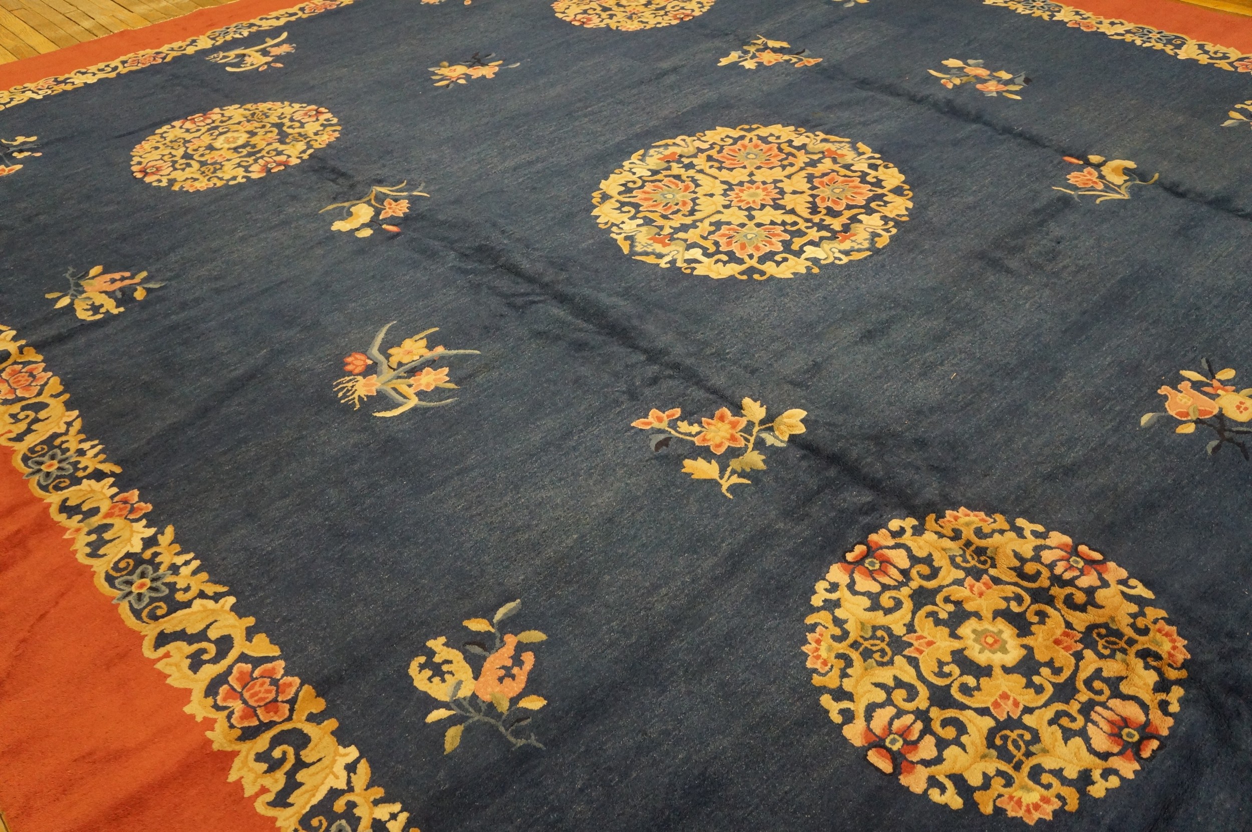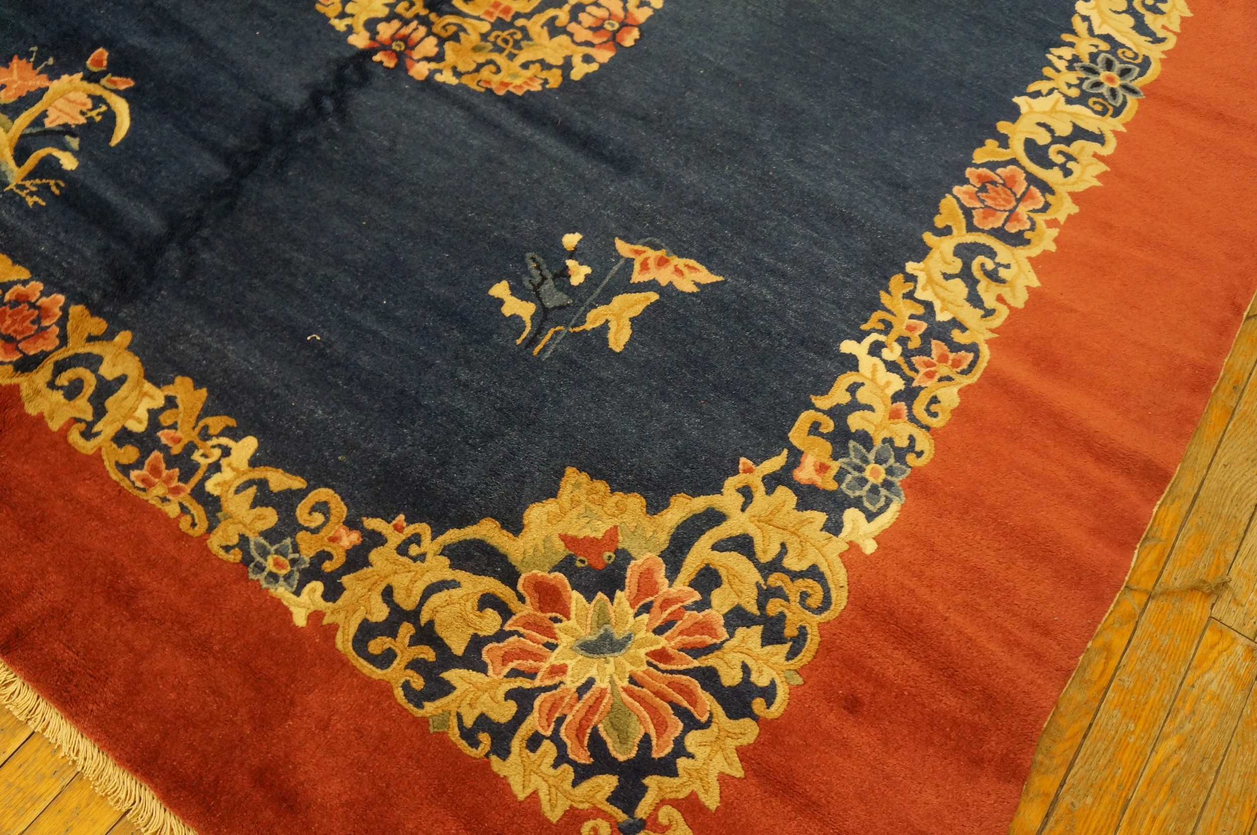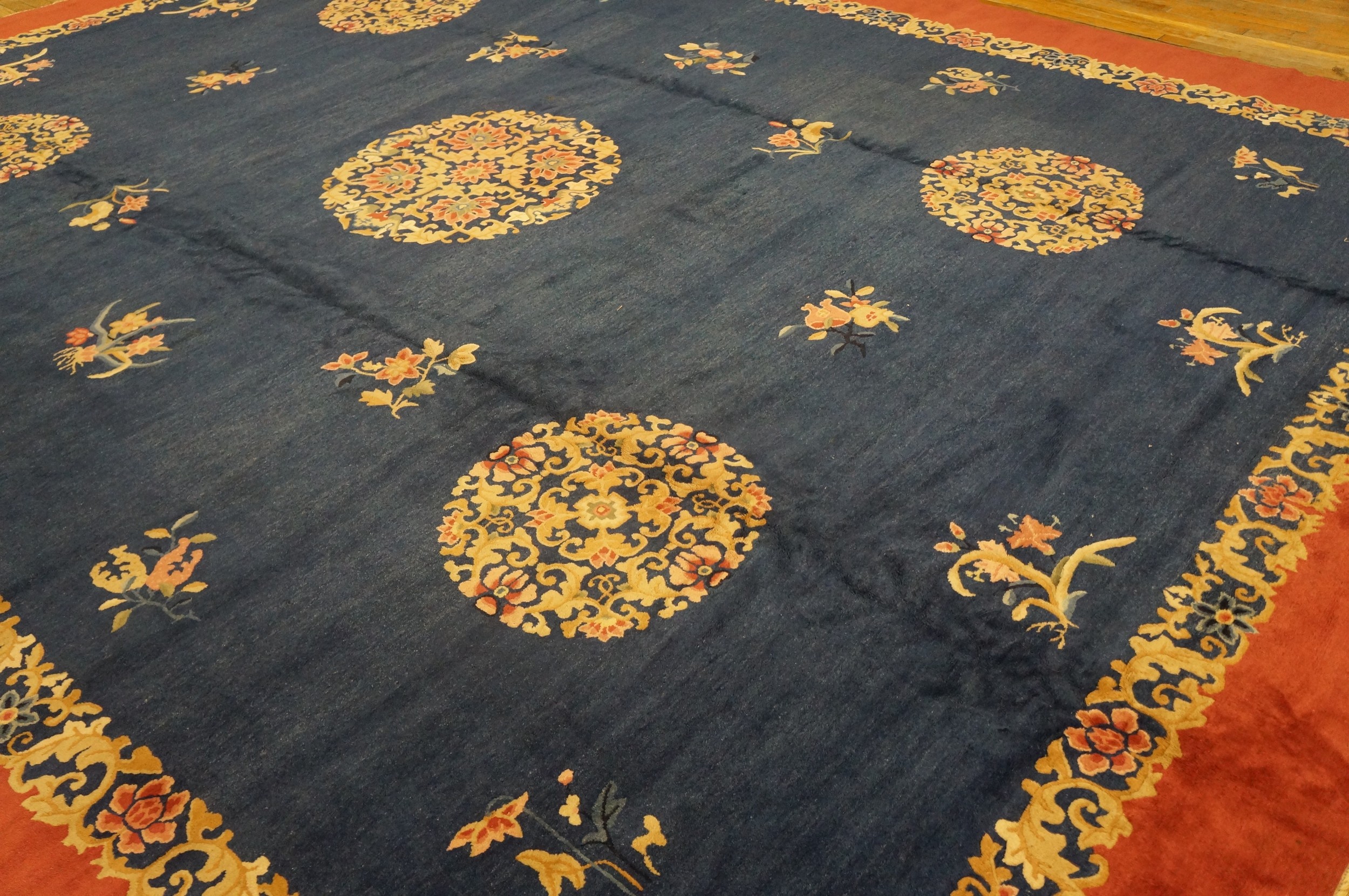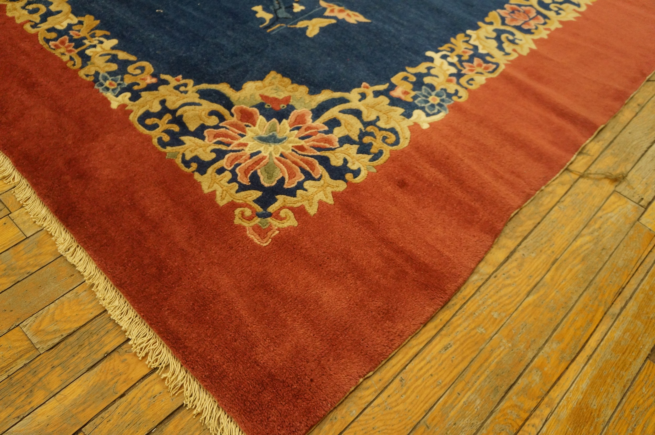 Measuring generously, this piece functions perfectly as a room size rugs, capable of defining a primary living space or formal dining area. Its exceptional condition and vibrant, yet refined, color scheme ensure that this 1930s Peking rug remains a timeless statement piece, bridging traditional artistry with modern interior design sensibilities.