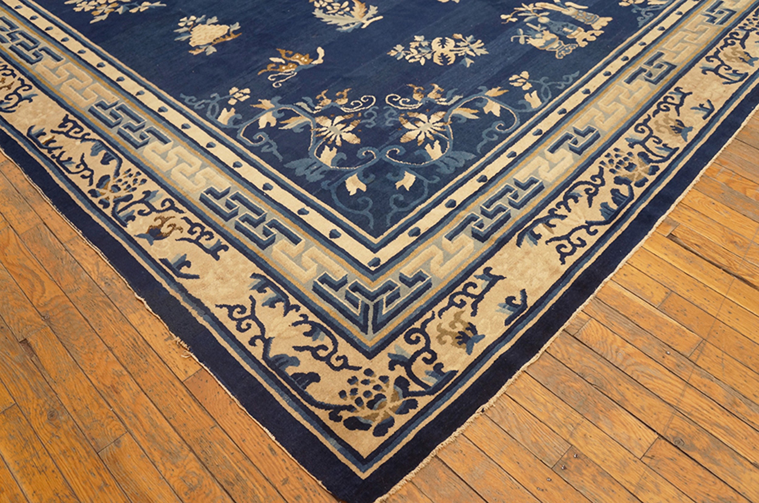 Antique Peking Chinese Floral, Geometric Knotted Rug, Circa Date: 1900s. This exquisite example of early 20th-century Chinese weaving represents the pinnacle of the Peking style, known for its refined palette and balanced composition. It is a stunning piece among our collection of antique rugs.
